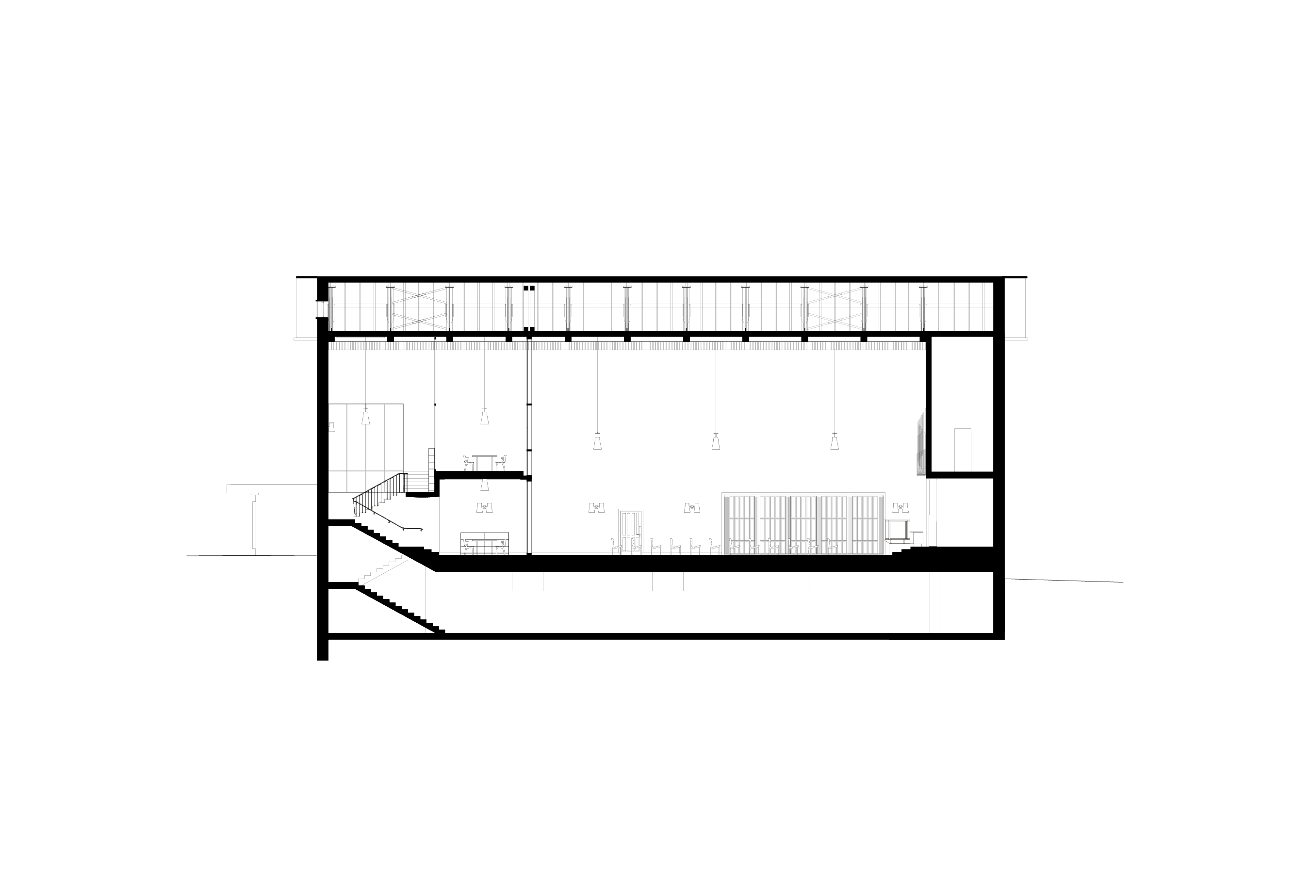 Designed for a competition, the spatial extension connects as a 5-metre-wide space to the existing gallery. This new addition appears as a large piece of wooden furniture that rests, as a room cushion, against the original stone structure. The design further introduces a layer of cupboards in a kitchenette and precisely positioned stairs, frames, and an enclosed meeting box for private discussions. Upon entering this intimate, box-like space, visitors are welcomed by an ambiance of an archaic dwelling. A generously sized skylight carved into the gable spatially references the exterior.