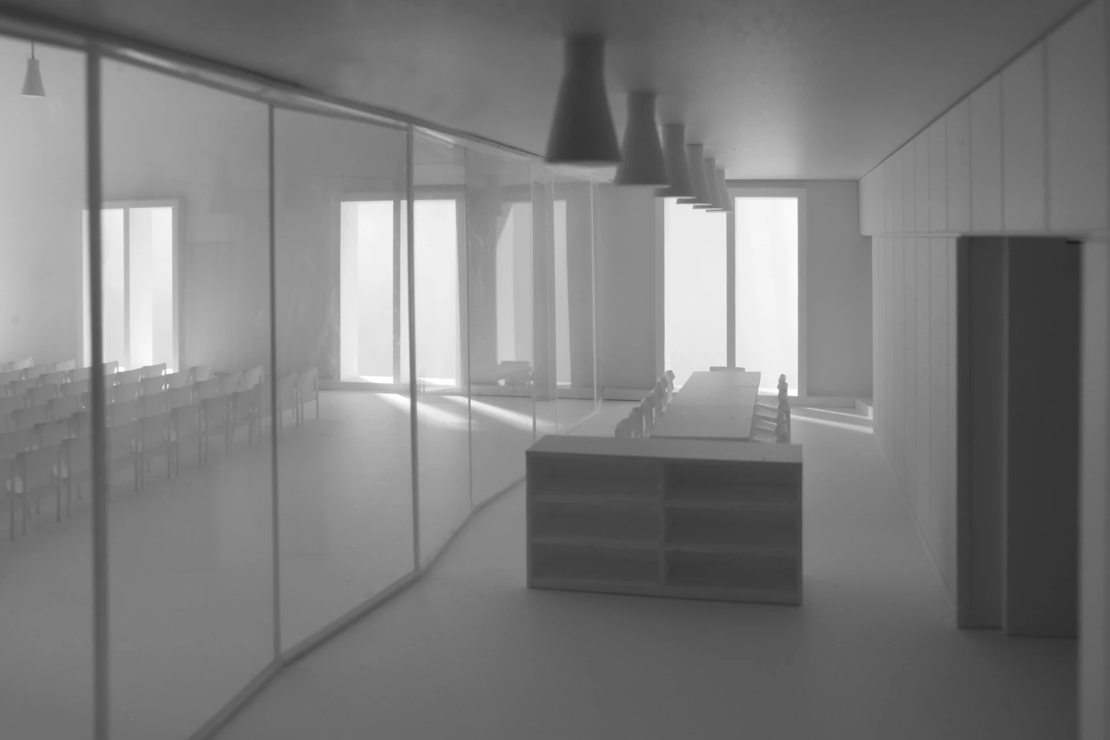 Eine räumliche Erweiterung dockt als fünf Meter breite Raumschicht an die bestehende Empore an. Konzeptionell erscheint der Einbau als grosses hölzernes Möbel, das sich als Raumkissen auf die vorhandene steinerne Struktur legt und mit einer Schrankschicht im Bereich der Teeküche eine Verbindung zum Boden herstellt. Treppen, Regale und eine Meetingbox für vertrauliche Gespräche sind darin integriert. Betreten die Besuchenden diese intim anmutende Box, offenbart sich ihnen ein kleines, archaisches Haus. Ein grosses, in den Giebel eingeschnittenes Oberlicht schafft einen räumlichen Bezug zum Umraum. Betreten die Besuchenden die intim anmutende Box, offenbart sich ihnen im Inneren ein archaisches Haus. Ein grosses in den Giebel eingeschnittenes Oberlicht schafft einen räumlichen Bezug in den Umraum.
