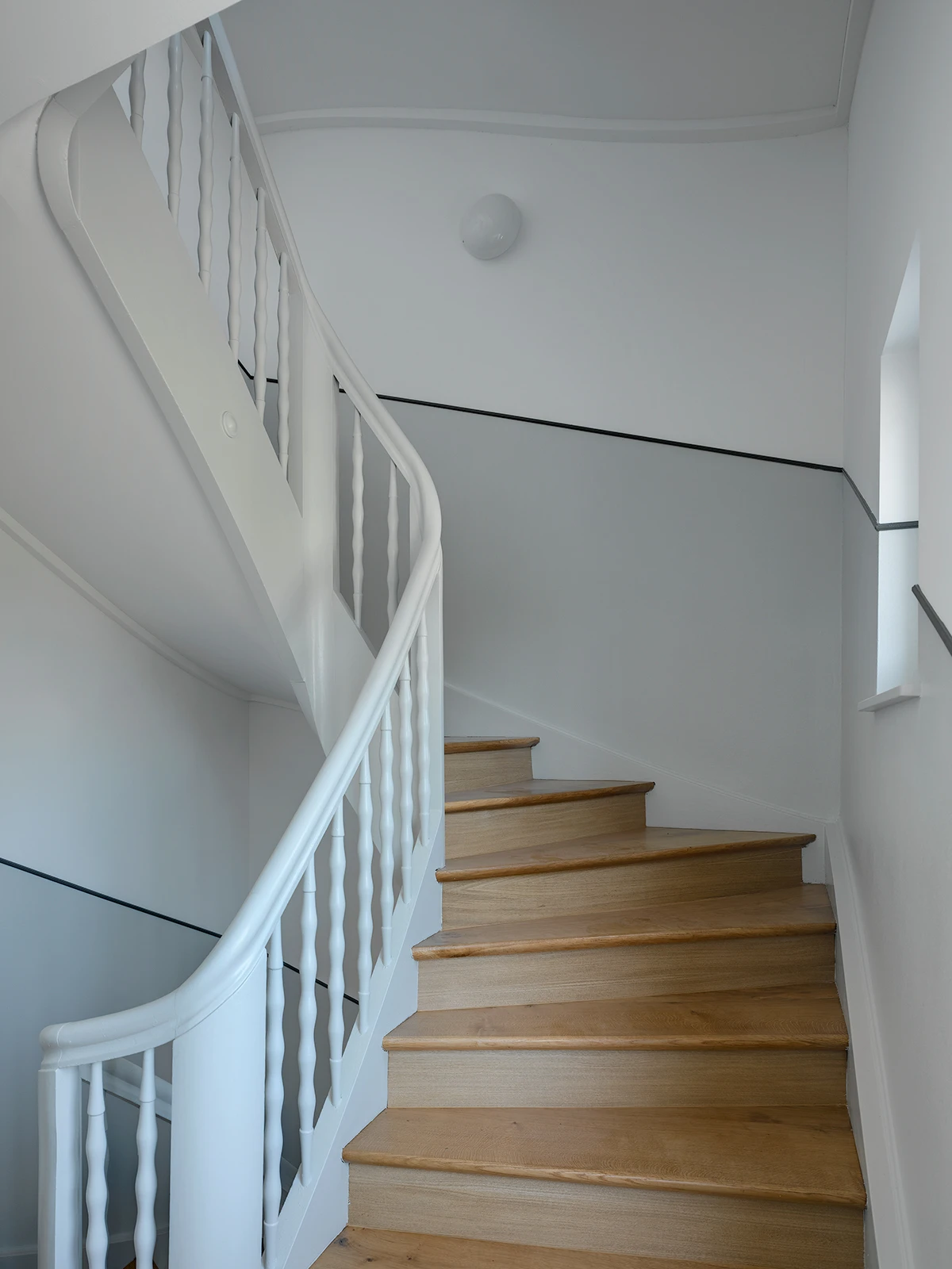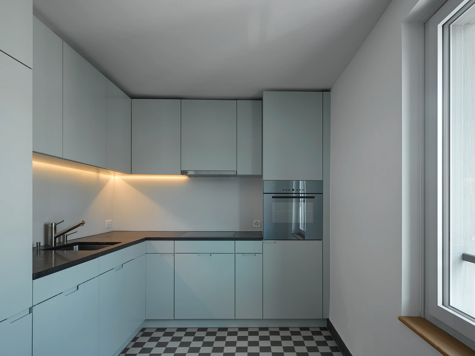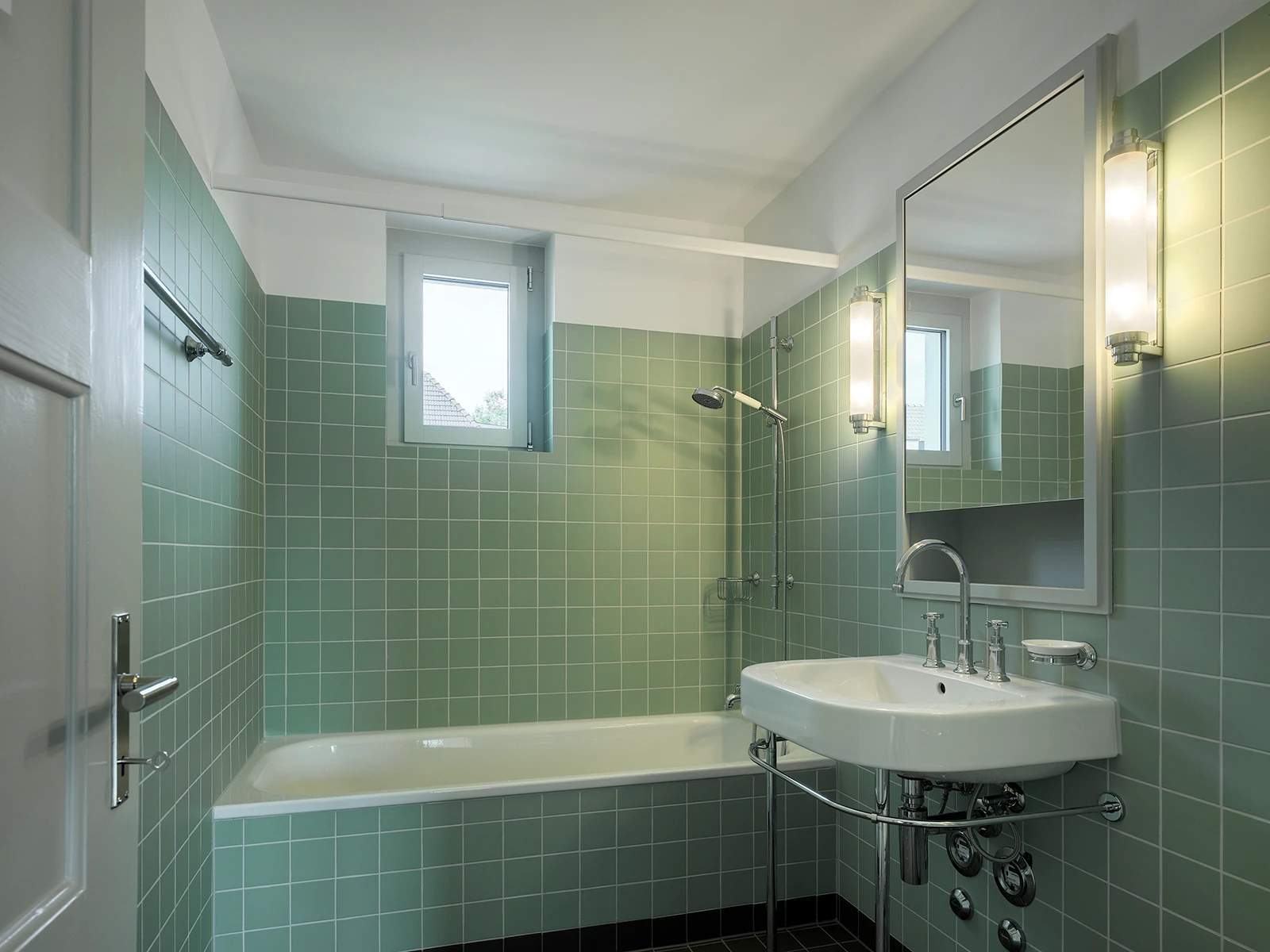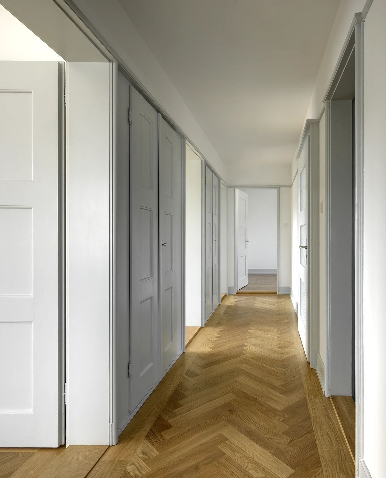 A residential building on Birchstrasse, built in 1921, is part of a larger neighborhood development on the edge of Oerlikon. Four residential units have been renovated to meet today’s living standards. New sound absorption was built in to improve the acoustics in the apartments, while the careful renovation of the bathrooms and kitchens involved choosing colors and materials that reference the style of the building’s era.