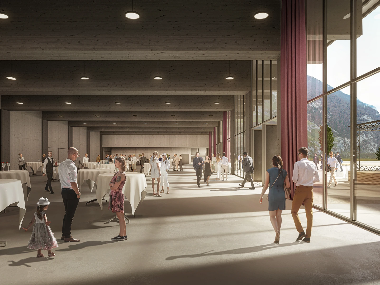 The new trade fair and event hall at the Obere Au location in Chur is located in a tranquil, natural setting, between extensive recreational facilities for various sports activities and a long public park adjacent to the motorway. Along the western perimeter, the renaturalized Mühlbach stream forms an organic boundary. The new trade fair and event hall stands out as a distinctively updated structure in urban planning, yet fully complements the public facilities and is clearly oriented towards the trade fair and event square in its expression. Housed together under a large square roof, the various hall areas are compactly organized in a coherent sequence.