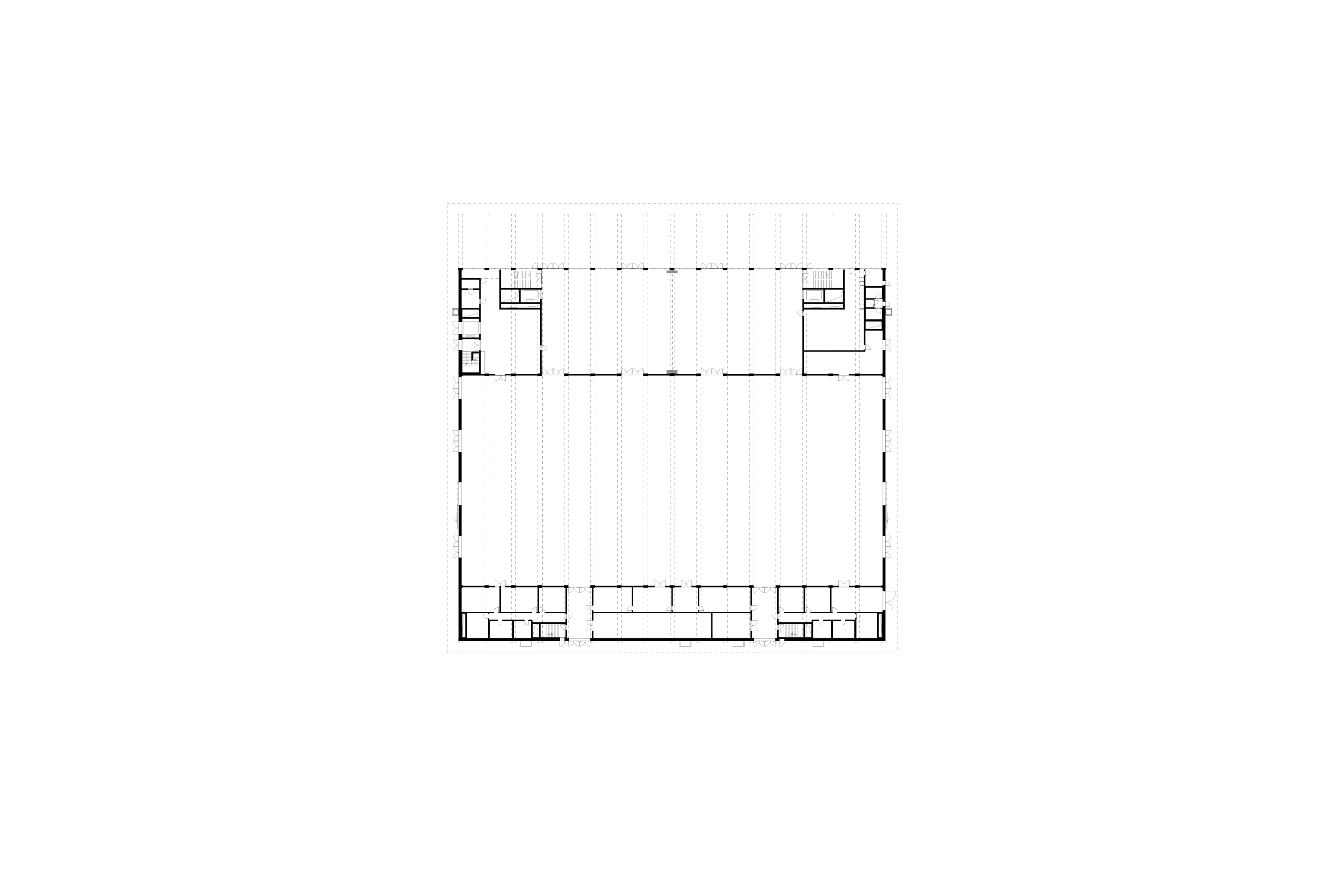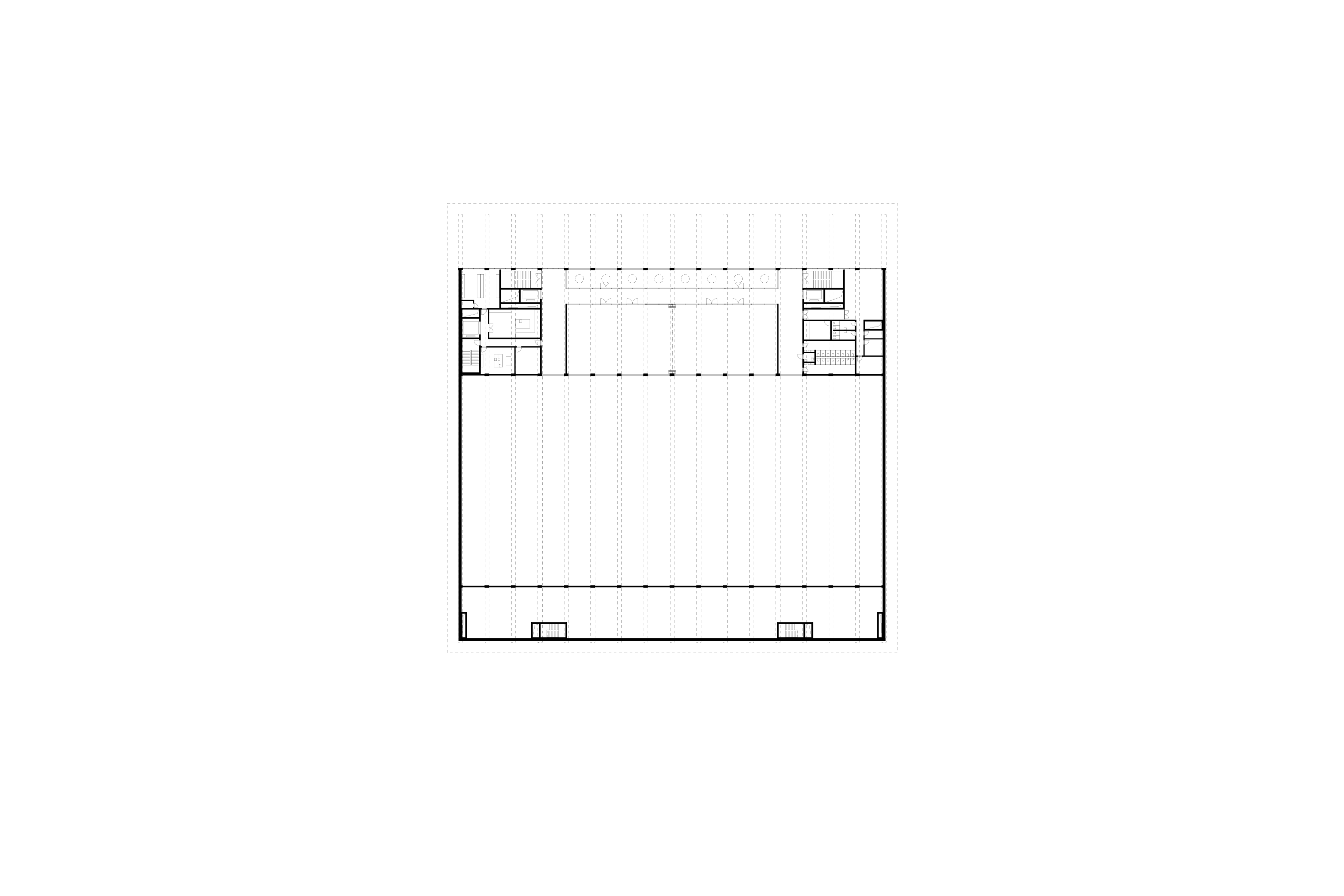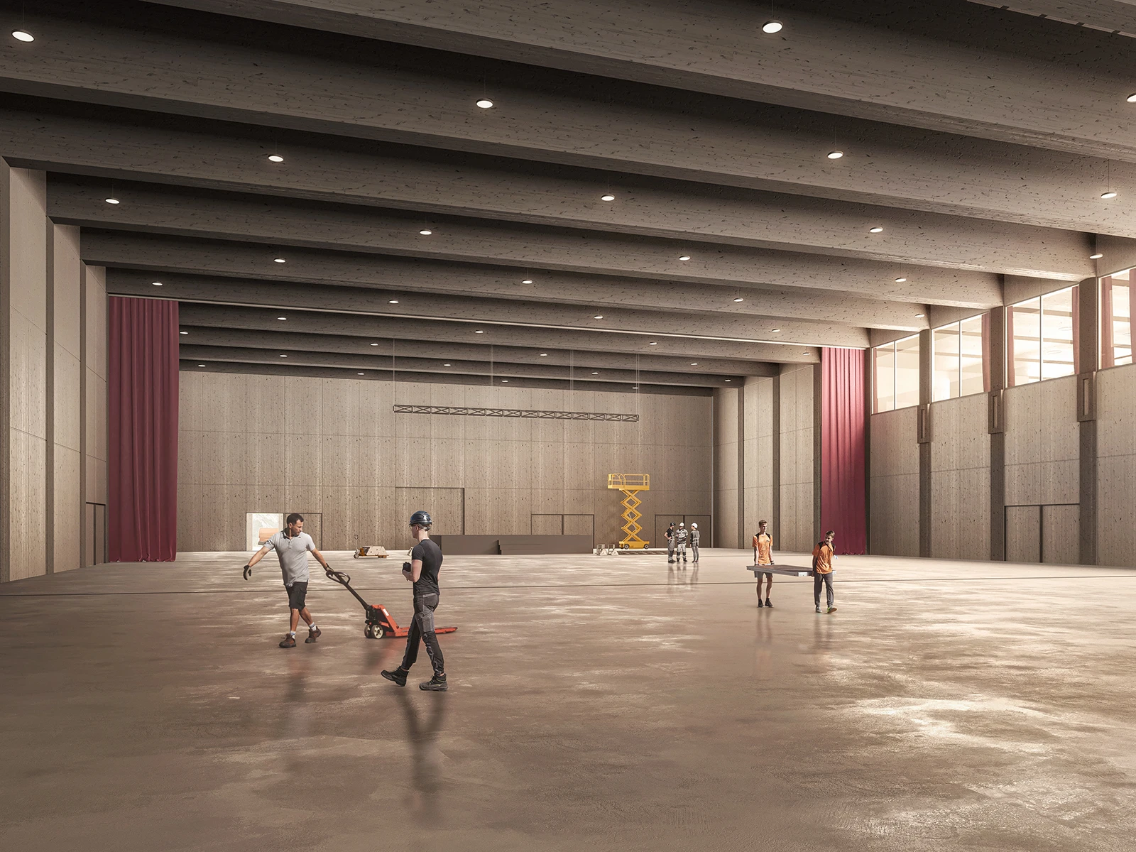 From the main square, visitors will arrive at the entrance to the building which is found under a generously projecting roof that creates a covered outdoor space. Upon entering, one encounters the naturally lit foyer, which serves as the core between each individual hall area. The immense foyer sits in the center and is discreetly but functionally surrounded by the other areas which serve necessary spatial functions. These other ancillary areas are organized in two peripheral access and functional zones. The generous loft on the upper floor allows cross-references to the main hall and a view of the large trade fair and event square via a balcony. It is accessible from the staircases which are visible from the outside. The large underground parking garage can be accessed at any time from the exterior.