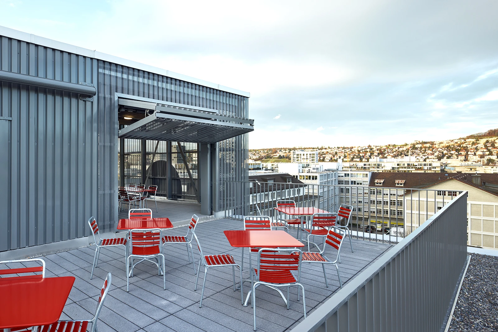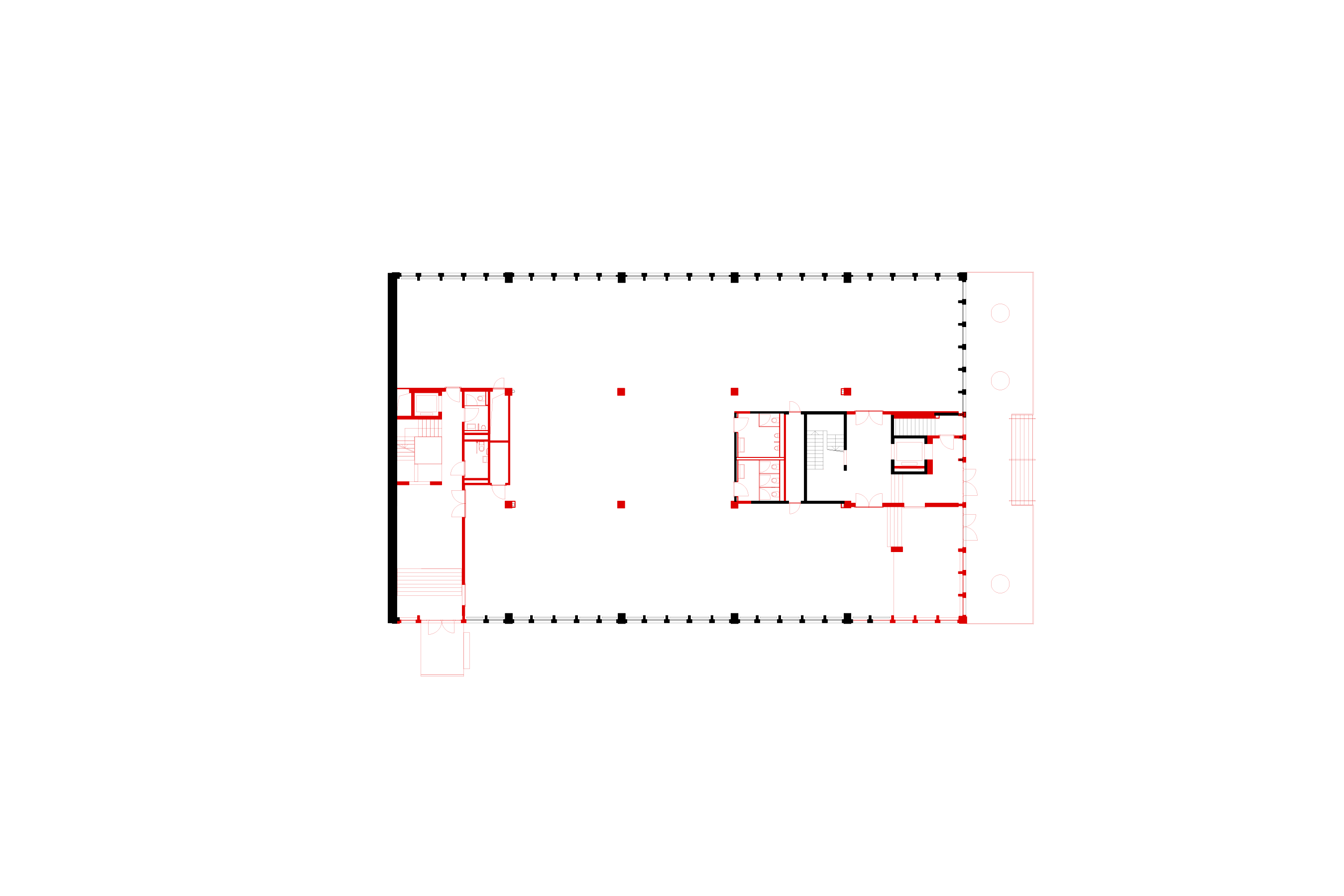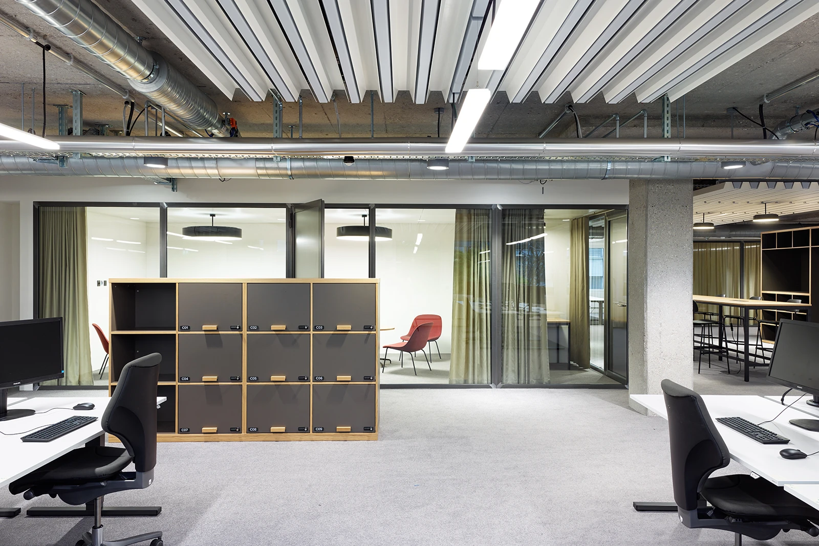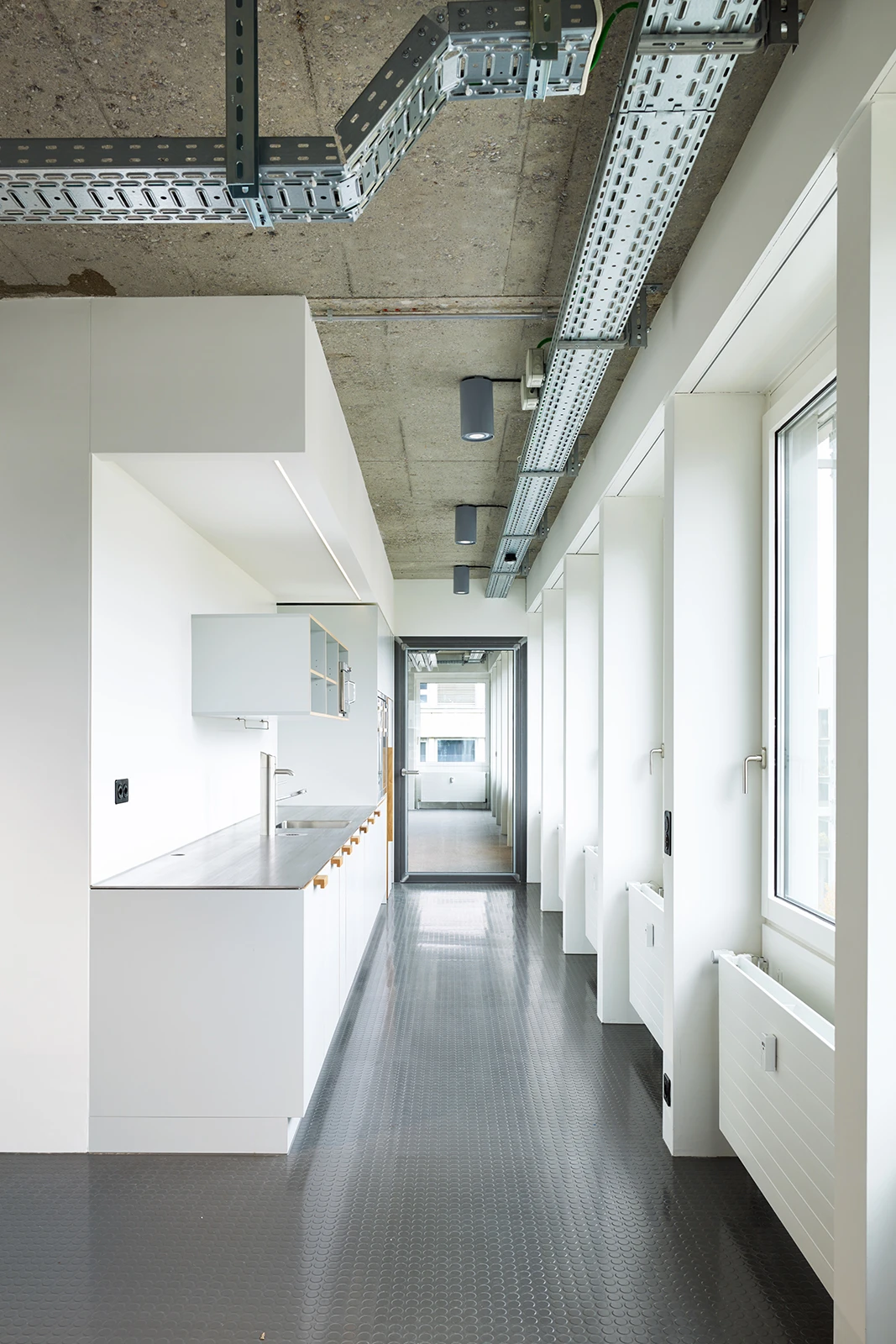 To accommodate creative professionals, the strategy for this adaptive re-use into an office and studio framework named "Creative Hub" repairs the existing spaces by stripping away double floors, suspended ceilings, and partition walls. The renovation results in a highly refined shell that maintains a perceptible stylistic relationship to its former identity as an industrial repository. It has an updated material palette along with new access points, sanitary facilities, vertical circulation zones, rooftop meeting spaces, and a dedicated emergency exit to Flurstrasse. The building's facade remains largely untouched, save for subtle enhancements such as the introduction of textile sun blinds.