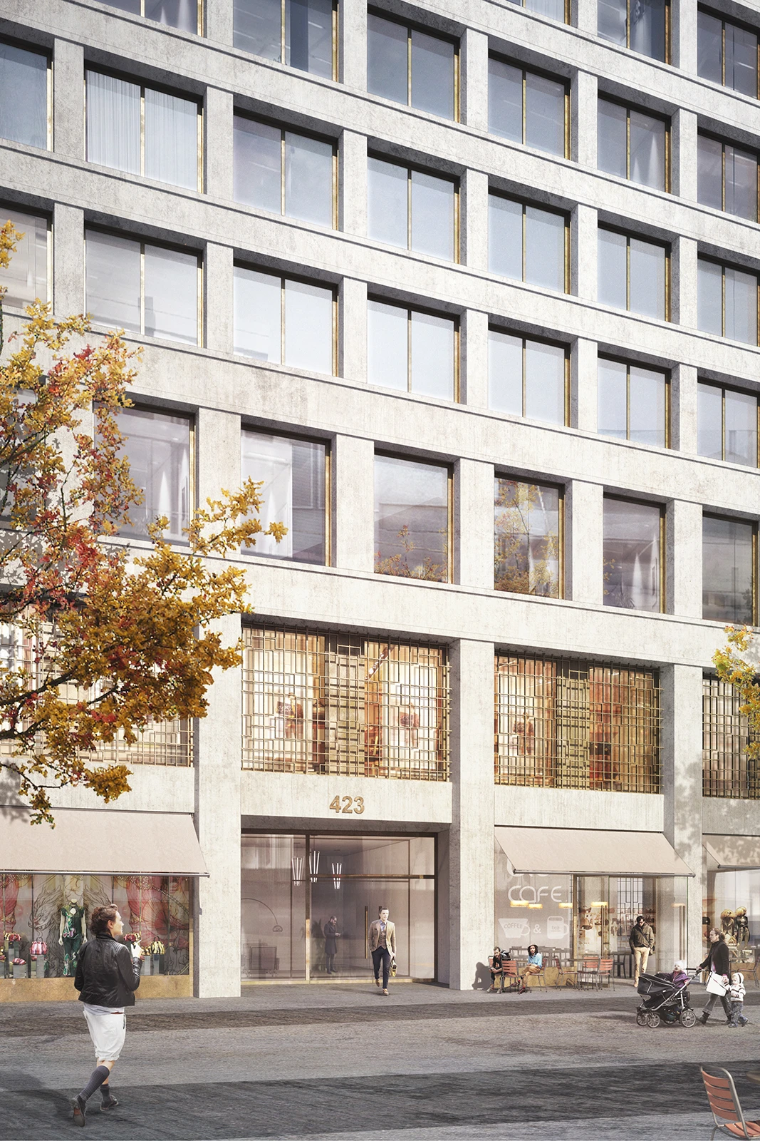 Facing the tracks, the proposed building is composed of a foundational base, a main building above, and a smaller protruding volume closer to the station. The façade’s clear division and strict grid reference the adjacent buildings, notably the “Sihlpost,” the primary post office in Zurich.