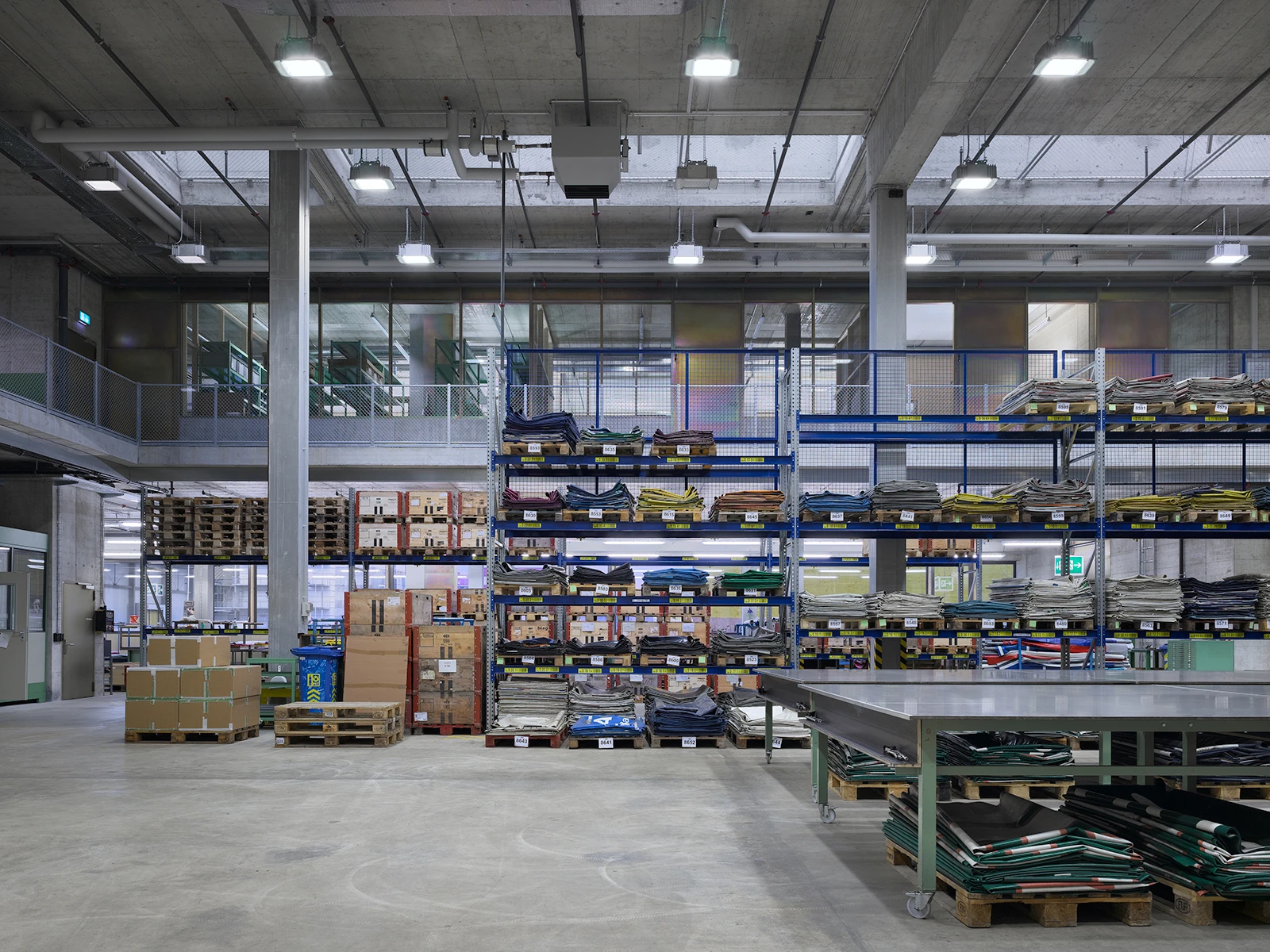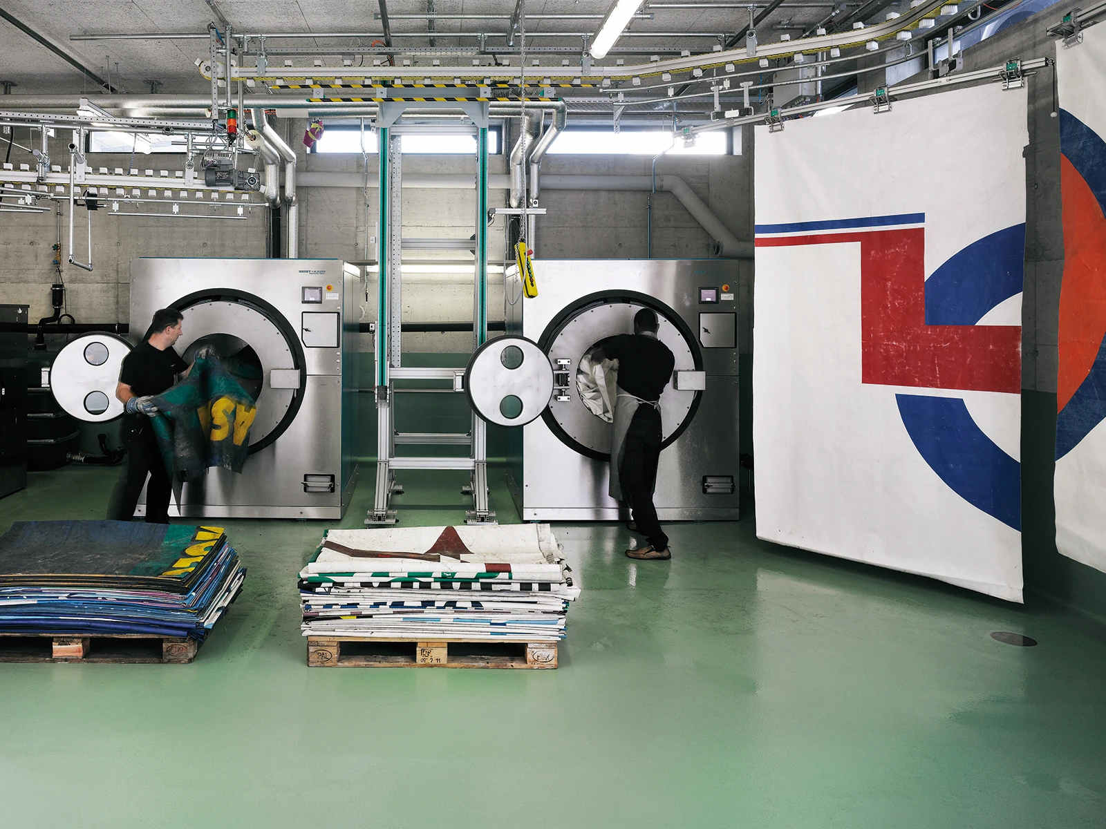 The Freitag factory in Zurich-Oerlikon is housed in the Noerd commercial building designed by Rothen Architektur in 2010. Featuring production facilities and design studios, as well as logistics and administration, the floor, 10’000-square-meter space accommodates over 120 employees. The facility also includes a staff canteen and a factory shop. The heart of production is the newly developed, eco-friendly rainwater-powered industrial washroom in the basement.