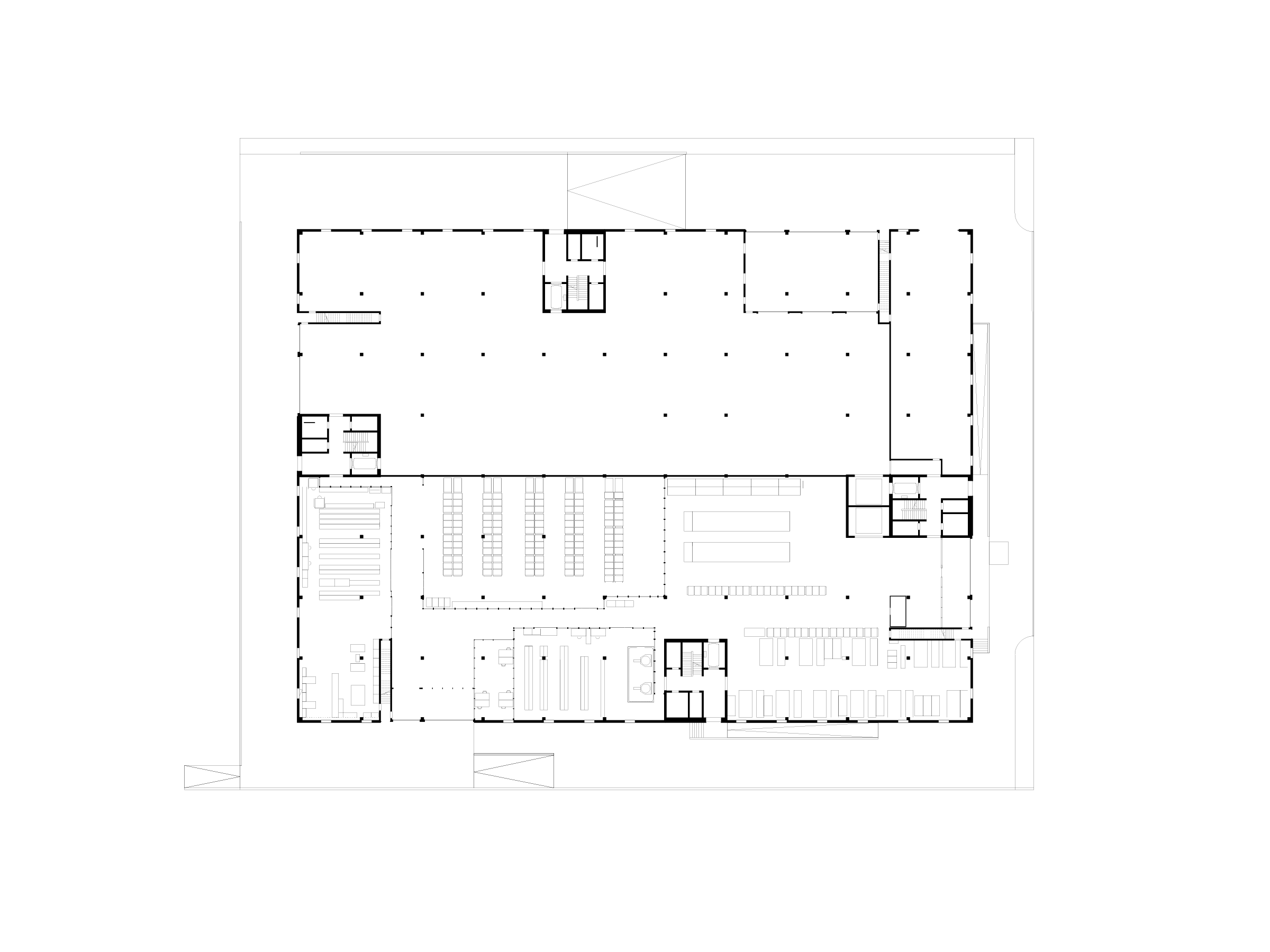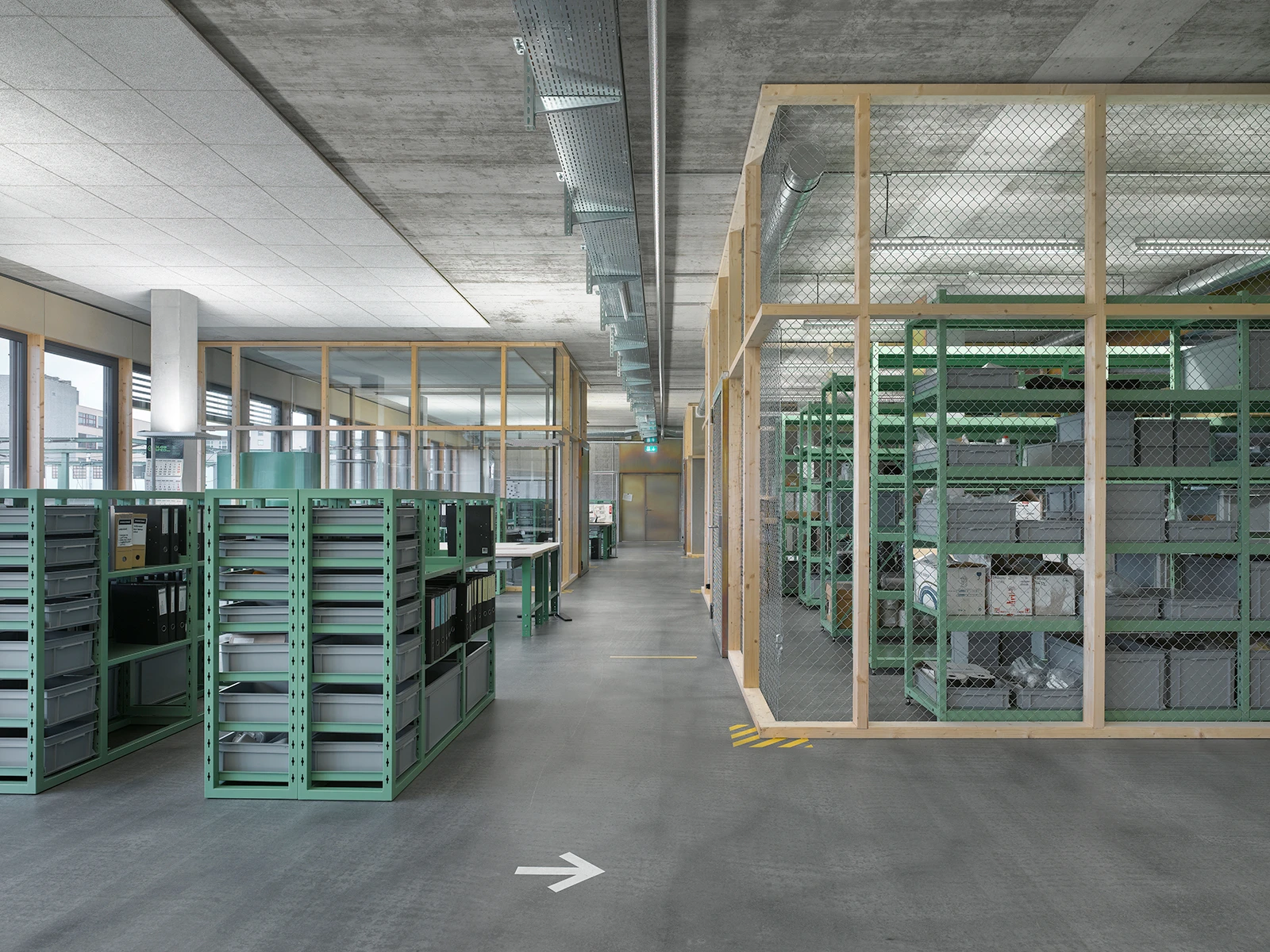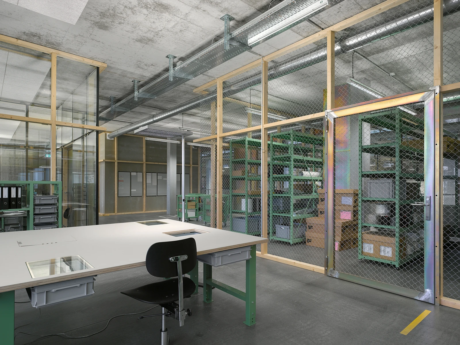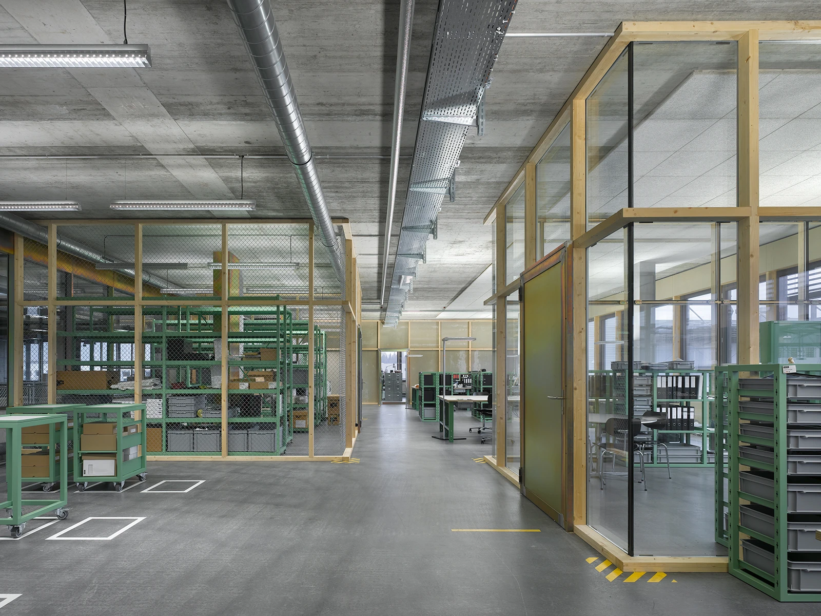The central high-ceilinged hall houses cutting stations as well as control and logistics centers. A mezzanine level with offices has been superimposed in this large space. The upper floors contain development and administration offices, alongside a roof canteen and a factory shop. Simple timber-frame fixtures divide the large, unfinished space, adding a sense of spatial tension.