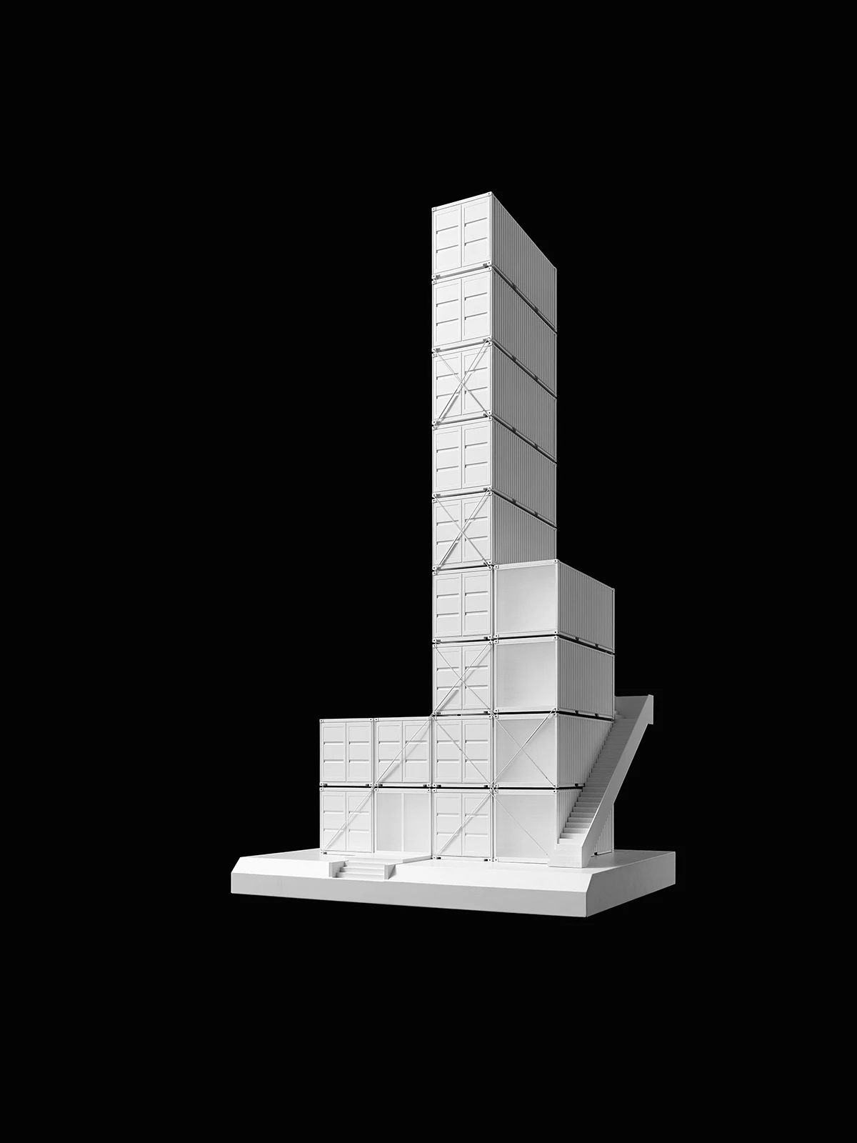 The standardised 20-foot shipping container is transformed into a building block for an architectural intervention. A stepped tower rises 9 units up from a 4 x 2-unit base.