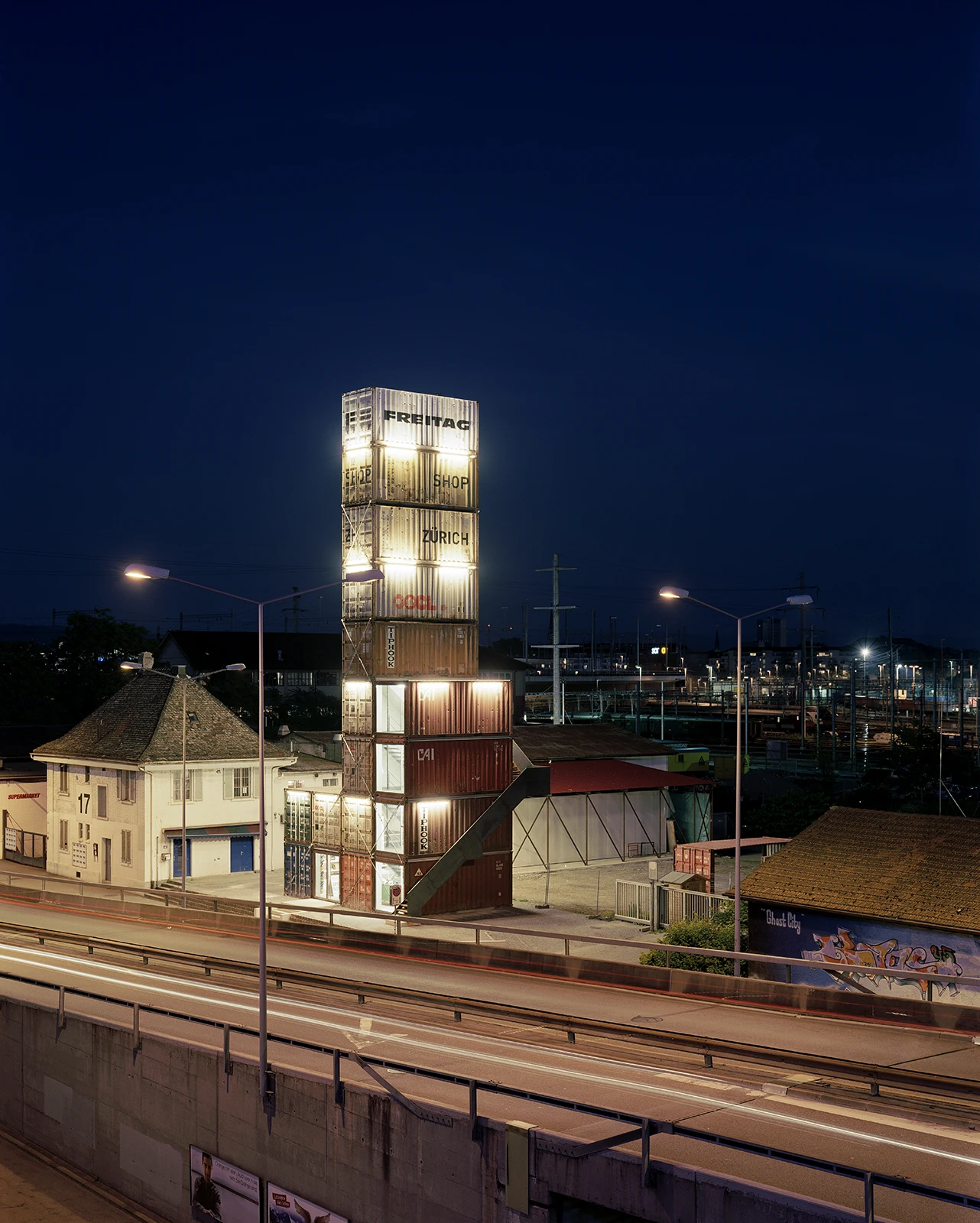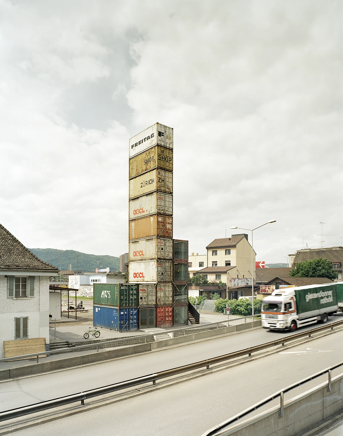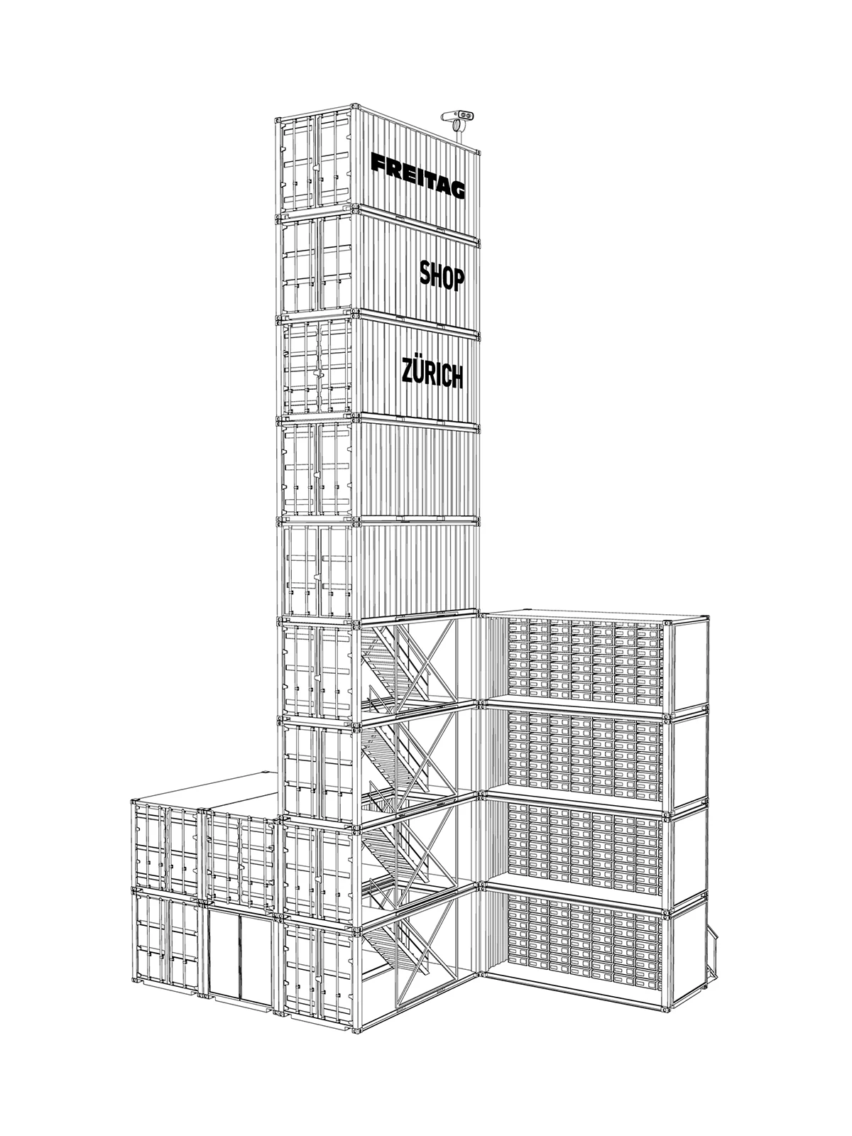 Originally built from 17 units with a subsequent extension of the shop by 2 lateral modules, today 19 refurbished overseas containers form the Freitag Flagship Store. The containers were sourced in Hamburg and transported by rail to Zurich. The stacking of the units is based on their original design logic: only connecting elements from the shipping industry are used, thus ensuring simple dismantling.