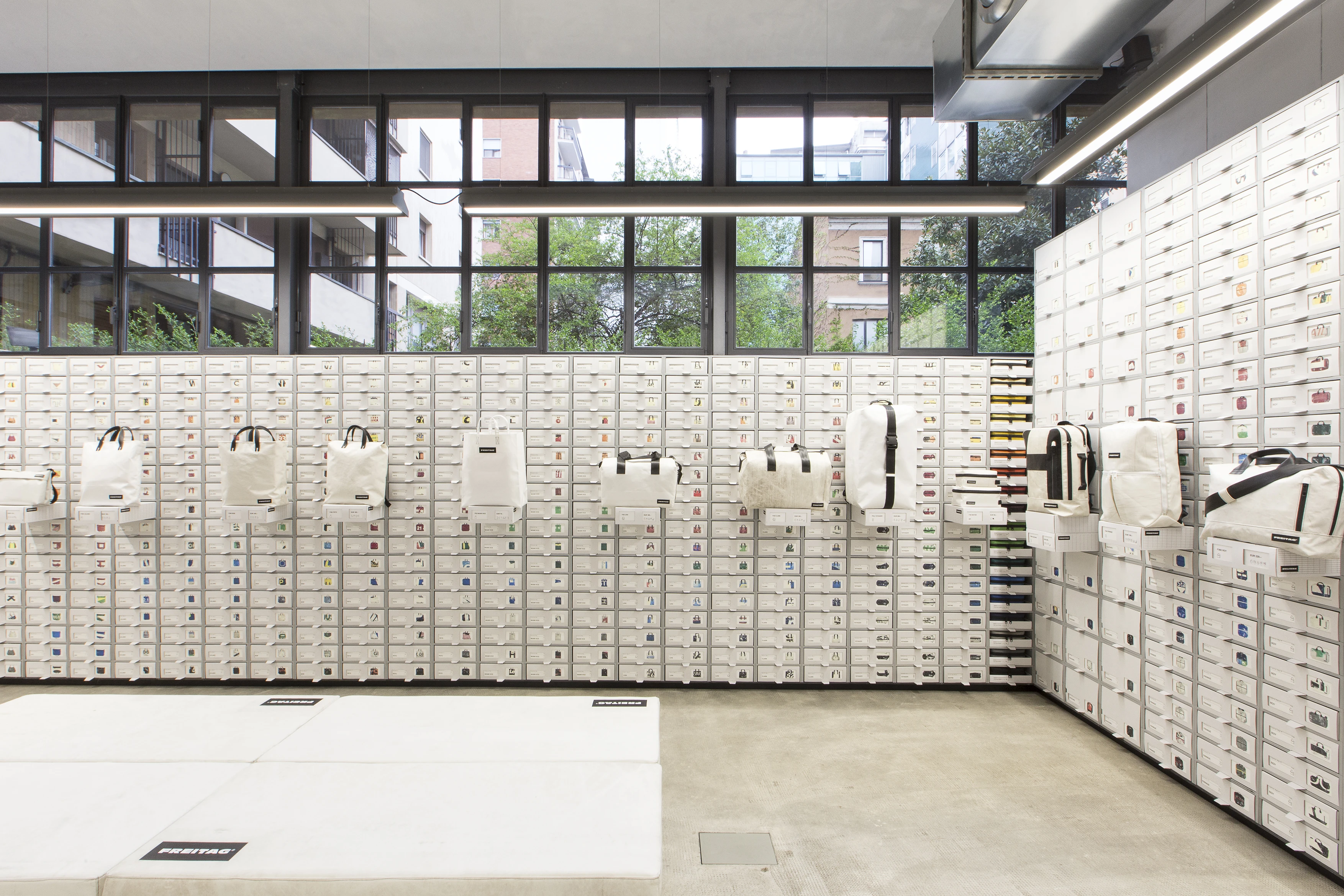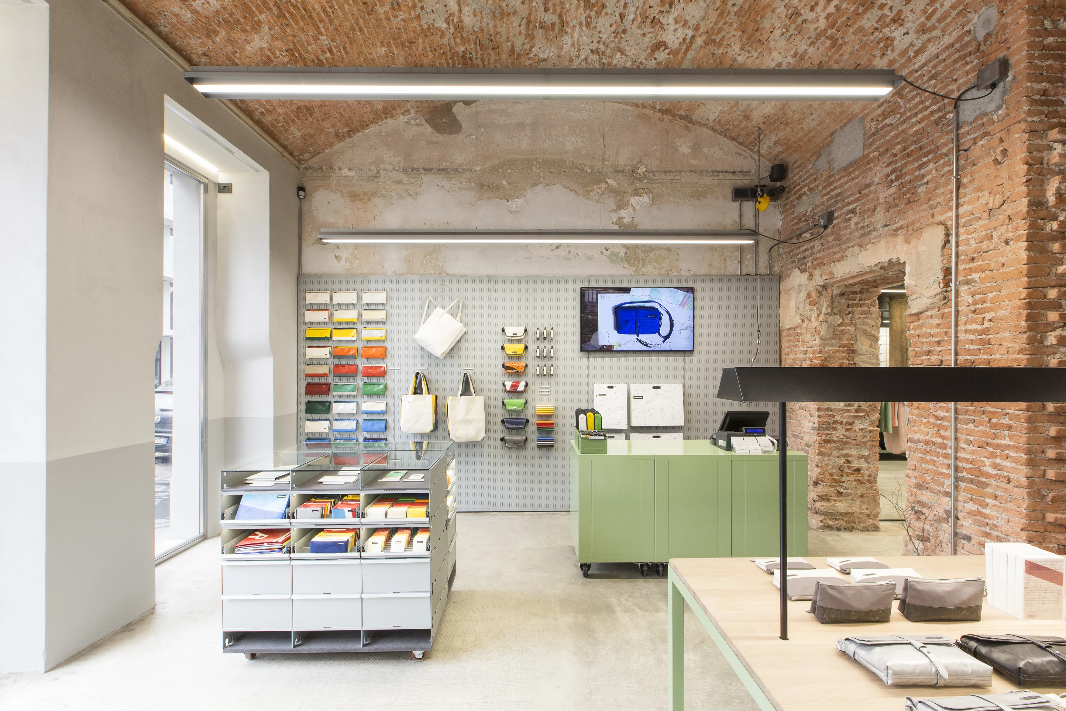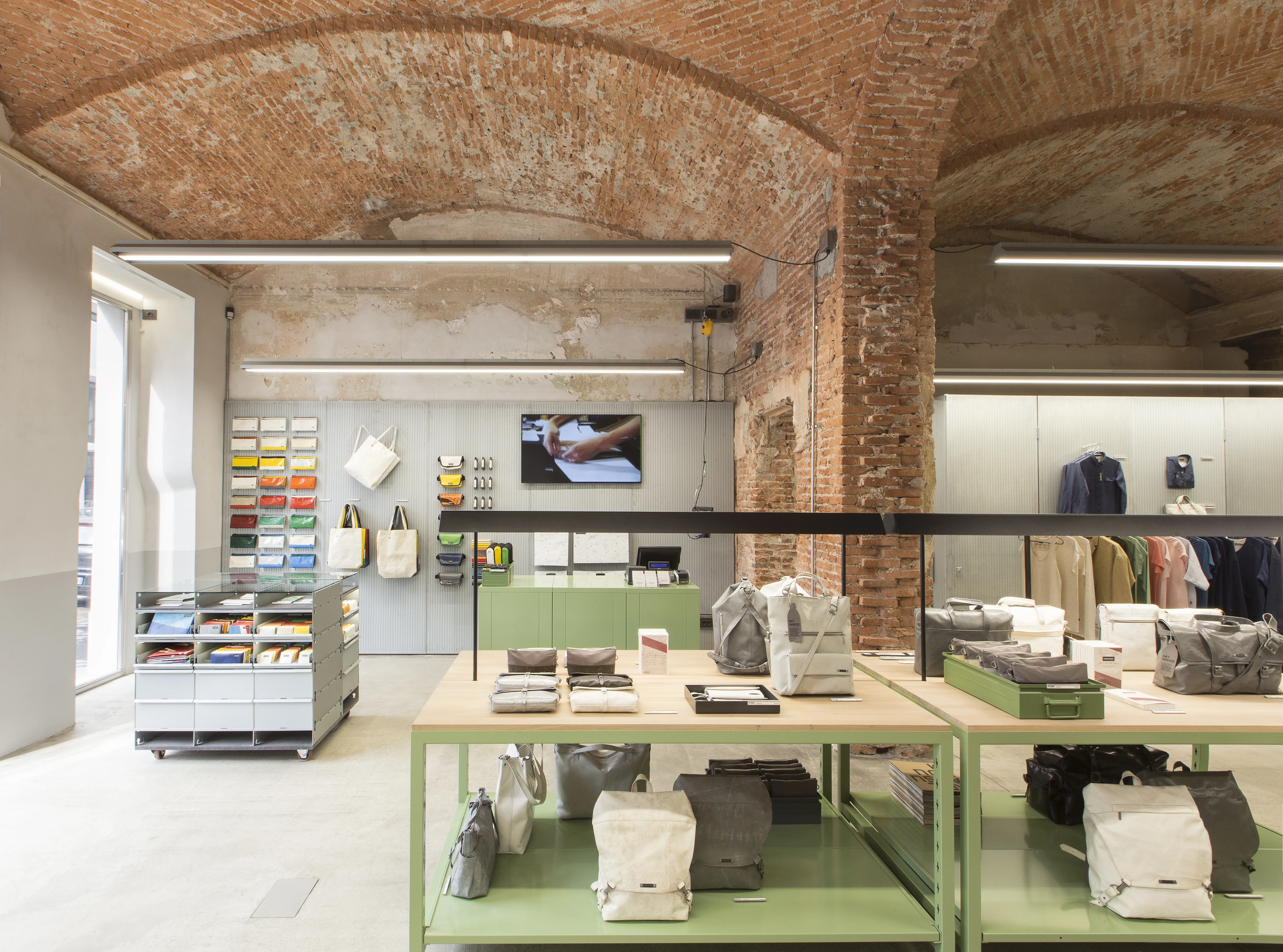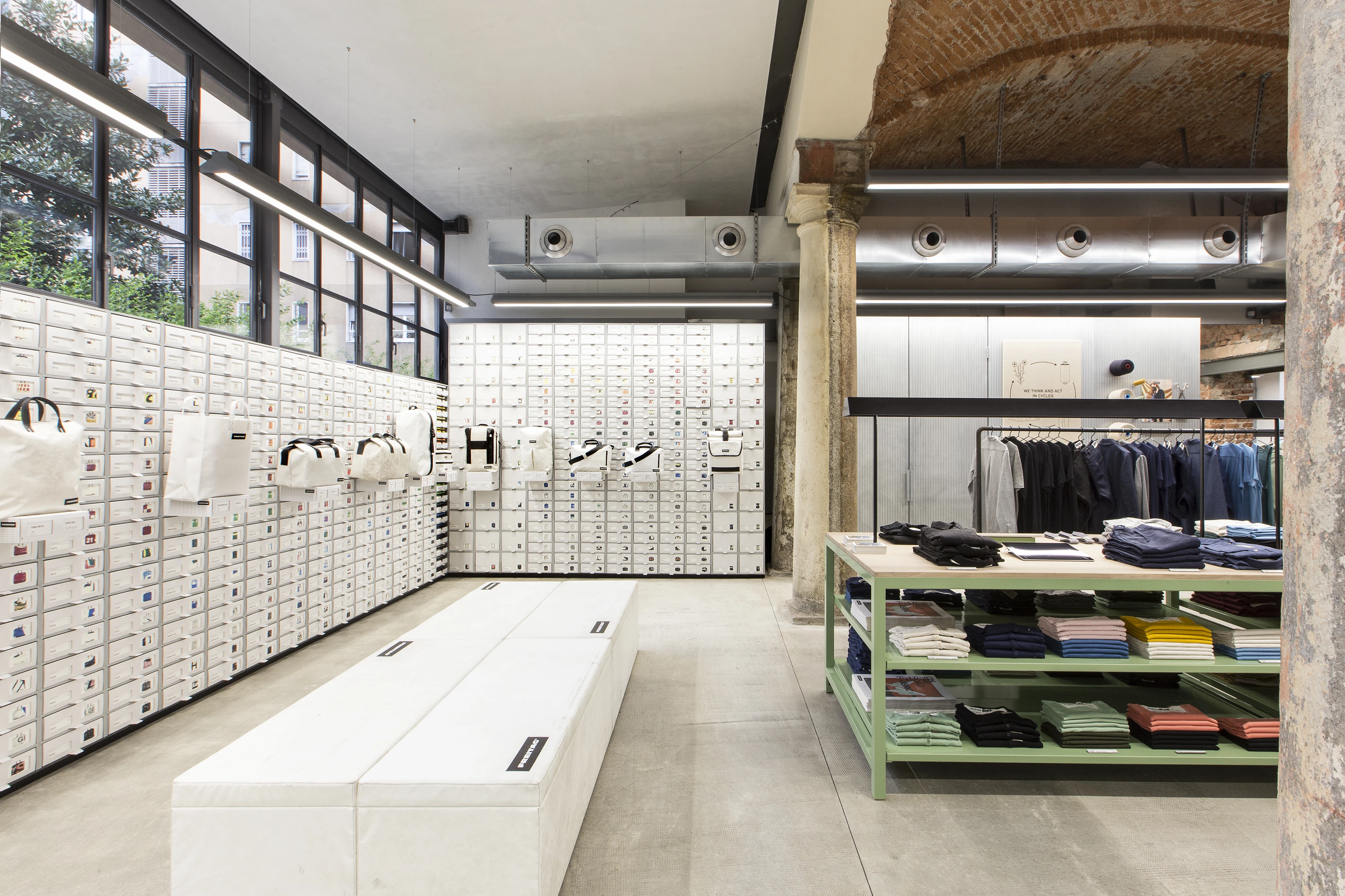 After a years-long, extensive search for a new location for the FREITAG store in Milan, an ideal match for predefined criteria such as size, location, and structural conditions was finally identified. For the first time, this store consolidates FREITAG's comprehensive offerings in one unified space: its established range of bags, displayed via its custom-designed V30 shelves, and its complete line of "Fabric" clothing, including the popular "Reference" collection.