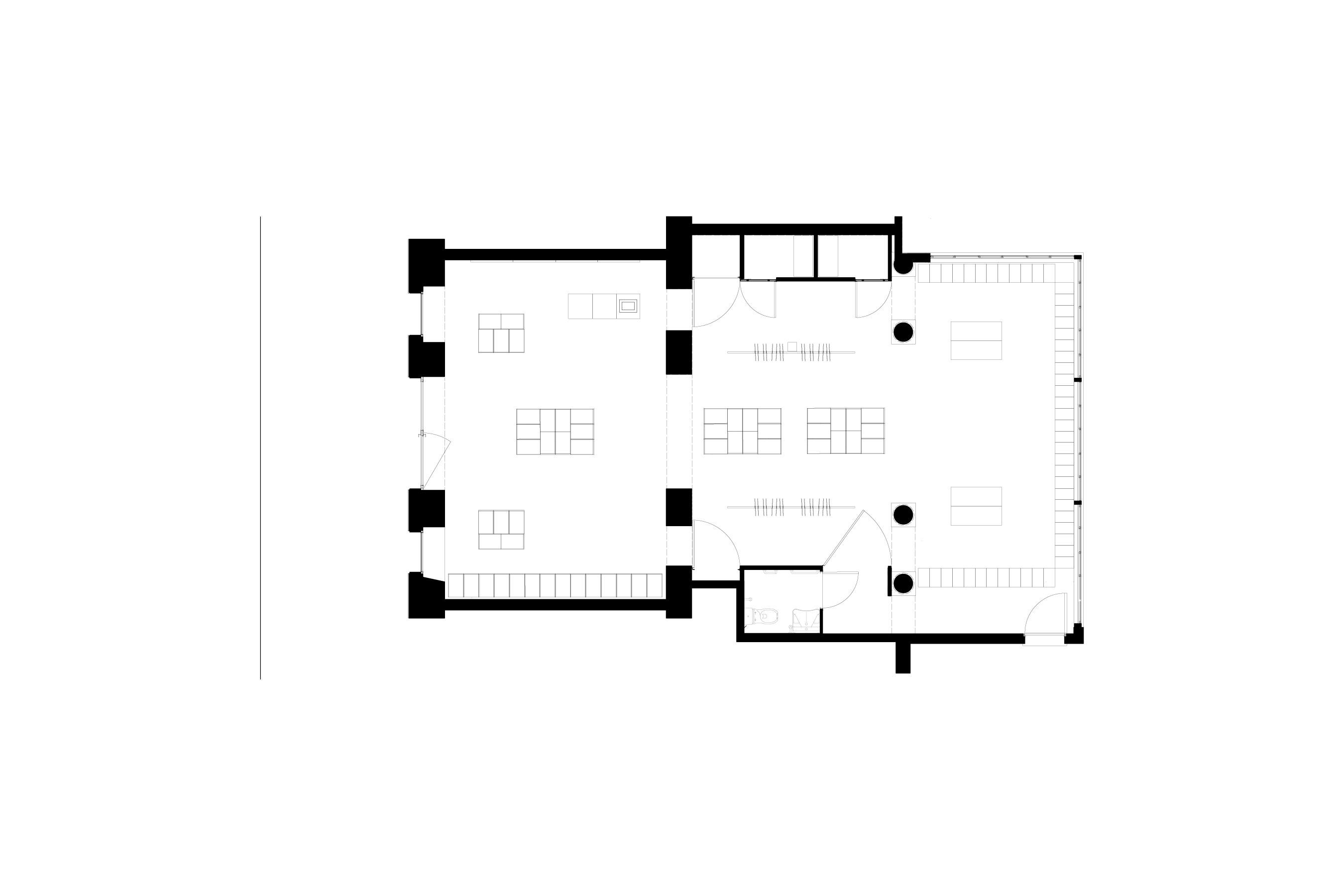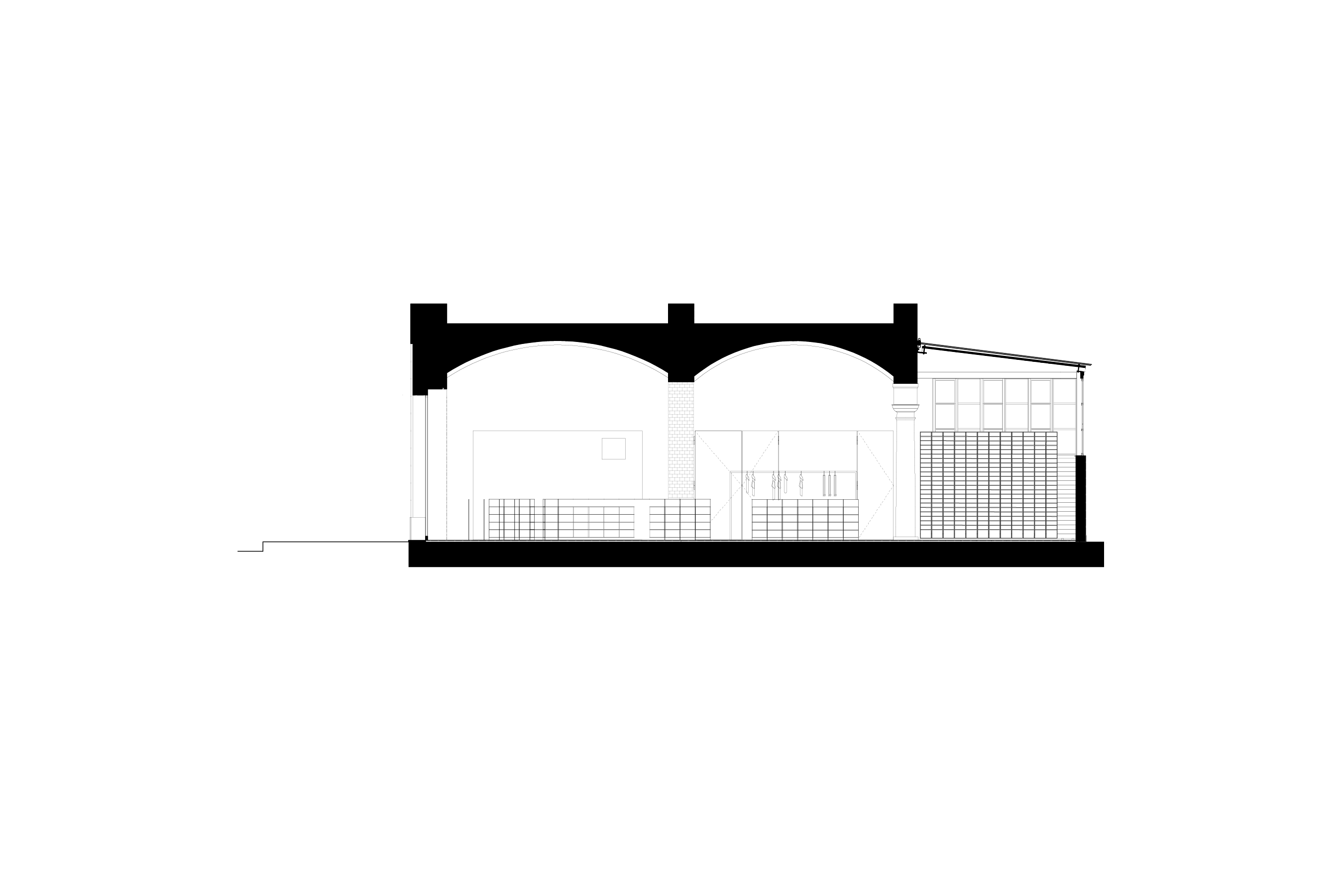 Visitors of the FREITAG store enter through an understated and simple storefront to find themselves beneath a sequence of three arches characteristic of industrial annexes to reach the green courtyard. The area retains traces of time and use in a raw authenticity evident in its columns and walls, maintaining connections with its previous program as a space for cooking and dining. Unaltered, original structural features define the store's conditions, revealing glimpses of its history upon closer inspection.