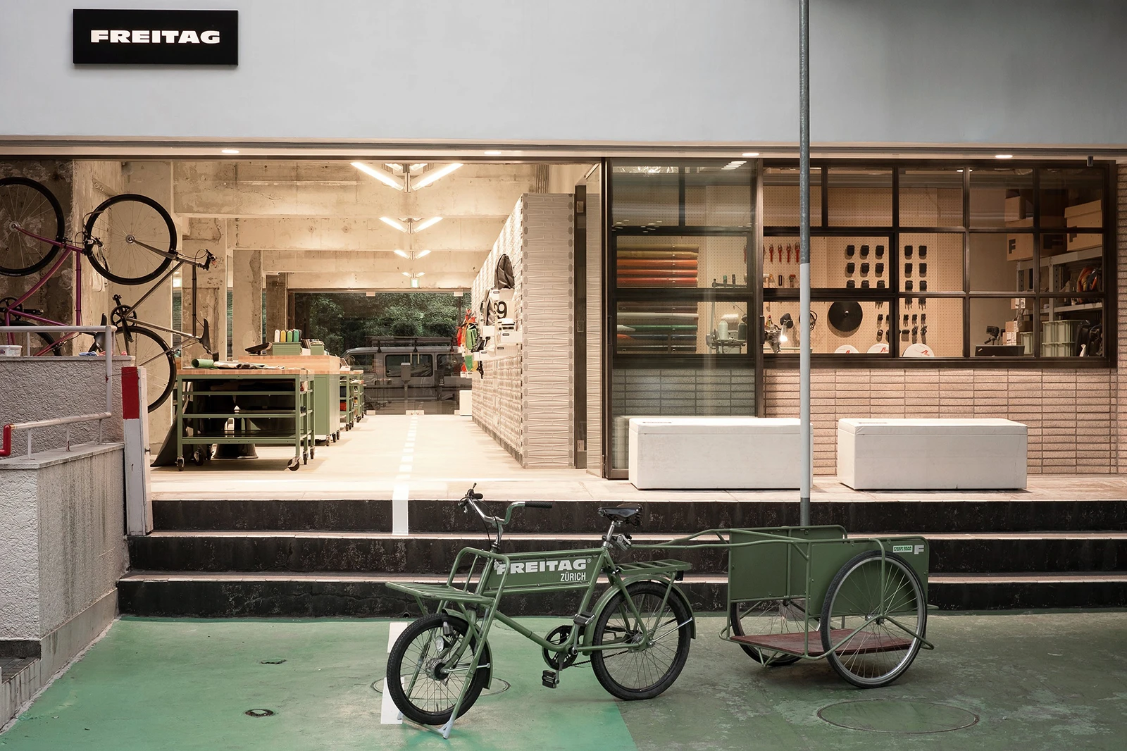 A shipping container is positioned as a landmark at one entrance, referring to the Freitag products' journey from their home in Switzerland to the retail premises in Japan and referencing the brand's philosophy and its flagship Zürich store. The layout draws inspiration from the idea of a 'Freitag Street.' Inside the store, strategically placed Tokyo streetlights mark the street and guide visitors throughout the shop. The store features five sale points, each offering varied services and products, from a repair center and bicycle rental to an exclusive space for the Freitag reference series.