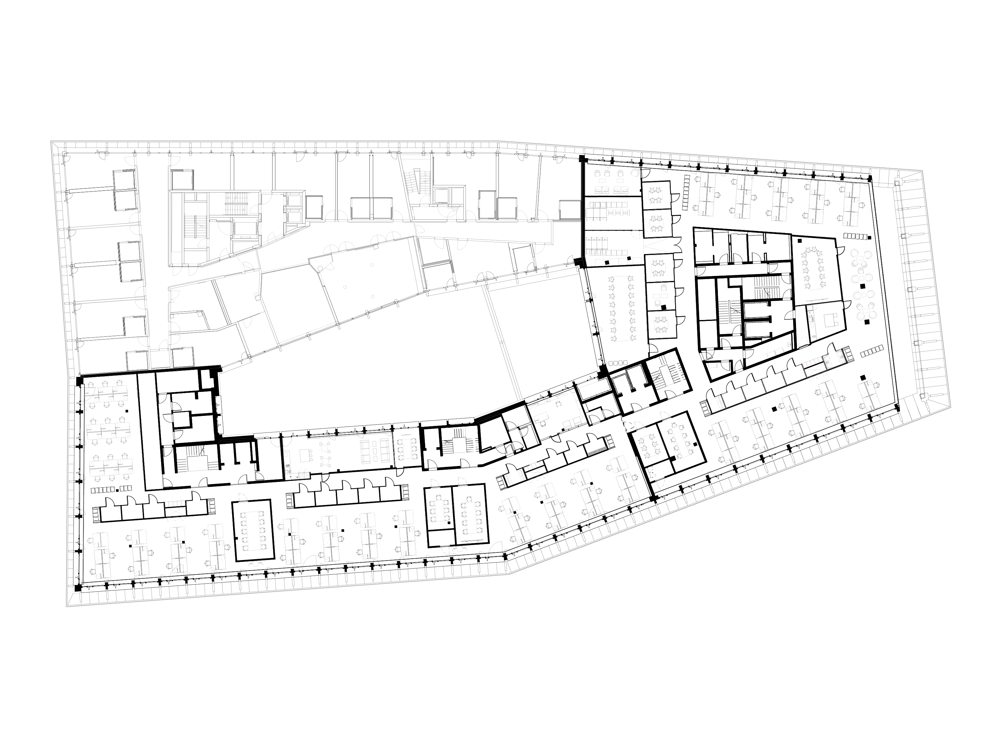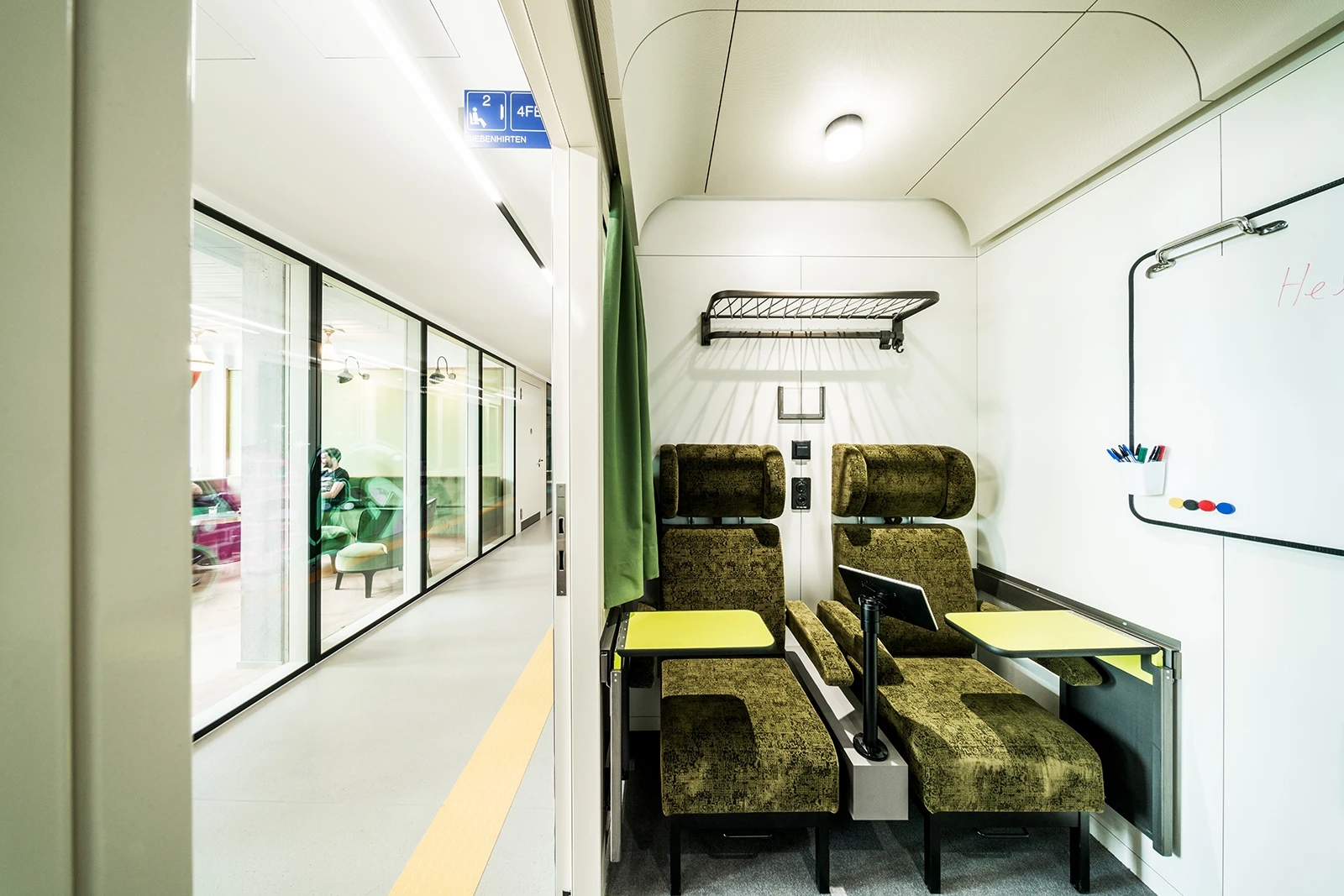 Train compartments, some of which are spray-painted with graffiti analogous to train cars, create quiet zones of work separated from circulation zones, alluding to the state of being on a train ride between destinations. These metal, slender and space-dividing constructions contain copying zones, checkrooms, small restrooms, and micro-meeting rooms.