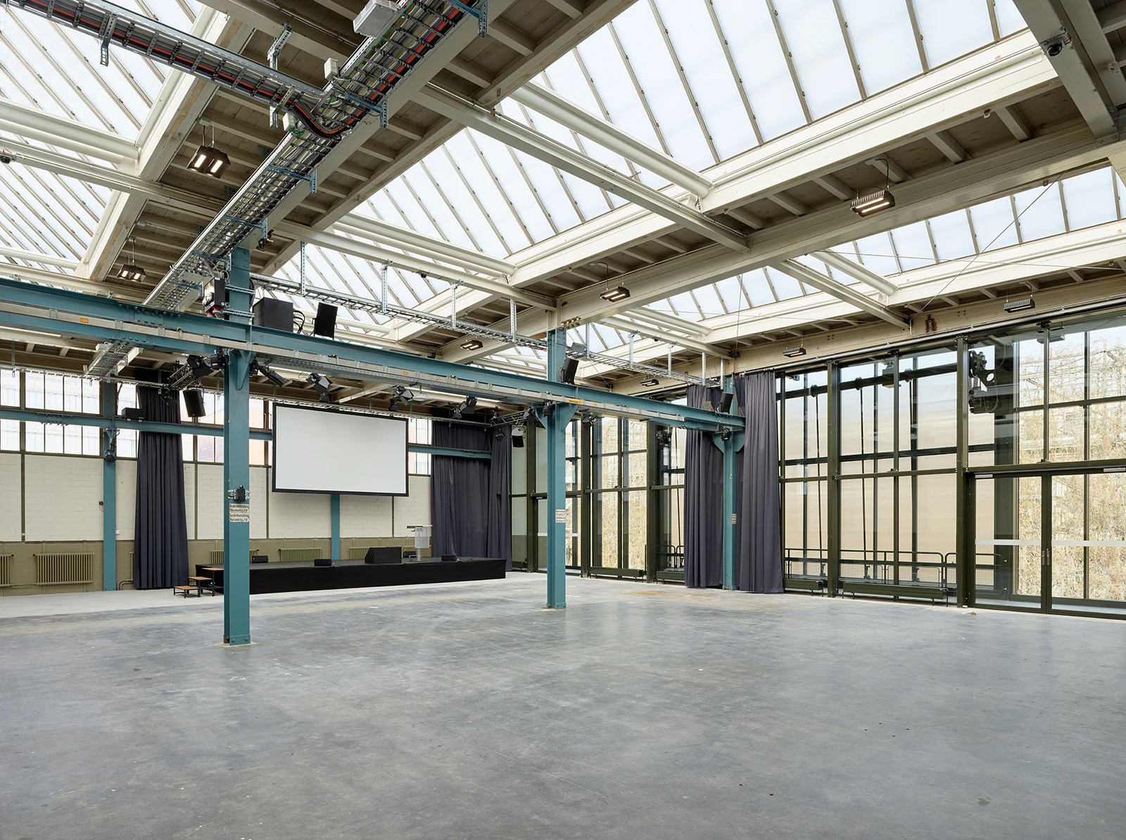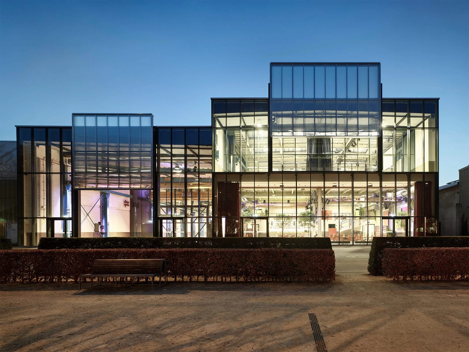 By designating the nearby MFO Park as the focal point of the neighborhood, the halls need to be condensed and fitted with a temporary façade. A new glass exterior visualizes this “urban cut” and positions the halls as modern structures in relation to the MFO Park. At the same time, it imparts them with a transparency that invites and integrates with the surrounding community. Two prominent lift gates on the façade further characterize the halls as welcoming public spaces.