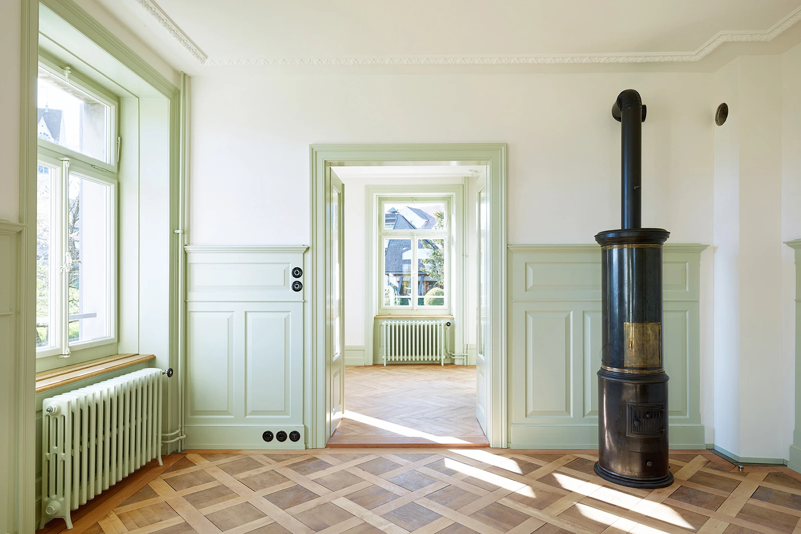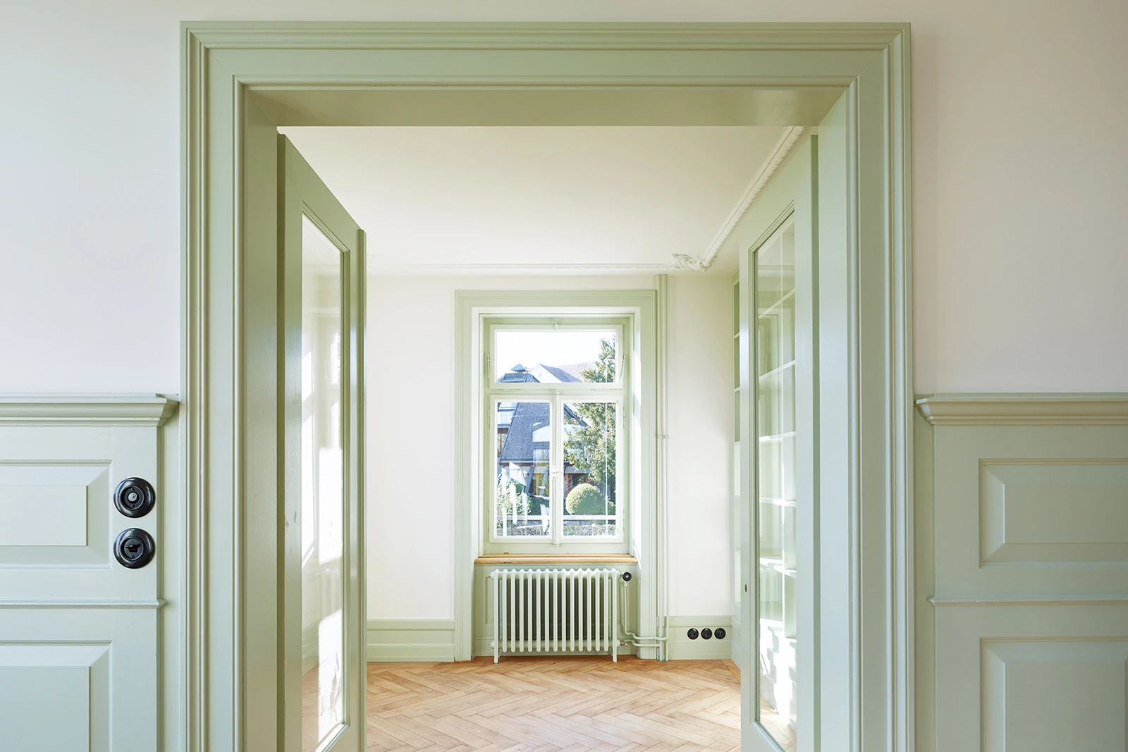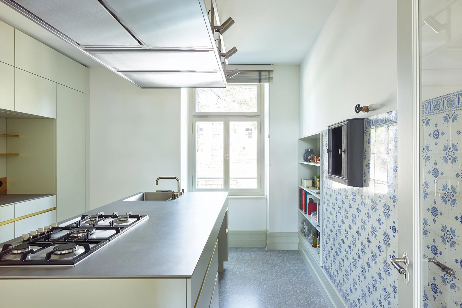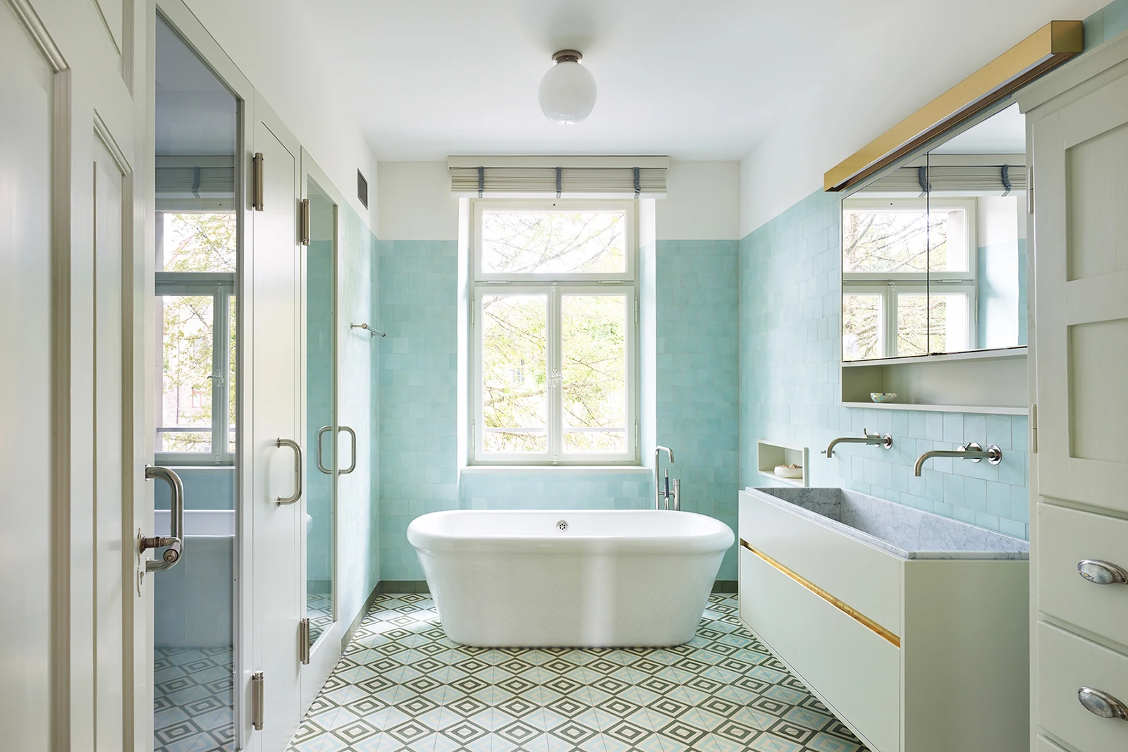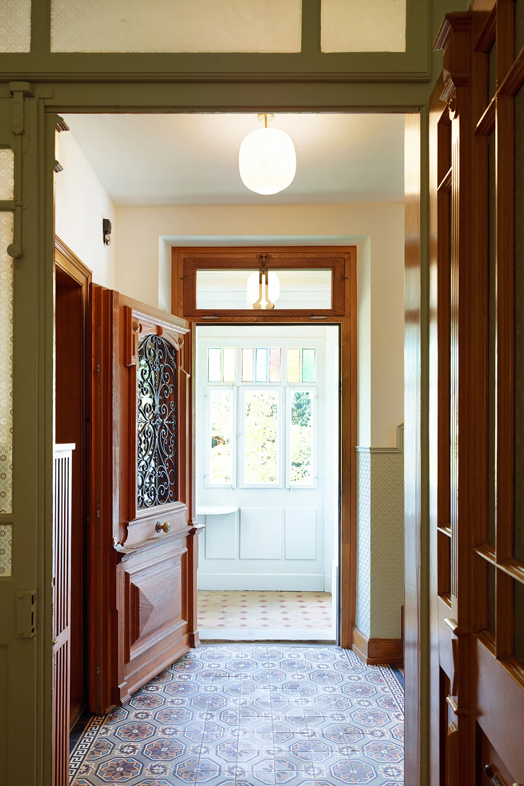 Based on conservation analysis, the building's primary green hue was re-established, as well as the use of lincrusta, a deeply embossed, linseed oil-based wallpaper in the staircase. The original herringbone and Versailles pattern parquet floors were sanded and oiled. The dado woodwork was finished with oil paint, and the walls were painted with mineral paint. The kitchen design features a seemingly timeless terrazzo and stainless-steel surfaces, while the ethereal bathrooms are equipped with Moroccan cement tiles, green cabinetry, marble-lined basins, and carefully designed light fixtures.