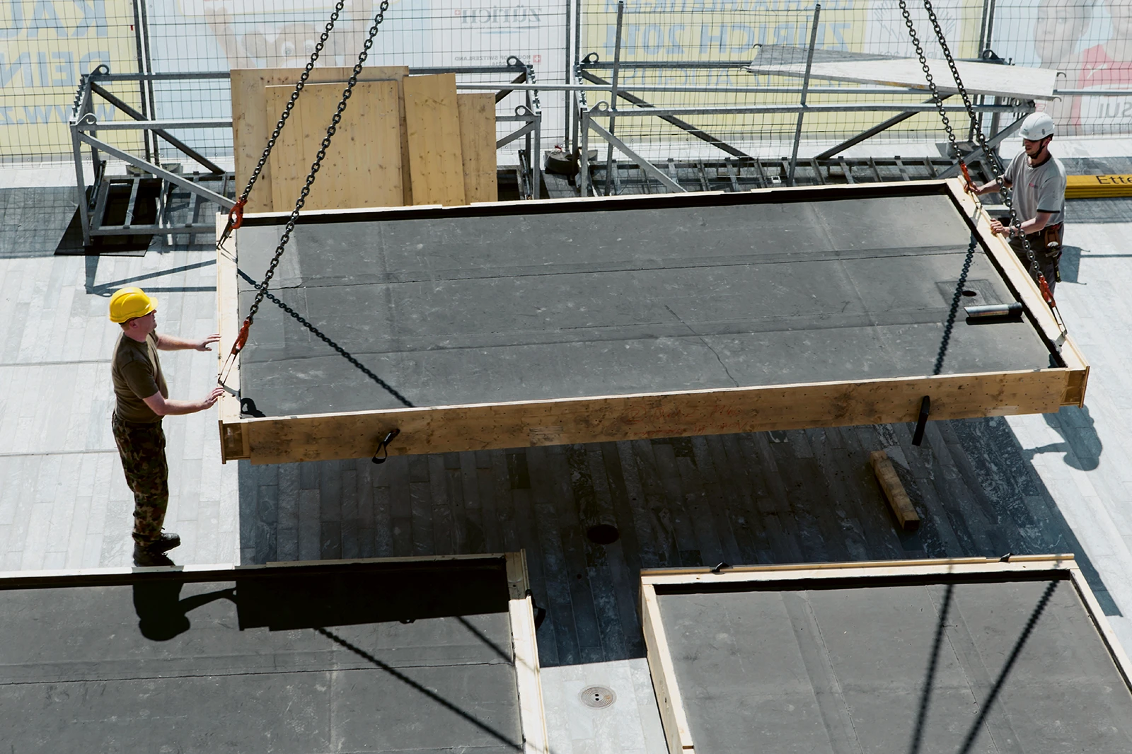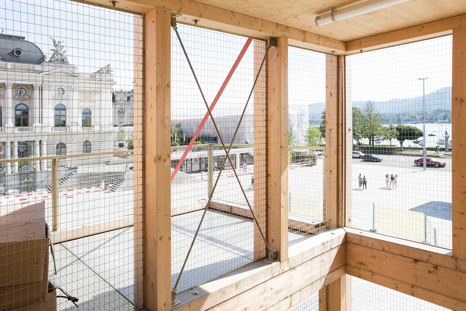 Four archaic bodies are arranged around a void and interconnected by metallic locks which frame an inner courtyard. Structurally relevant red tension belts invoke associations with stacked wood or cargo. The image of a tied bundle is essential to its design concept. It symbolizes Switzerland: a country composed of diverse regions, multiple national languages and cantons.