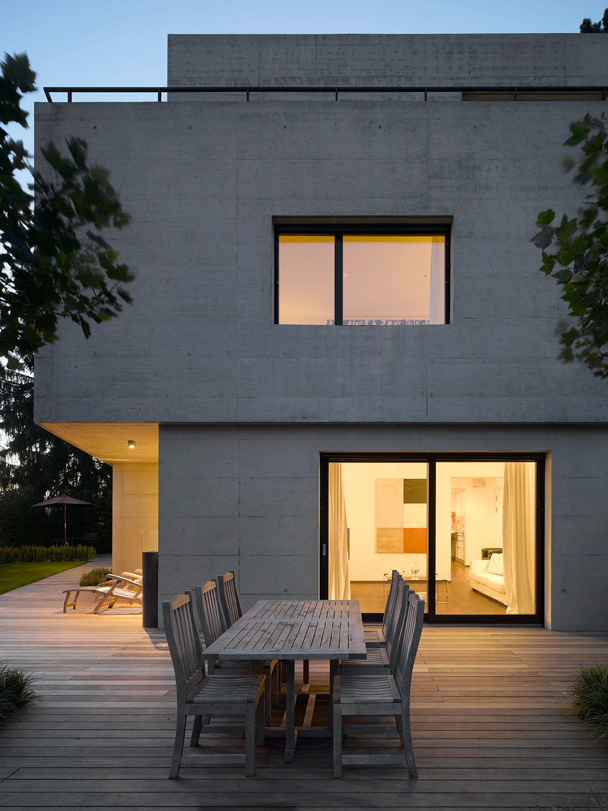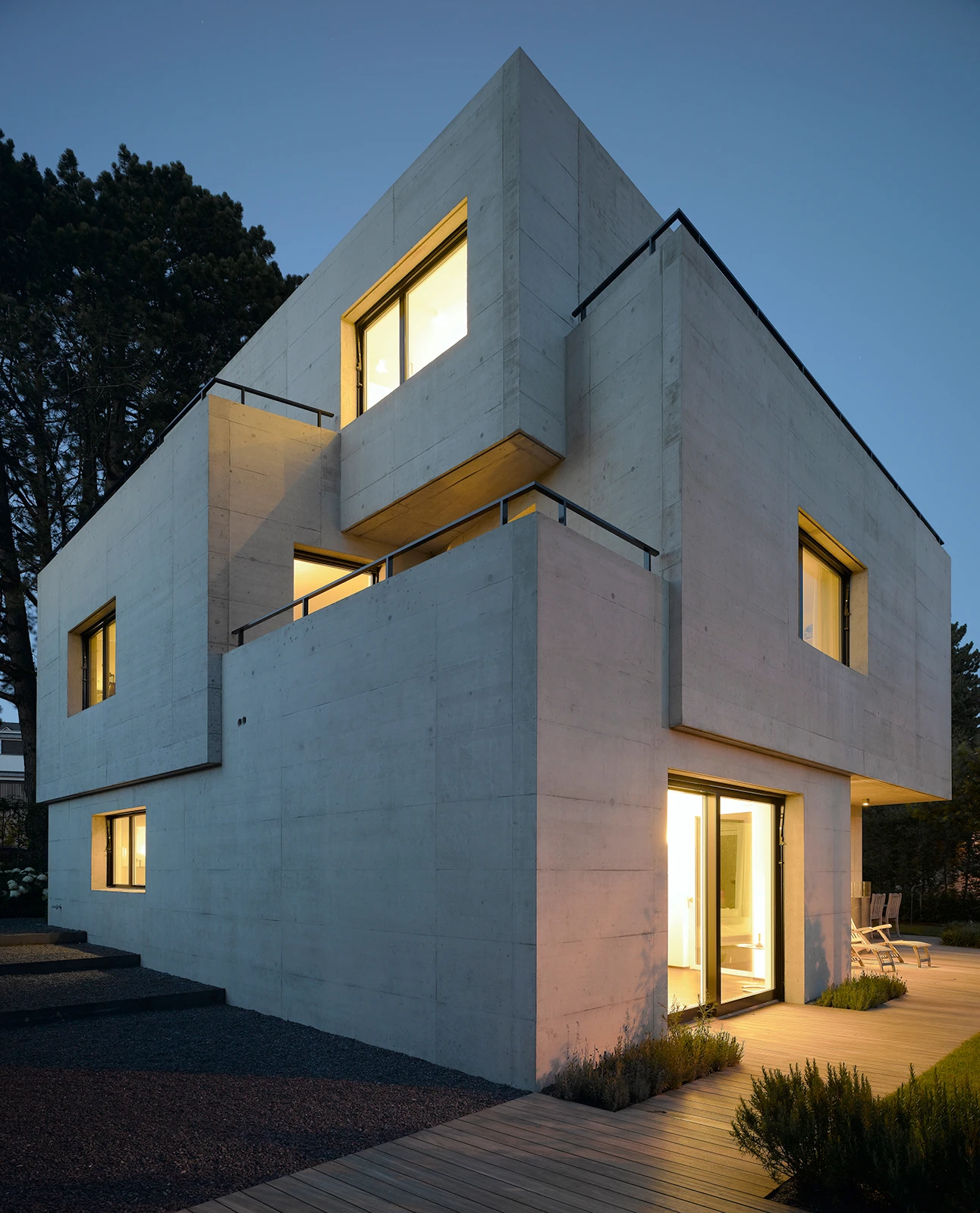 Wie ein Rückgrat führt ein Treppenkern durch das Gebilde und hält die kompakte innere Abwicklung zusammen. Die Schwere des Baukörpers verleiht dem Ort Präsenz und antwortet auf die anonyme neuere Architektur der Umgebung. Gleichzeitig steht er im Dialog mit einer mächtigen, hangseitig an das Haus grenzenden Föhre. Ein puristisch ausgestalteter Gartenraum umfasst den Körper, transformiert den Innen- in den Aussenraum und schafft im Zusammenspiel mit einer das Grundstück umschliessenden Hecke eine hohe wohnliche Intimität.