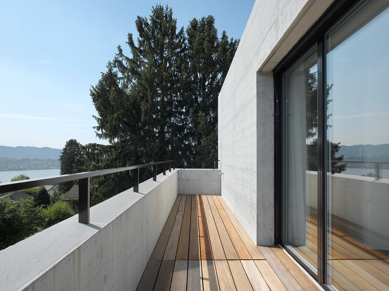 Das Einfamilienhaus umfasst zwei Vollgeschosse mit Attika sowie ein Untergeschoss mit Tiefgarage. Die vor- und rückspringenden Geschosse der einschaligen Betonkonstruktion sind aufeinandergestapelt. So entstehen unterschiedlich ausgerichtete Balkone. Die Fensteröffnungen sind präzise so in den einzelnen Räumen gesetzt, dass sich Ausblicke auf den See und in die Ferne eröffnen.