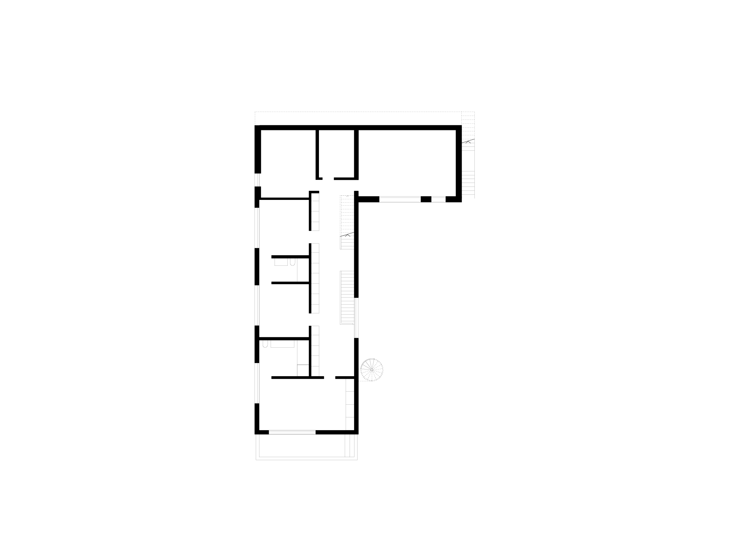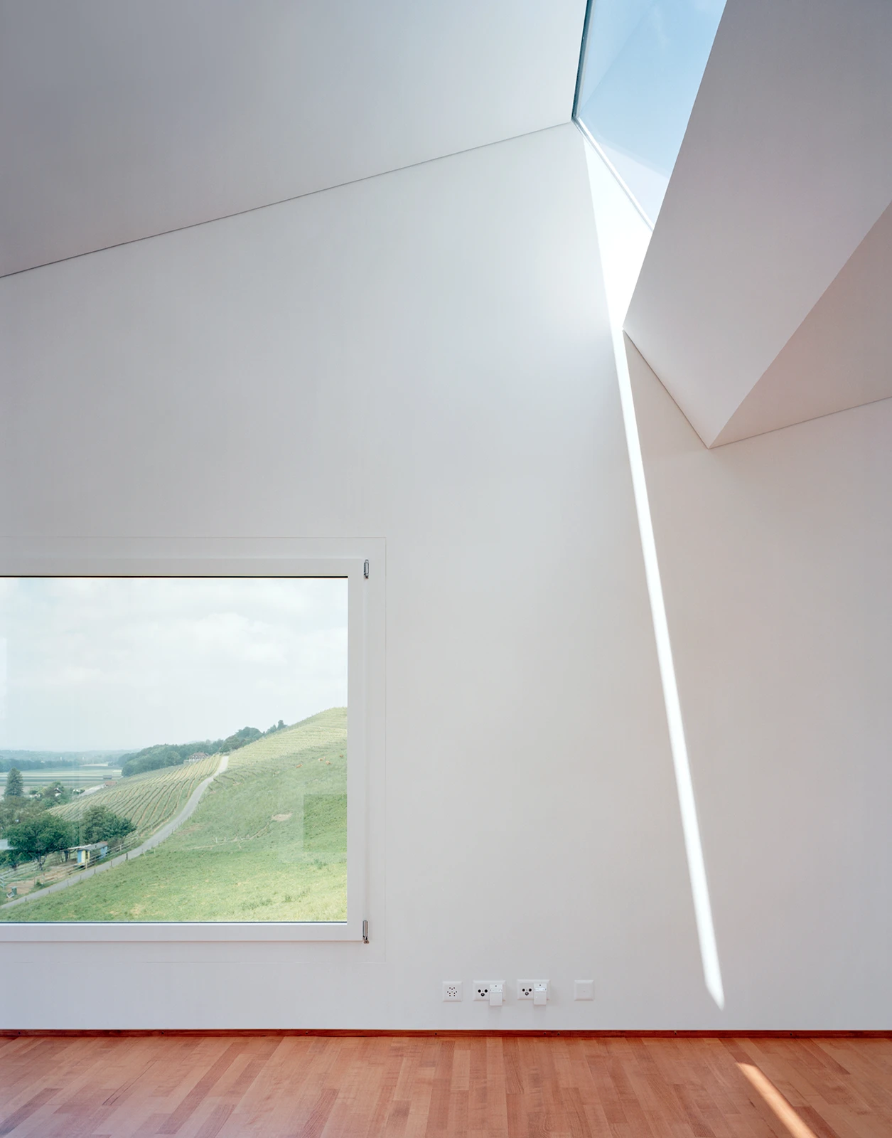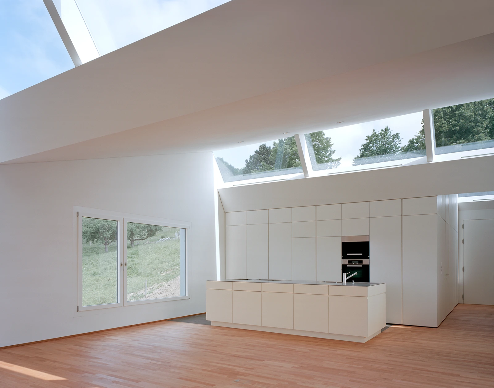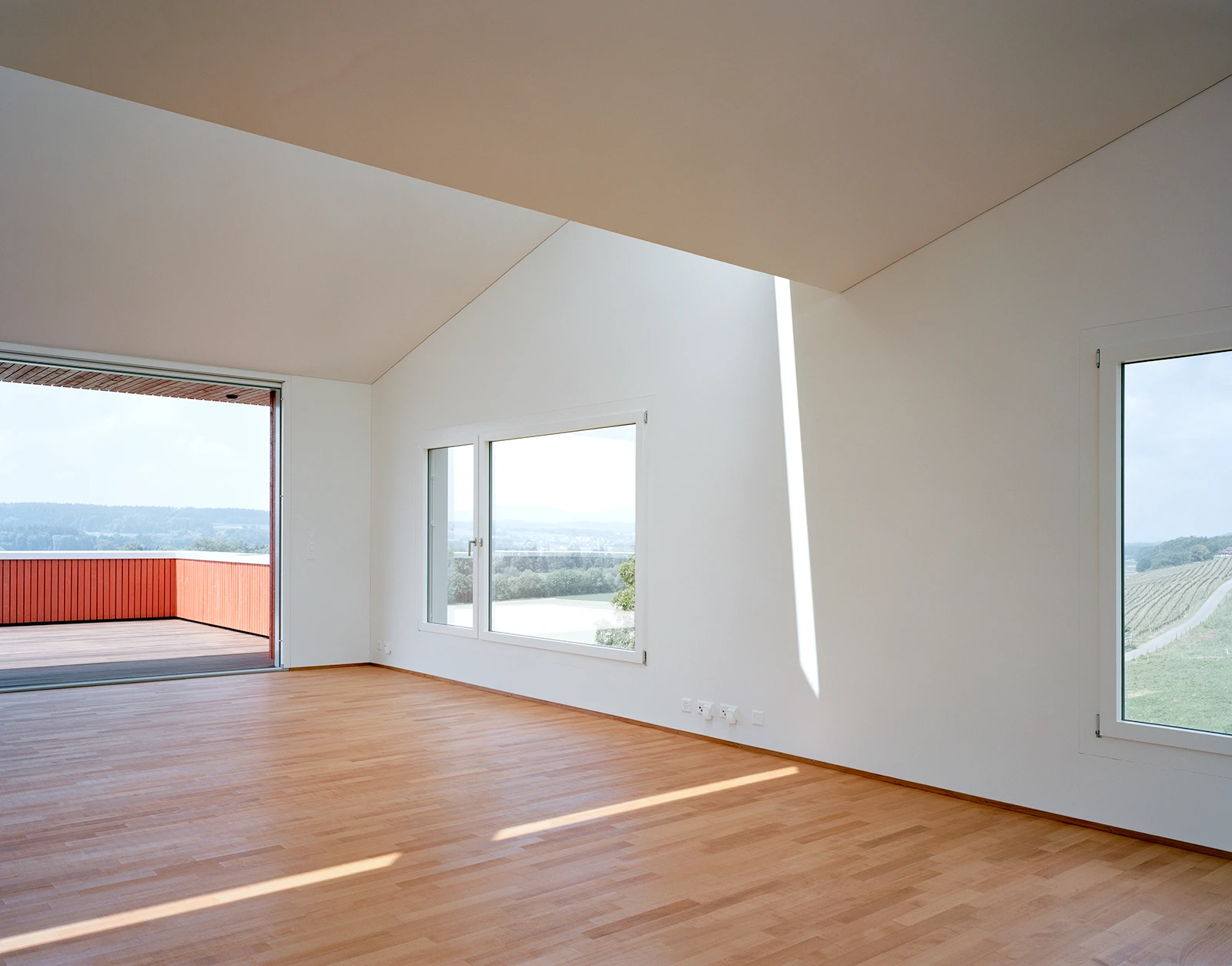 A 300-square-meter detached family house sits on an incline at the periphery of Üsslingen, Switzerland. The home is built as a sustainable, prefabricated timber structure atop a pre-cast concrete basement, while the existing topography shapes its placement. Its primary entrance on the top floor leads to a kitchen and living area. Subsequently, a staircase leads to the mid-level bedrooms and further down to the cellar that extends onto a terrace and an outdoor swimming pool.