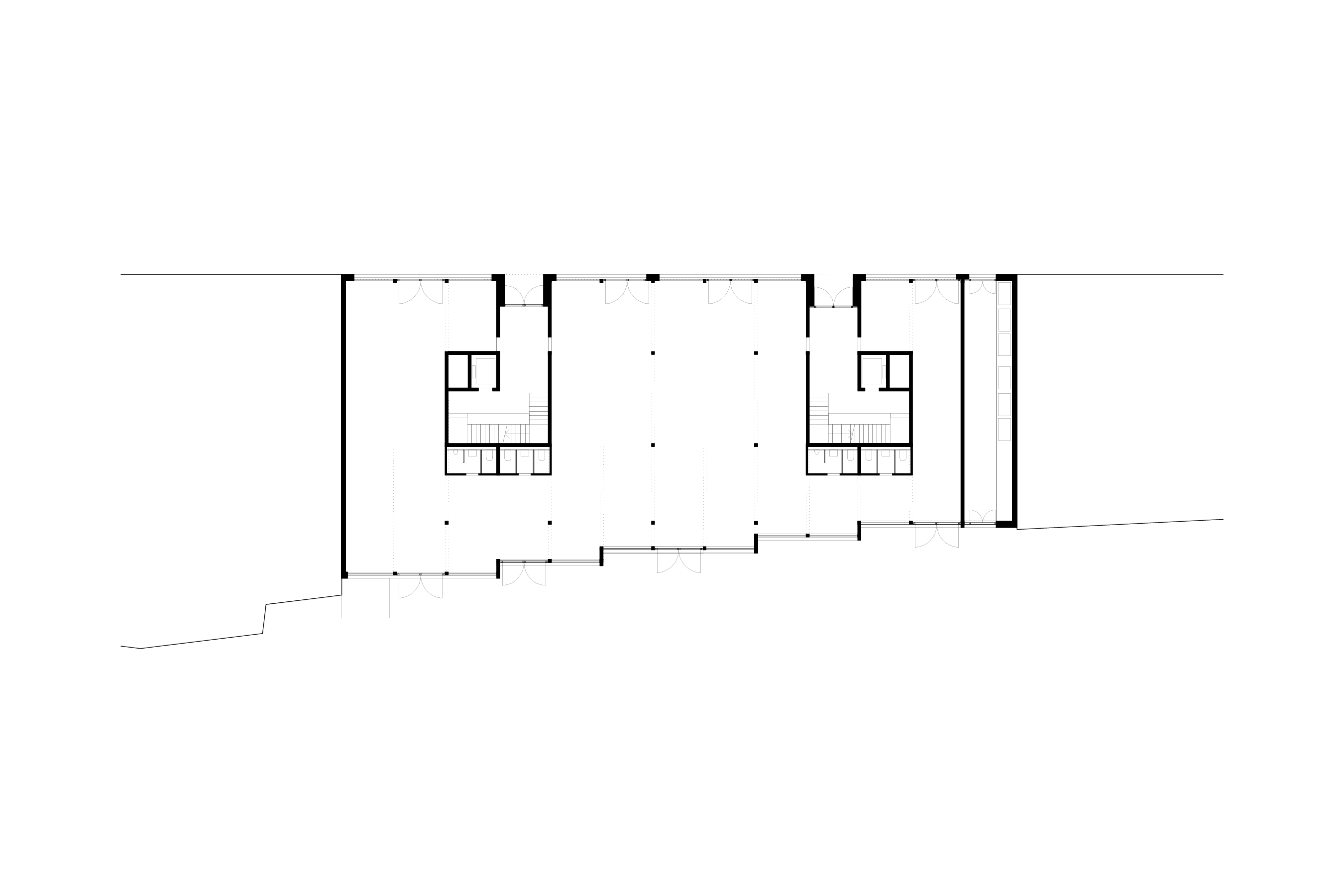 Access on the street side is granted via two compact cores that connect the densely organized, bespoke residential units, and the courtyard is accessed on the easternmost side of the building. The sidewalk-level retail floor area is designed to be flexibly divided into four units. Two tree clusters vegetate the courtyard, while the roof terrace hosts co-living outdoor space for the resident community.
