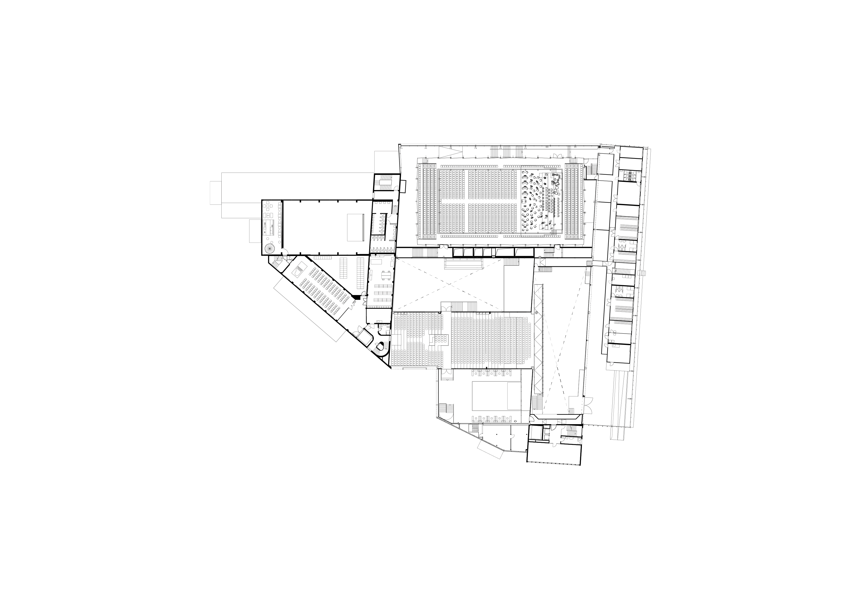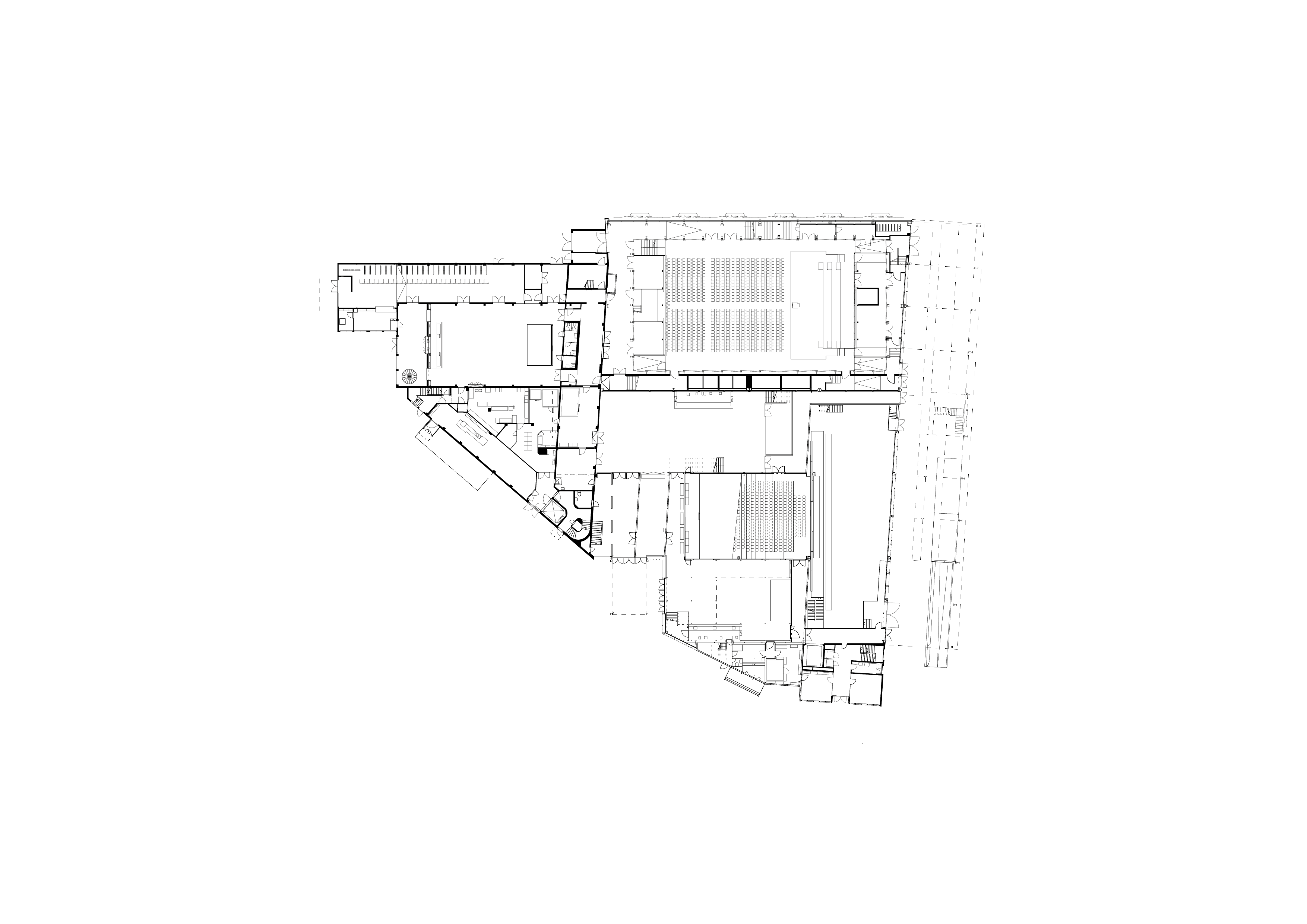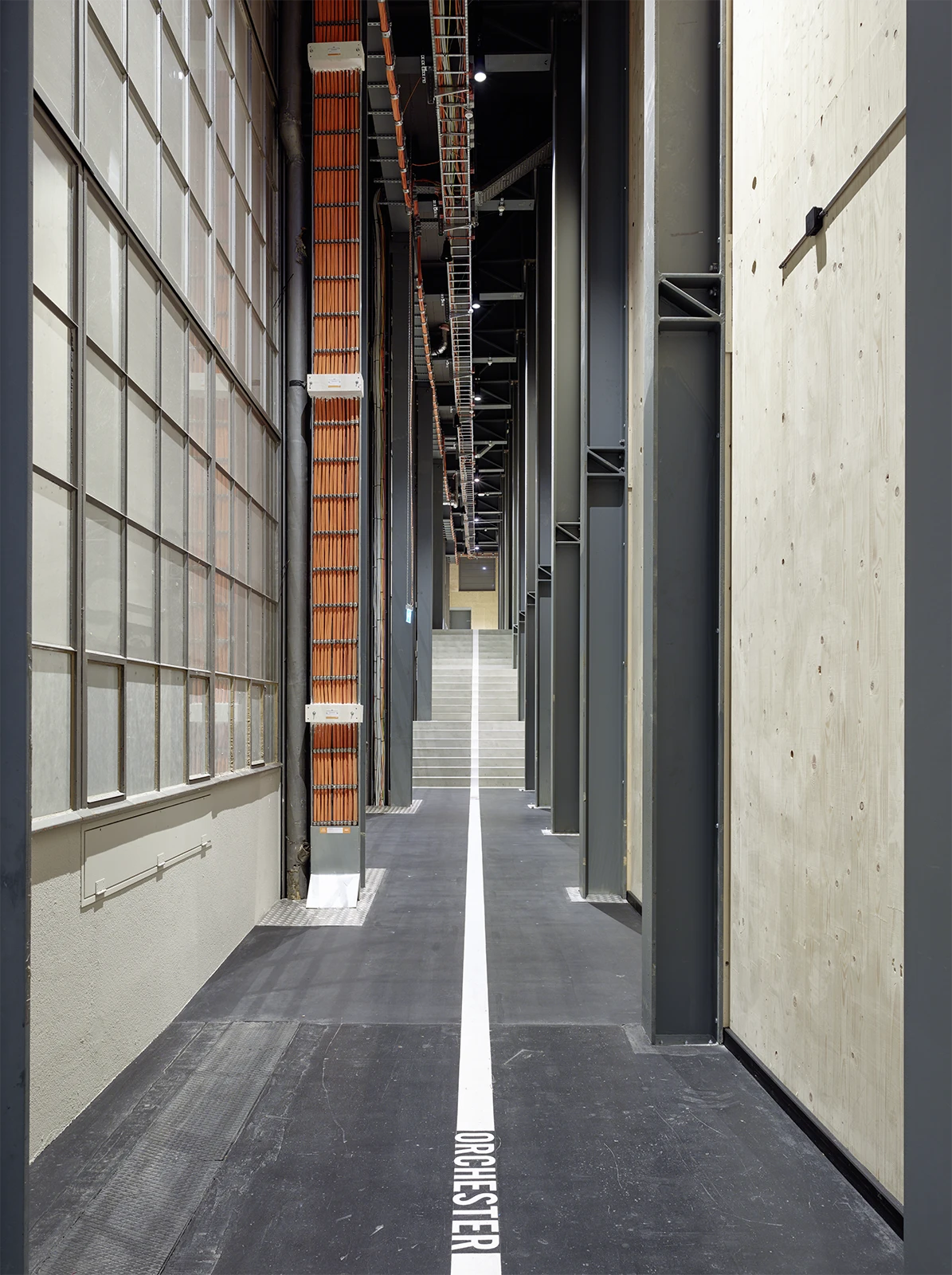 The concert hall constructed from simple and inexpensive spruce wood was inserted as a wooden box in a former production hall. In the intermediate area outside the wooden vessel and within the industrial building’s walls, visitors see the raw and honest character of the elementary wooden construction. The concert hall was built into the former industrial space as a decoupled modular wooden construction, a wooden “box within a box.” A new roof constructed from steel girders cast in concrete is equipped inside with acoustic concave ceiling reflectors between the girders.