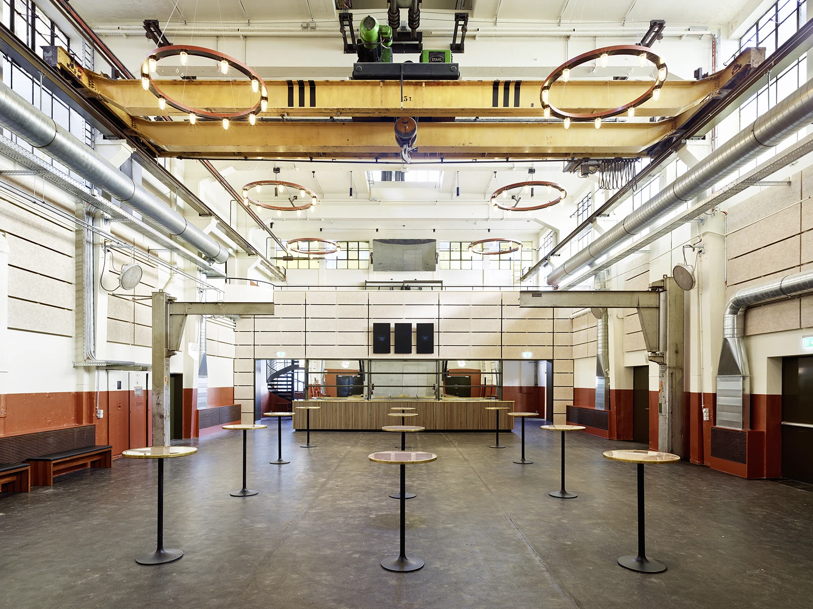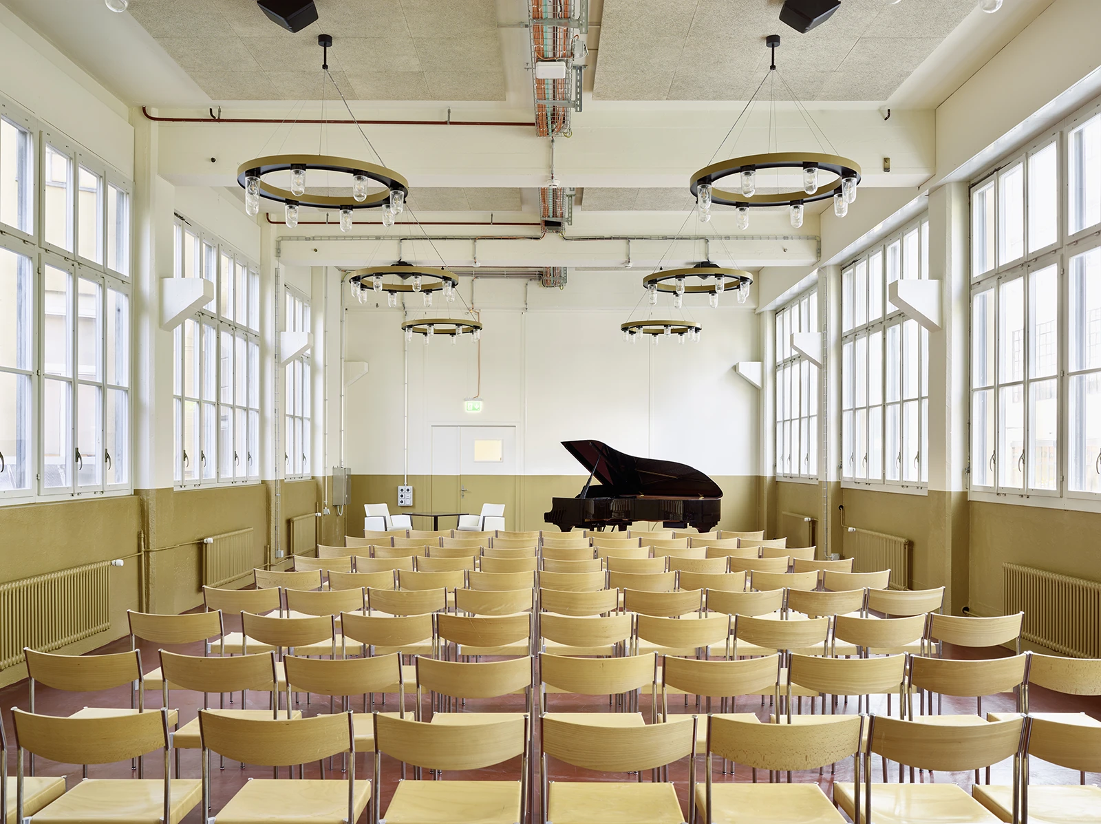 The Tonhalle Orchester Zurich was founded in 1868 and enjoys worldwide recognition. While its permanent home is being renovated, the provisional concert hall was designed to satisfy the orchestra’s and the public’s discerning artistic demands. The former Maag industrial hall, where the Maag brothers’ machine factory produced gearboxes, pumps, and cogs until the 1990s, was transformed into a concert hall with excellent sound quality within a very short period. In addition to the construction of cloakrooms, a foyer, and a concert hall, the Maag Building K, classified as a building worthy of special protection by the preservation authorities, was also equipped with recording rooms, administrative offices, break rooms, and a music library.