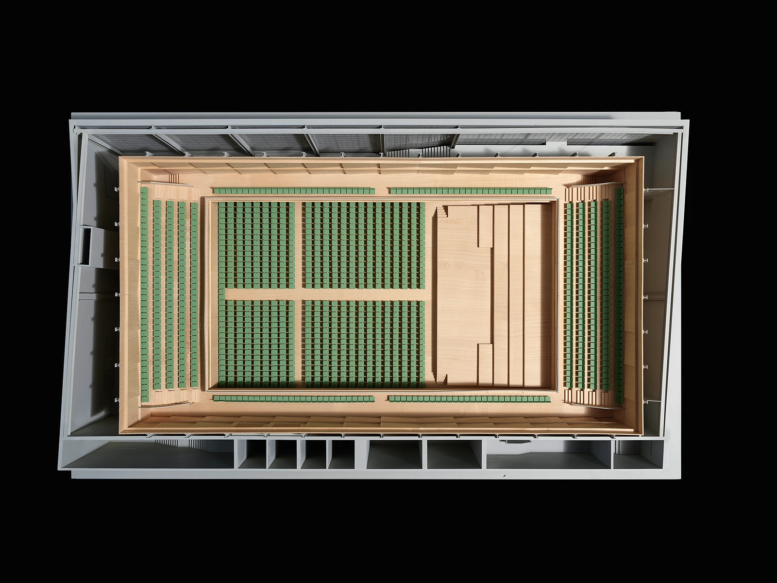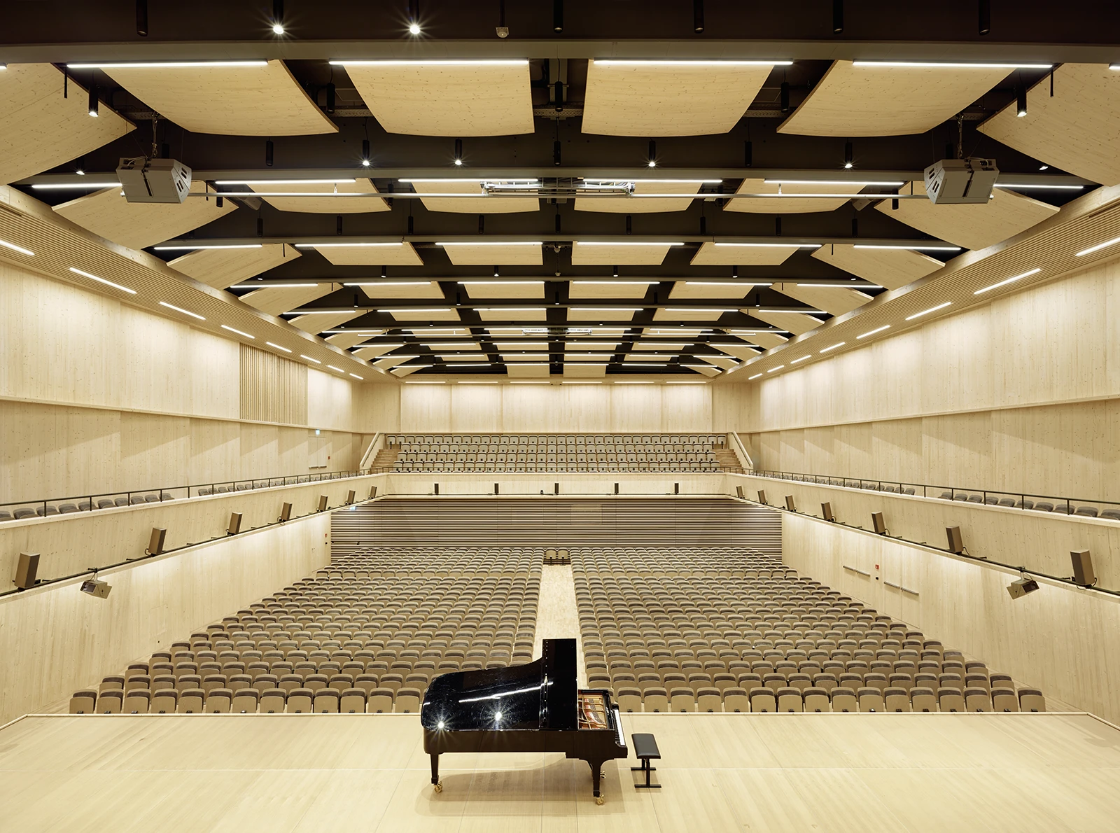 With 1224 seats, 440 of which are in the short side tiers, the acoustic intimacy of the classical rectangular hall is universally praised by the orchestra and audience. The hall’s interior form adheres precisely to acoustic rules. The slightly tilted wall panels and convex curved ceiling panels break the hall’s right angles and disperse sound optimally; the hall becomes a single resonating body.
