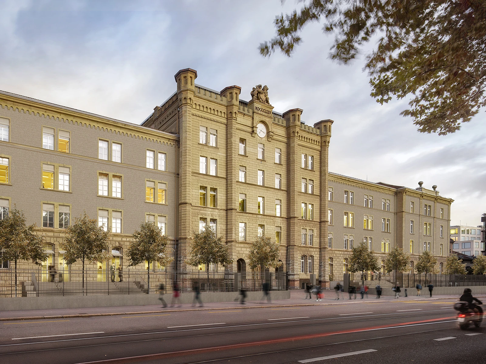 The military barracks of Zürich are integrated into an extensive compound designed according to the master plan by Johann Caspar Wolff. The northern side of the compound is comprised of stables, a riding arena, depots, the parade ground and the armoury, organized in a staggered, axial arrangement. The grounds extend over the River Sihl, connecting the city centre and the Aussersihl district. The barracks were subsequently renovated in a historicist style between 1873 and 1876 according to plans by Wolff’s successor, Johann Jakob Müller. The design gave the ideologically depicted development a fortified expression, its sandstone masonry tower acting as a central avant-corps.