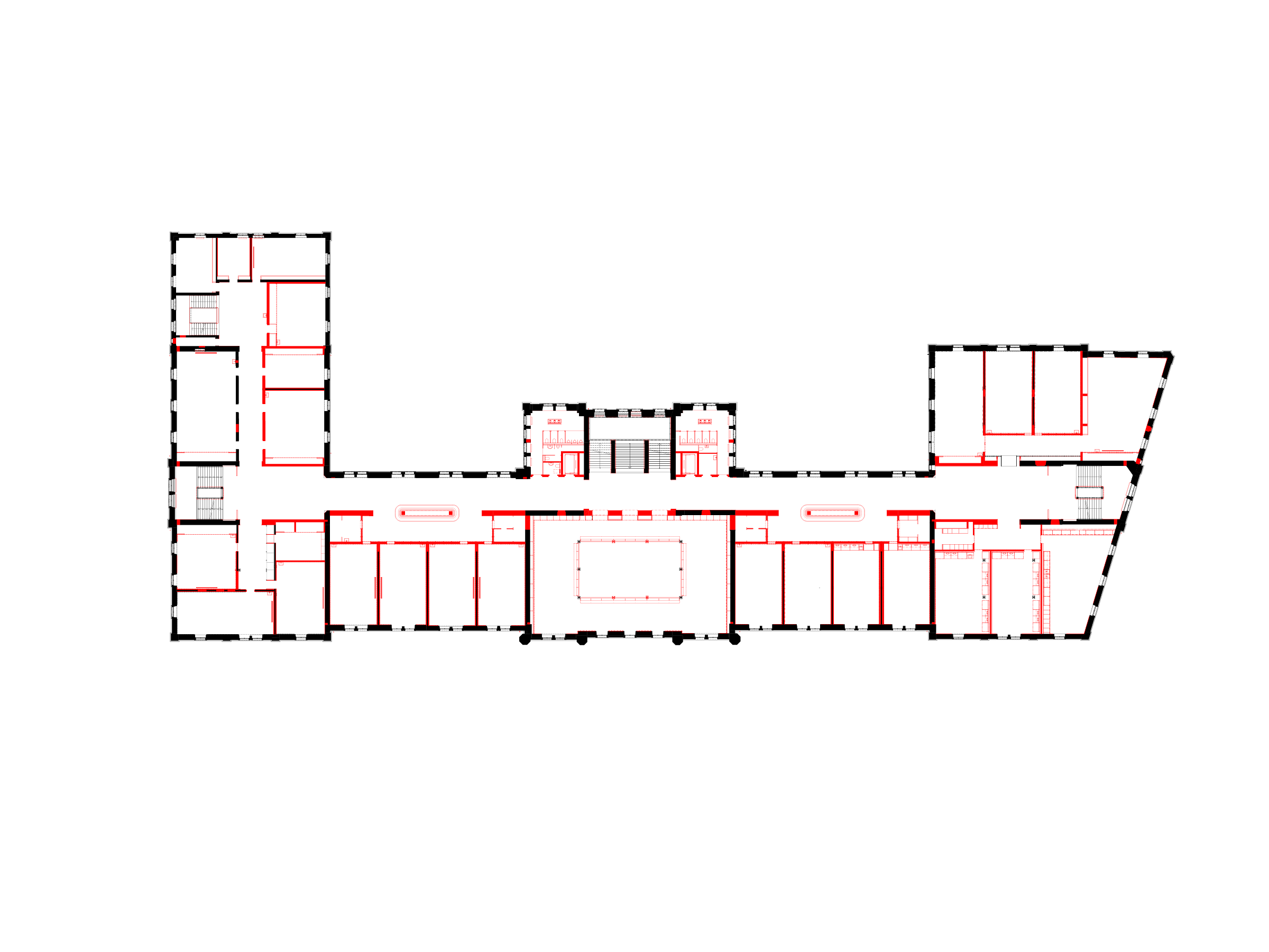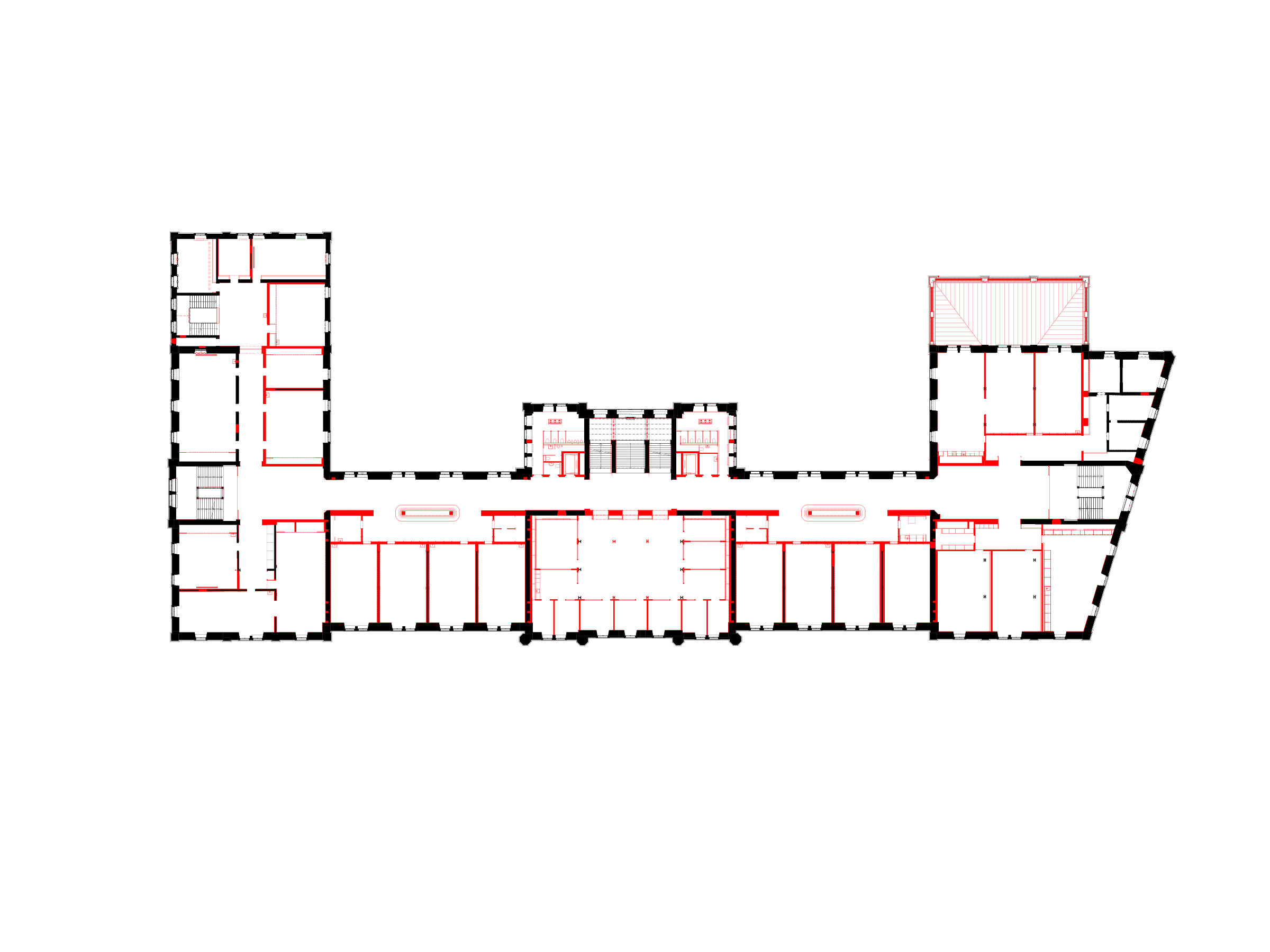 The project proposal consists of converting the old military barracks into an education centre, open to public use on the ground level, and comprised of three measures that will enhance the urban fabric. The plan continues with the spatial logic of the building though its axial arrangement: on the mezzanine level, facing Kasernenstrasse, the currently closed volumes of the 122-metre main façade is opened up with two symmetrically placed terraces flanking the main entrance. They consolidate the landing space, while also extending the large areas of the base level towards the exterior. These outdoor extensions are orientated towards each other and function as interconnected market halls, which also connect directly to the main entrance and the surrounding urban space by means of exterior stairs.