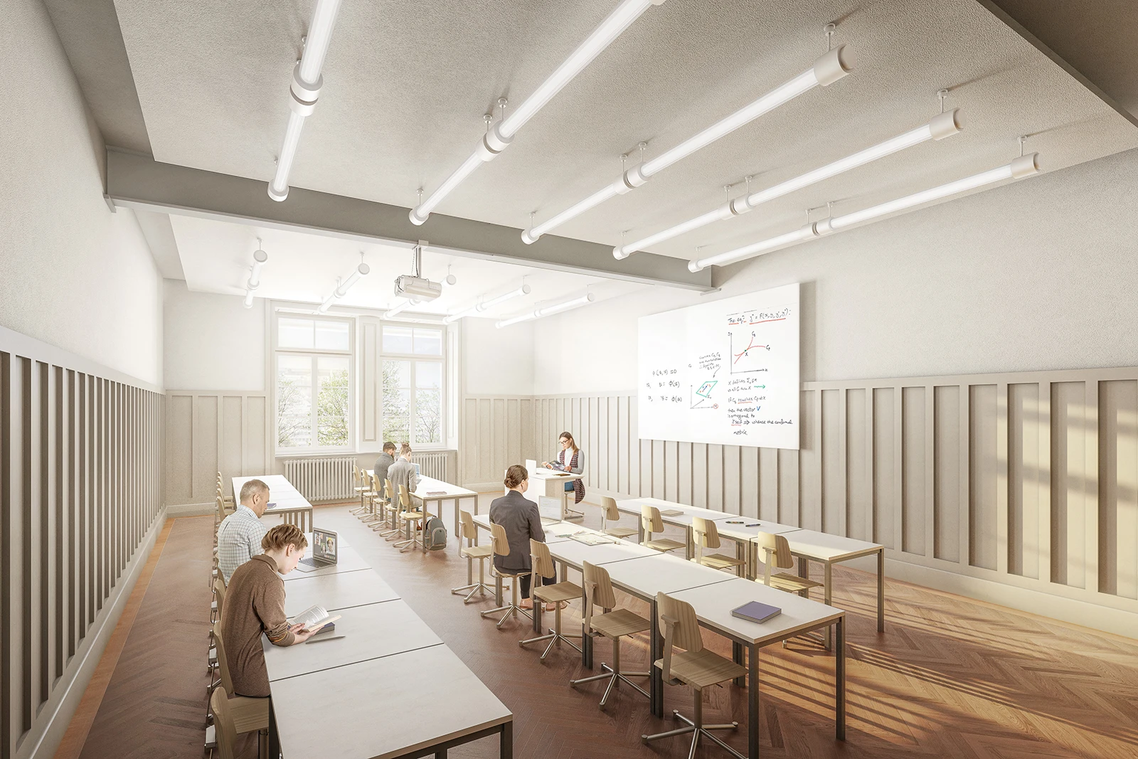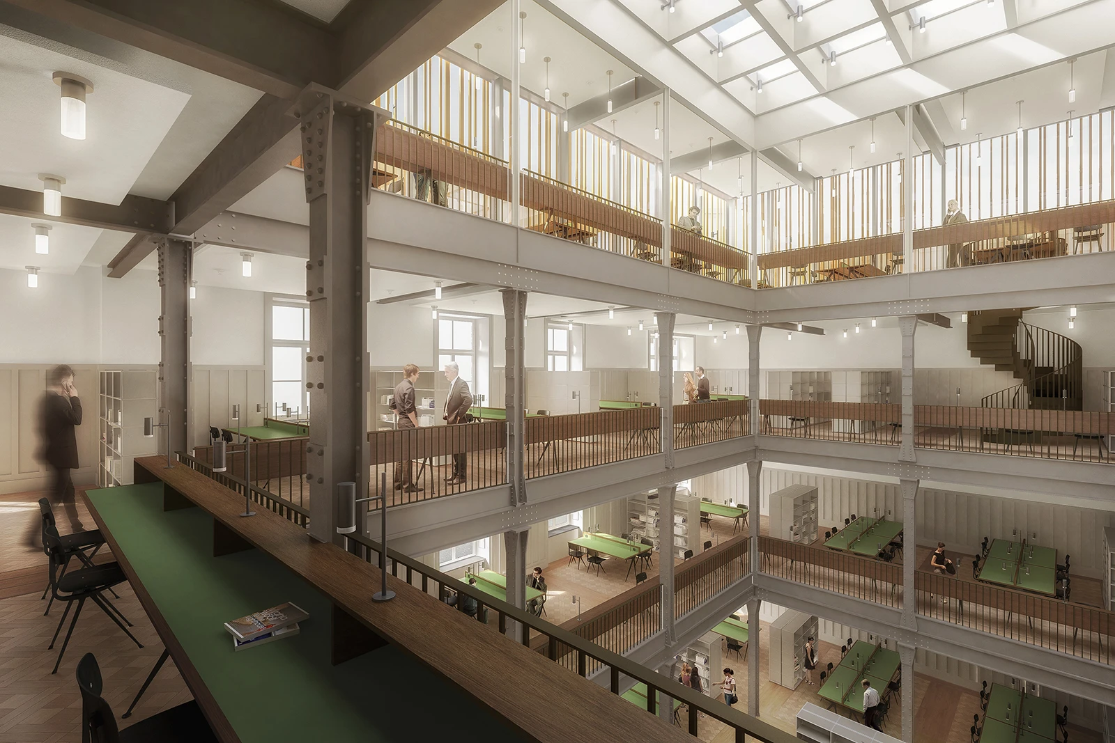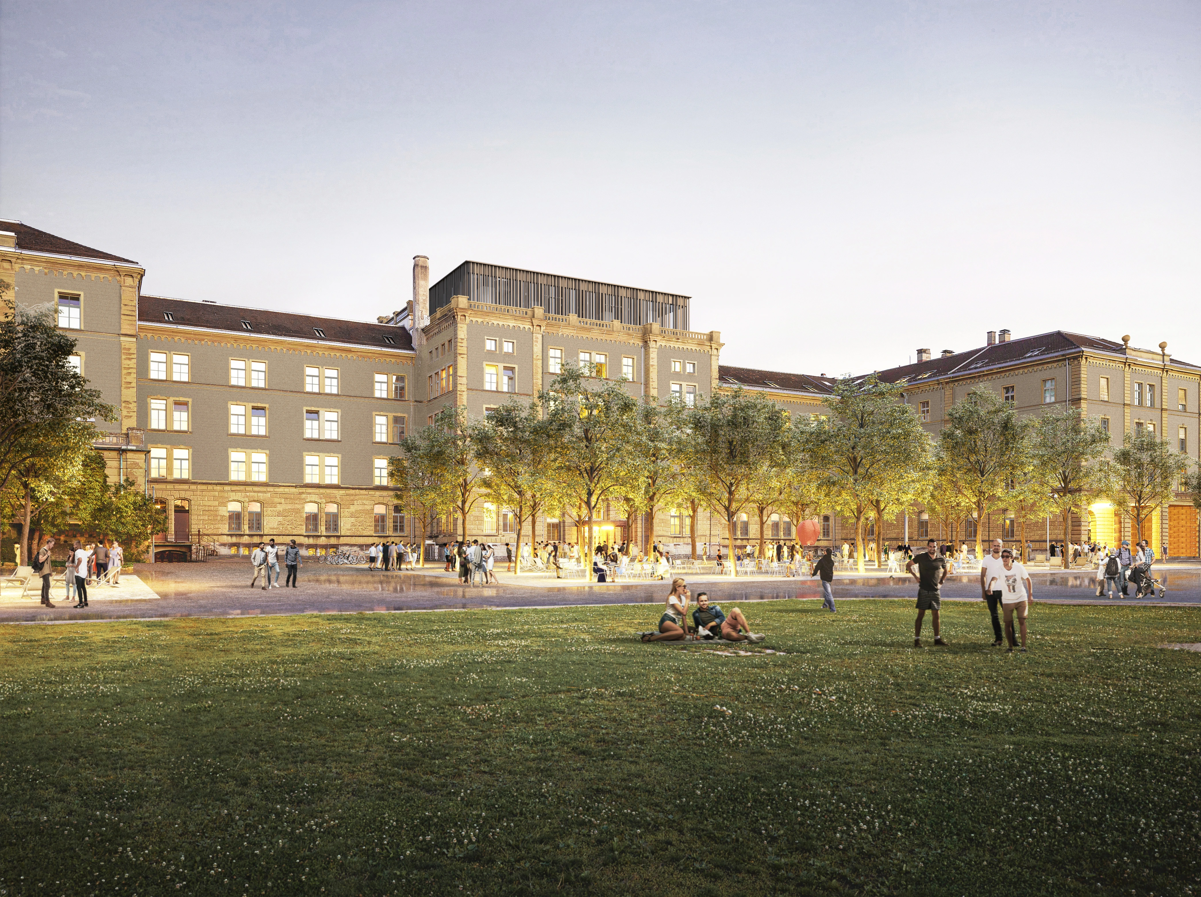On the exterior, the riveted, profiled iron props of the original steel structure are stripped down to reveal their structural purity. The surrounding environment offers open spaces, including the former parade ground which is situated between the barracks and the green. The area is populated by a central copse of trees in order to provide a shady gathering space for the future school, forming a spatial conclusion towards the green.