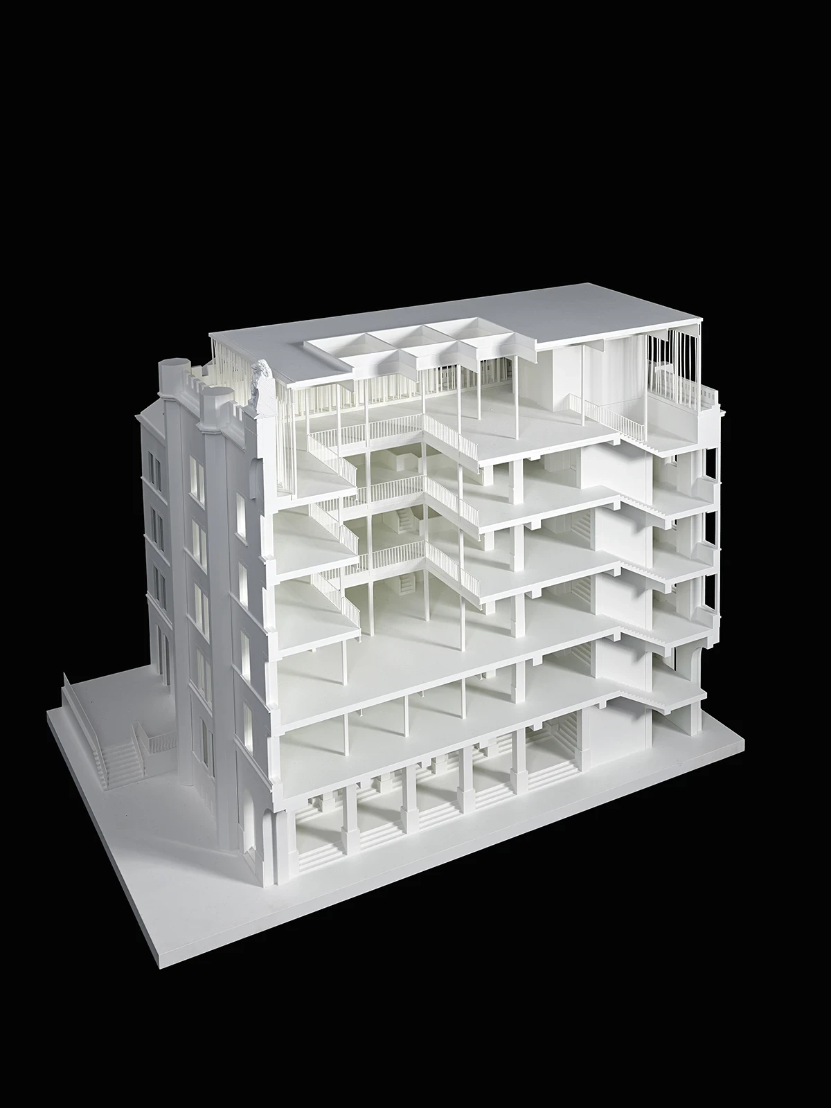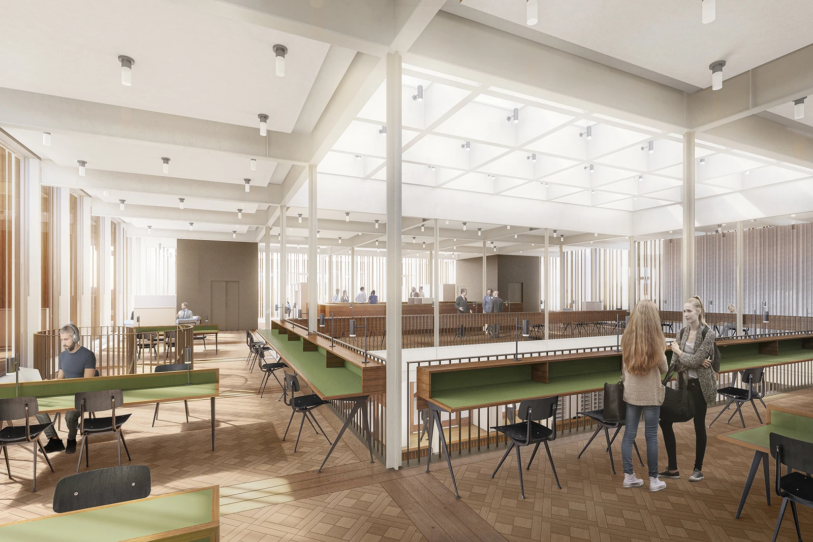 The second measure involves the partial opening of the roof structure above each wing. The apertures are only recognisable when illuminated during the evening. The two music rooms beneath the roof are enveloped by glass domes, creating lantern-like structures that shine light from all sides into the waiting areas.