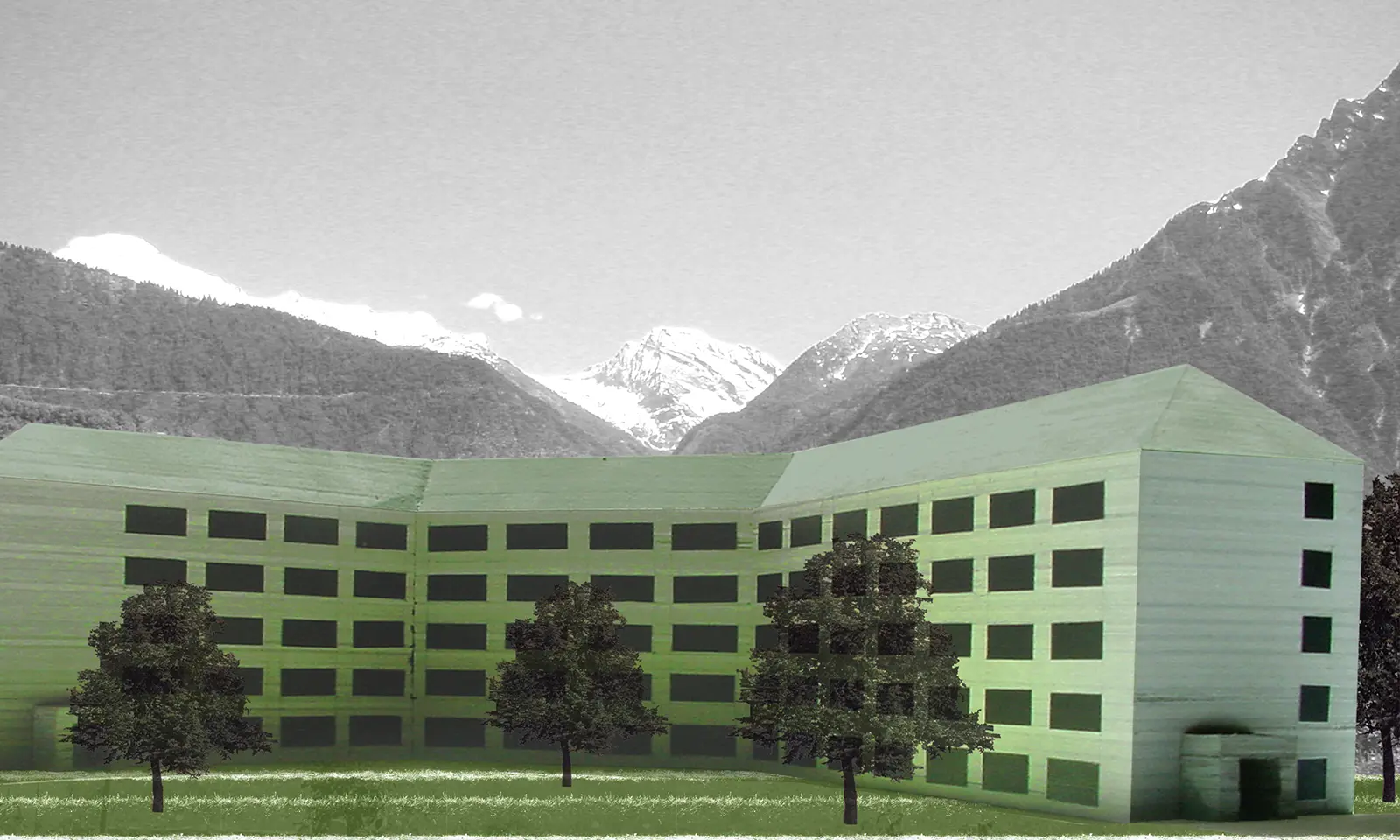The elongated, curved structure, leaning towards the slope, refers in form and scale to an existing senior residence.