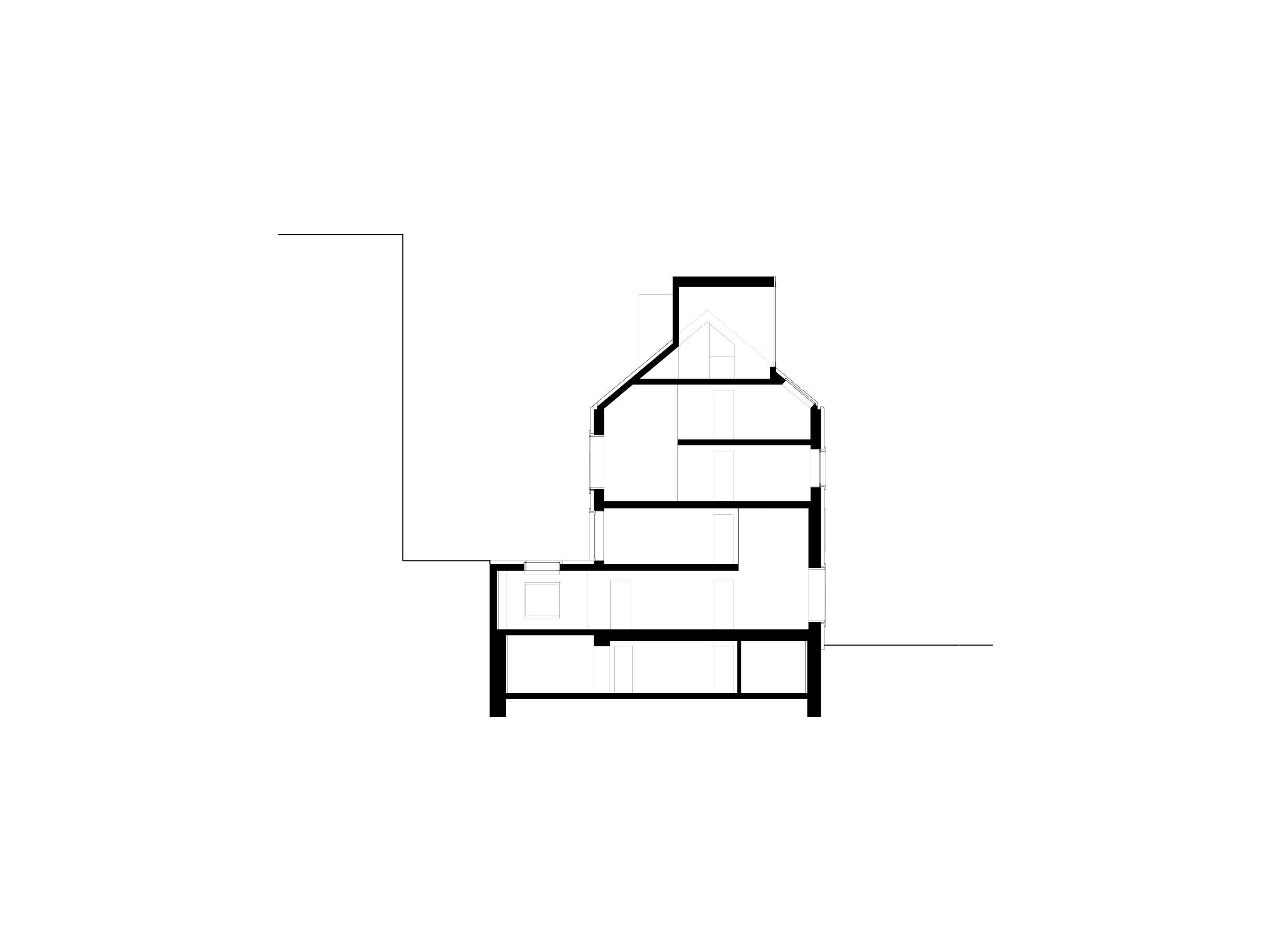 The base and roof of the building protrude on the western facade to form the new entrance. The eastern facade references its neighbors by regularly placing windows and subtly incorporating its base design. Its larger window openings align seamlessly with the exterior, while the shape of the roof and the selection of building materials nod to the architectural style of the building on the eastern corner. Rooftop features offer a modern interpretation of dormer windows, conforming to 19th-century housing typology.