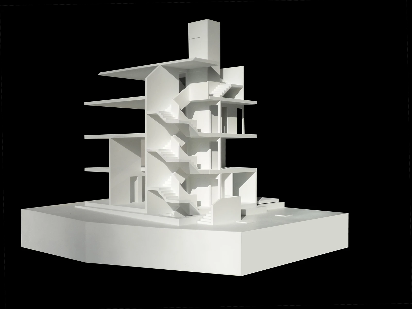 The design for an apartment building conversion into a bank and office space is a formal reaction to the two distinctly shaped neighboring buildings. They are amalgamated and translated into the new building by borrowing and adapting some of their elements.