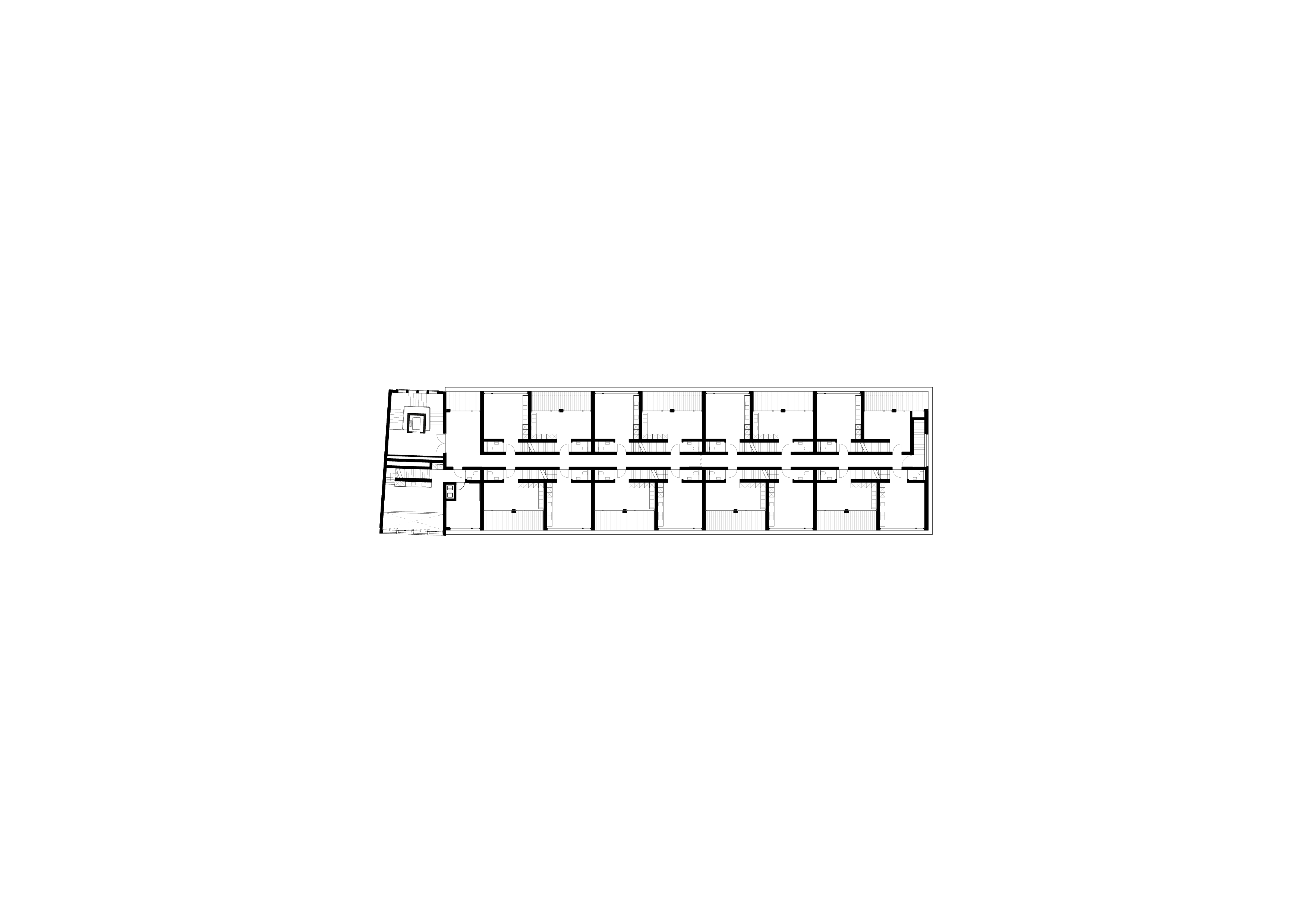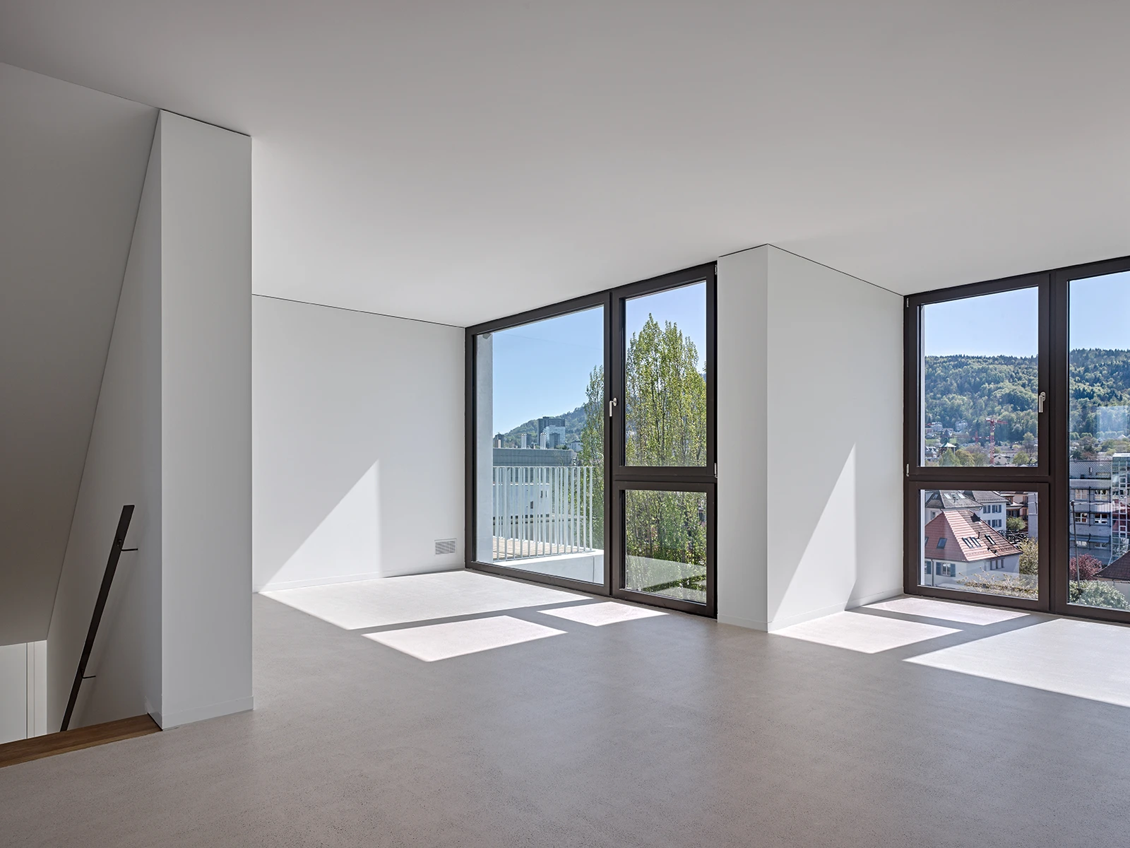 Obwohl die Struktur der Aufstockung auf den ersten Blick einfach und klar erscheint, sind die einzelnen Duplex-Wohnungen komplex ineinander verschachtelt. Dies bewirkt neben der räumlichen Variation der zwei Grundtypen auch die erforderliche Ausrichtung der 17 Wohneinheiten zur lärmabgewandten Gebäuderückseite. Die grosszügigen Wohn- oder Schlafräume finden in vorgelagerten Aussenterrassen ihre Fortsetzung. Die Vertikalstapelung erzeugt im Innern die Weite eines kleinen Stadthauses: Der räumlich gefasste innere Treppenlauf führt je nach Wohnungstyp ein Geschoss hinunter: in die umgenutzte Gebäudestruktur des dritten Obergeschosses; oder hoch: in das aufgestapelte fünfte Obergeschoss. Sämtliche Einheiten werden im vierten Obergeschoss über einen einzigen inneren Korridor, eine Rue Intérieure, erschlossen. Diese wird über als vertikale Schächte ausgebildete Lichtkanonen zenital belichtet. Der Ausdruck der Fassade ist städtisch und Abbild der inneren Organisation. Die gewählte Verkleidung der hölzernen Aufstockung, detailarme Faserzementgusselemente, ist langlebig und schlägt den Bogen zurück zum massiven Grundbau.