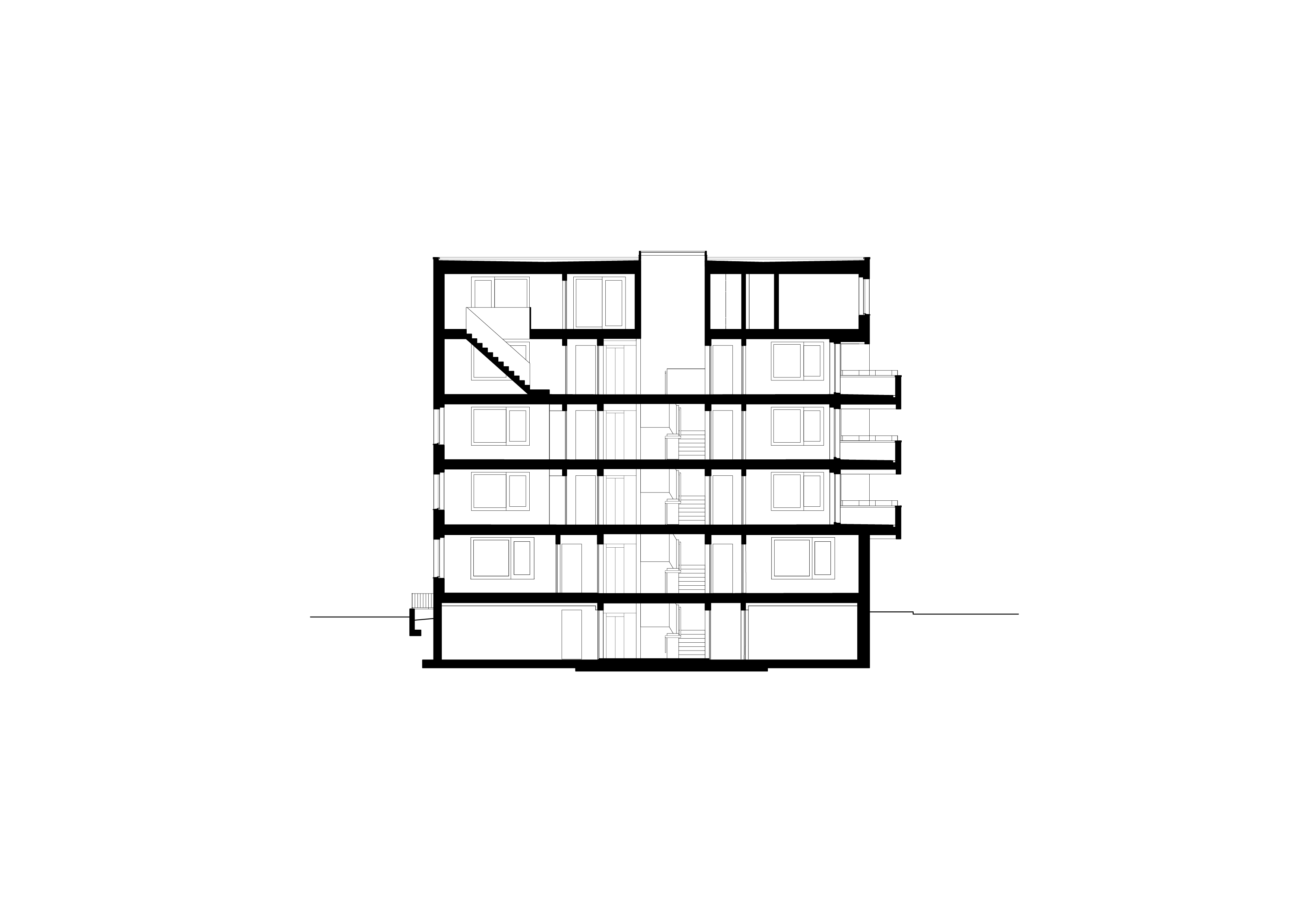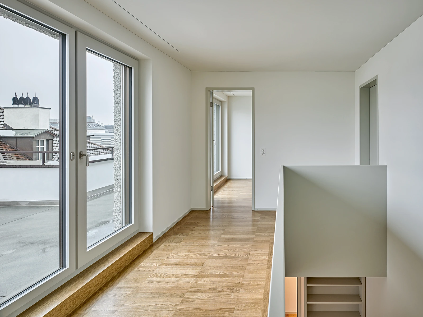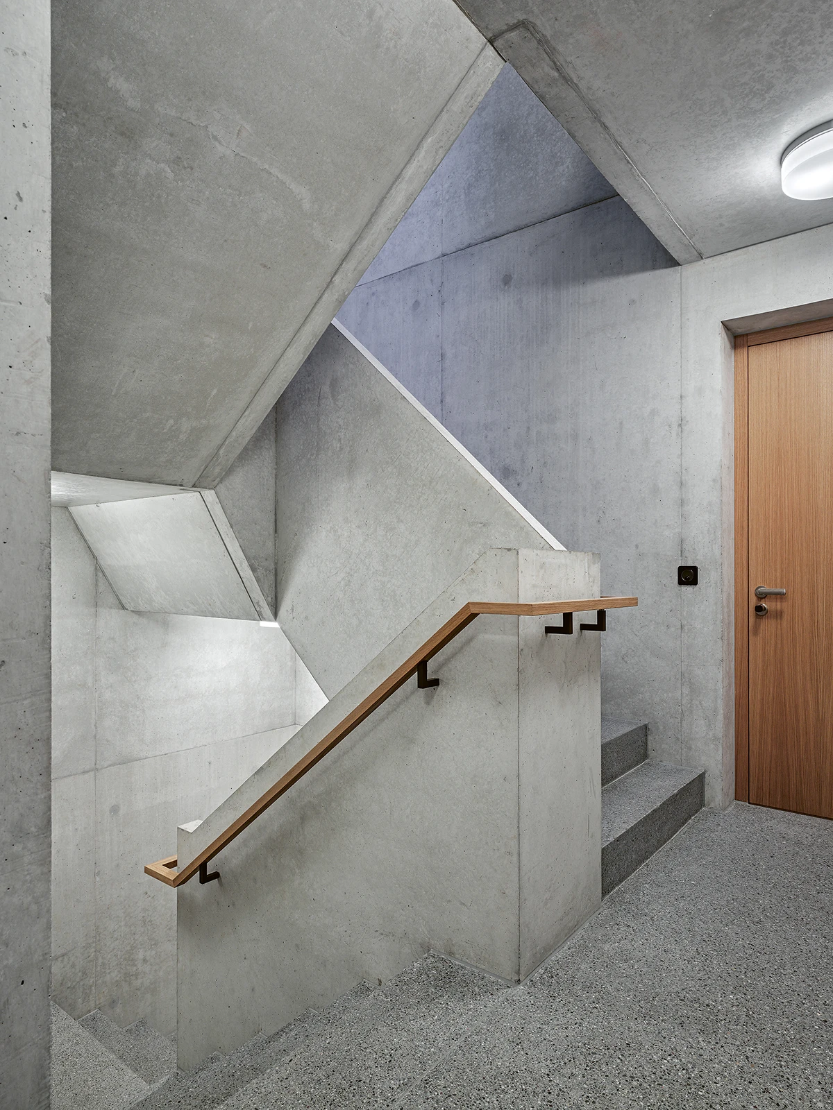 Its spatial idea emanates from within: distinct room chambers surround a centrally placed, zenithally lit concrete core. Units are accessed through a central corridor that unifies the radiating spaces. Each flat, with a more than 40 m2 living area, is illuminated from three sides. A meticulously crafted, bespoke carpenter-made kitchen is integrated into the generous room layouts. In contrast, living spaces extend outward through a large bay window or a balcony. The duplex penthouse apartments further expand into the urban landscape with extensive terraces.