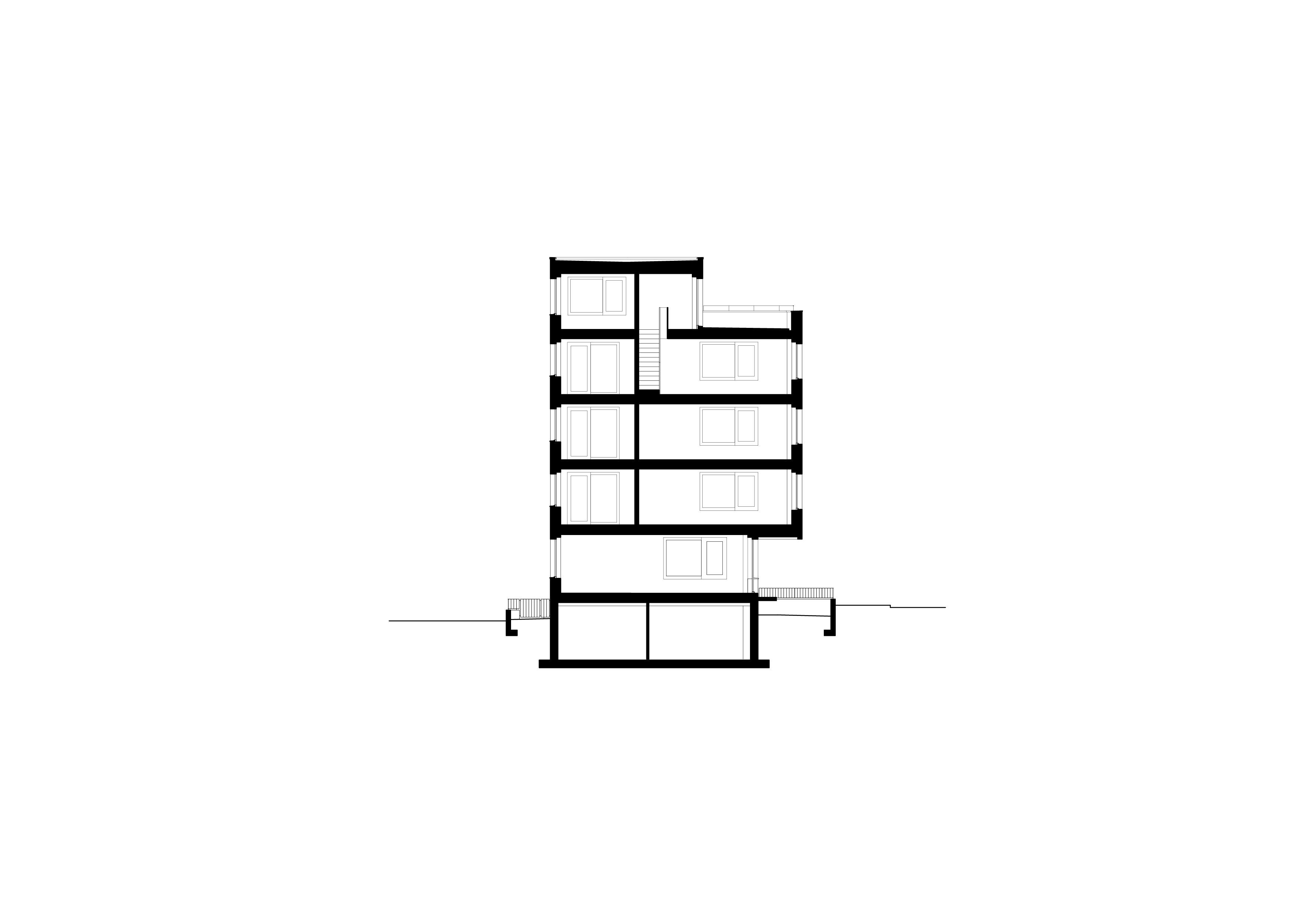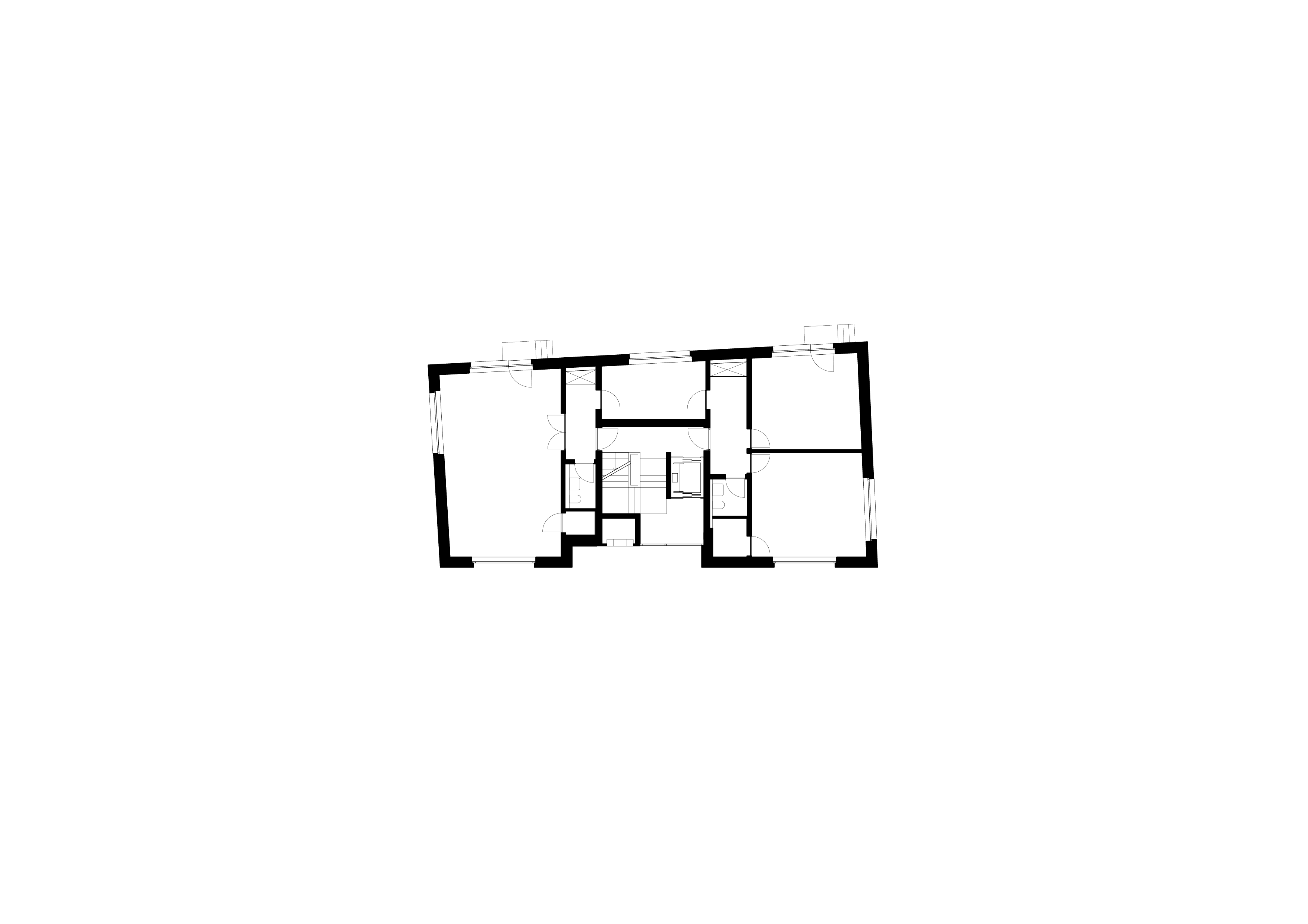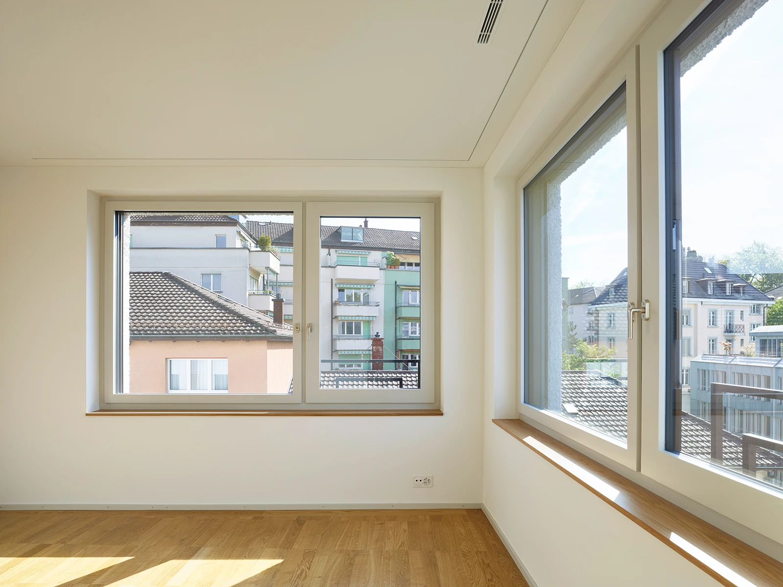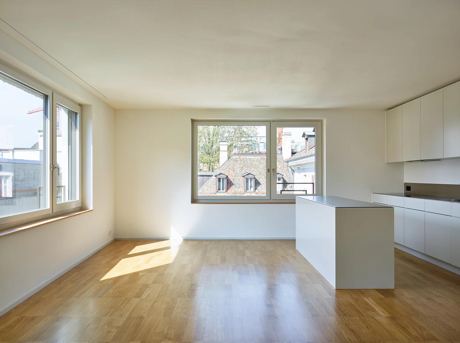 Its spatial idea emanates from within: distinct room chambers surround a centrally placed, zenithally lit concrete core. Units are accessed through a central corridor that unifies the radiating spaces. Each flat, with a more than 40 m2 living area, is illuminated from three sides. A meticulously crafted, bespoke carpenter-made kitchen is integrated into the generous room layouts. In contrast, living spaces extend outward through a large bay window or a balcony. The duplex penthouse apartments further expand into the urban landscape with extensive terraces.