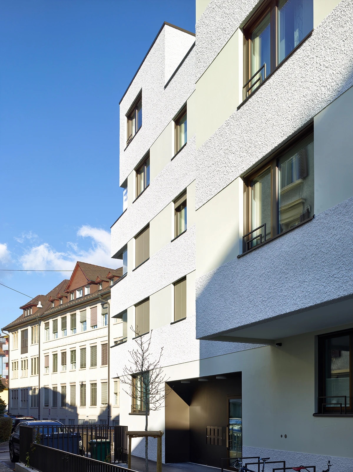 Rooms, bay windows, balconies, and attic terraces are characterized by a dynamic interior spatial arrangement, which is externally expressed and visible through subtle and nuanced plasterwork. The facade accurately articulates the building's floors between rough, self-shadowing, coarse, trowel-thrown plaster stripes and refined, smooth bands. Strictly positioned openings, originating from the interior layout, weave into a unified structure, instilling an urban expression.