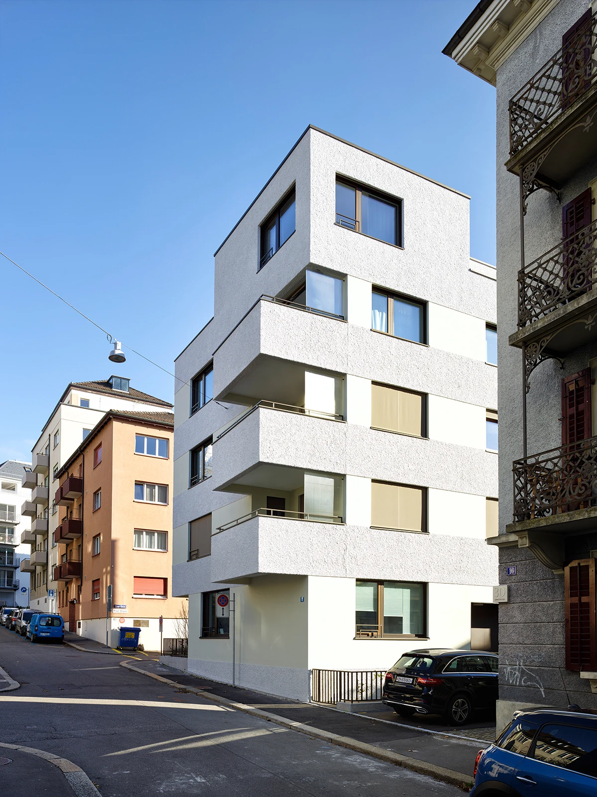 Bay windows of various sizes and rooms and balconies of this multi-family house with six apartments and an office interweave with the cityscape, pushing outwards like force vectors. The residential apartment building in Zürich’s Seefeld merges into the dense area like a hinge.