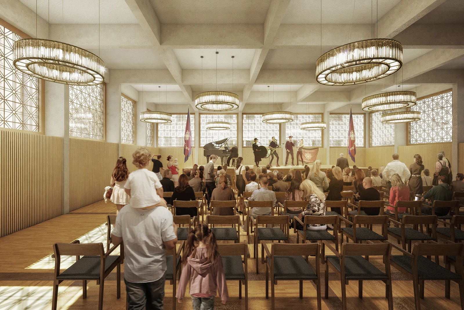 The discrete recessions from the ground floor to the fourth-floor give the building an elegant and polished form. At the same time, the two uppermost levels condense into a raised attic which seamlessly parallels the crossroads of the streets below. The structure features uniform and sheltered setbacks on the courtyard side. The structure is made of massive prefabricated concrete elements which are joined together to elicit a feeling of tectonics as well as depth. The arcades and public spaces are directly linked to the Salvation Army corps as well as a residential area. A large foyer provides a convenient access to the Salvation Army Corps and the two spaces are clearly demarcated by an intersecting staircase designed in the form of a double helix.