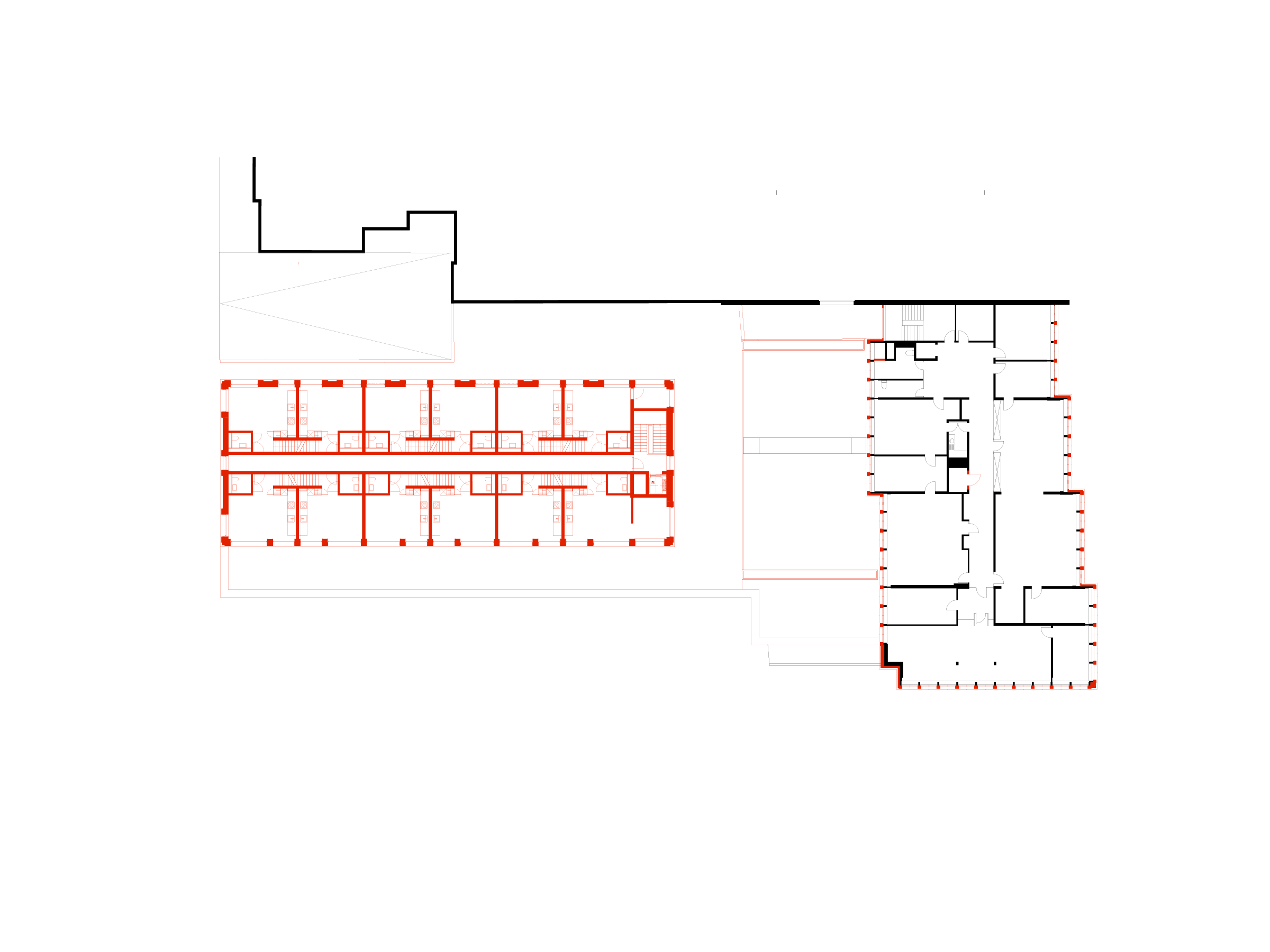 A nursery within a landscaped garden was established on the ground floor. Directly above, twelve duplex apartments with southern exposure on the first floor incorporate sizeable outdoor spaces, such as roof terraces and balconies. A sprawling garden envelops the entire site, and an underground parking lot for 30 cars is accessible via an existing ramp.