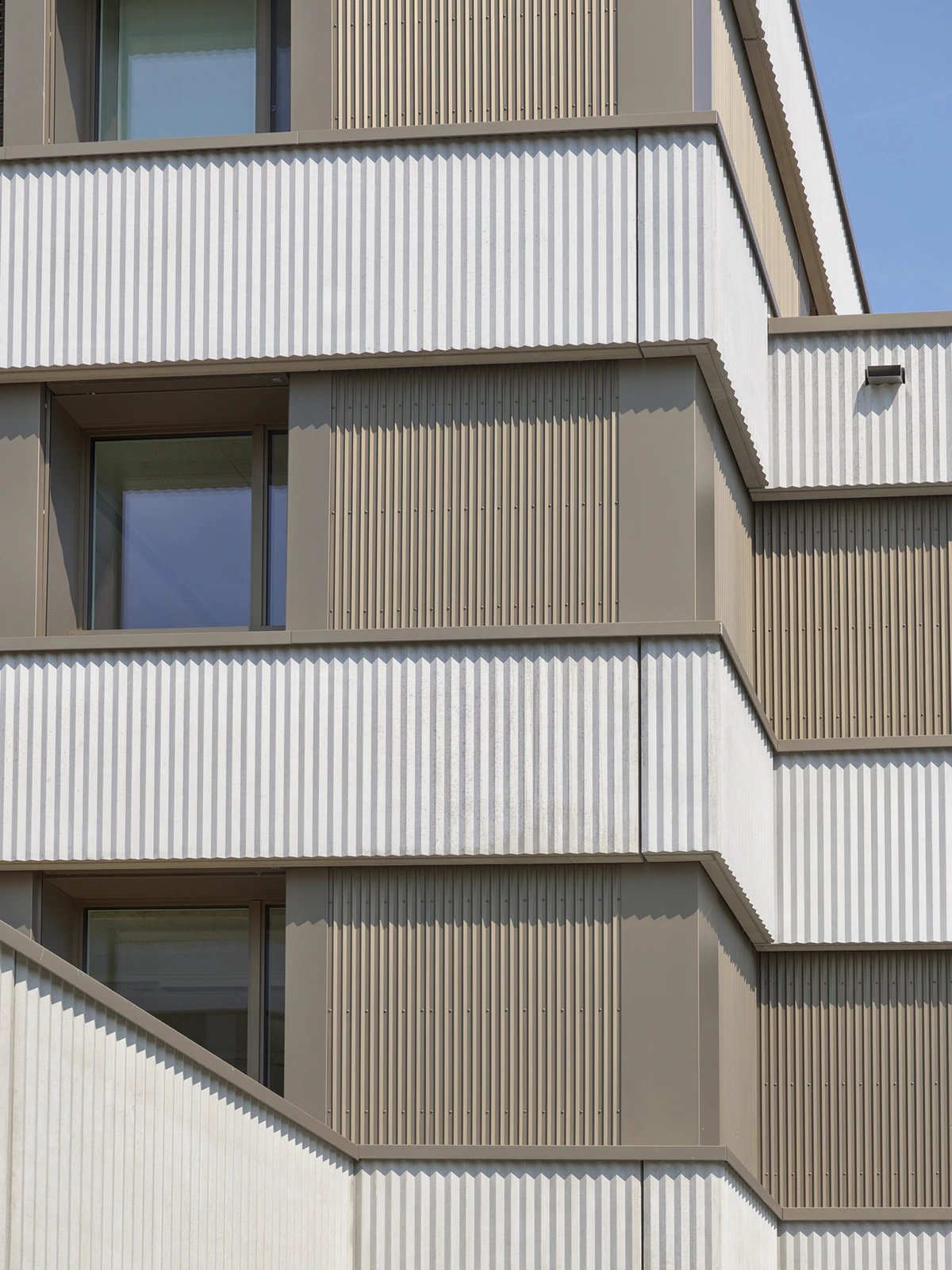 Durch eine sorgfältig strukturierte, tektonische Fassadenausbildung werden die einzelnen Baukörper optisch zusammengebunden. Gleichzeitig unterscheiden sie sich subtil in ihrem Ausdruck. Der verspieltere Neubau weist eine klare Verwandtschaft mit dem auf die Bahnhofstrasse gerichteten Geschäftshaus auf, dessen Fassadenrasterung bestehen bleibt und im Ausdruck strenger und zurückhaltender wirkt. Die Befensterung reagiert in der Abmessung auf die jeweils vorhandene räumliche Situation im Innern. Raumhohe Wohnzimmerfenster alternieren mit kleineren Befensterungen mit Brüstungen. Fassadenbänder zeichnen die Versprünge spielerisch nach. Die Fassade beider Gebäudekörper ist eine hinterlüftete, vorgehängte Konstruktion aus haptischen, metallenen und tektonisch angeordneten Platten.