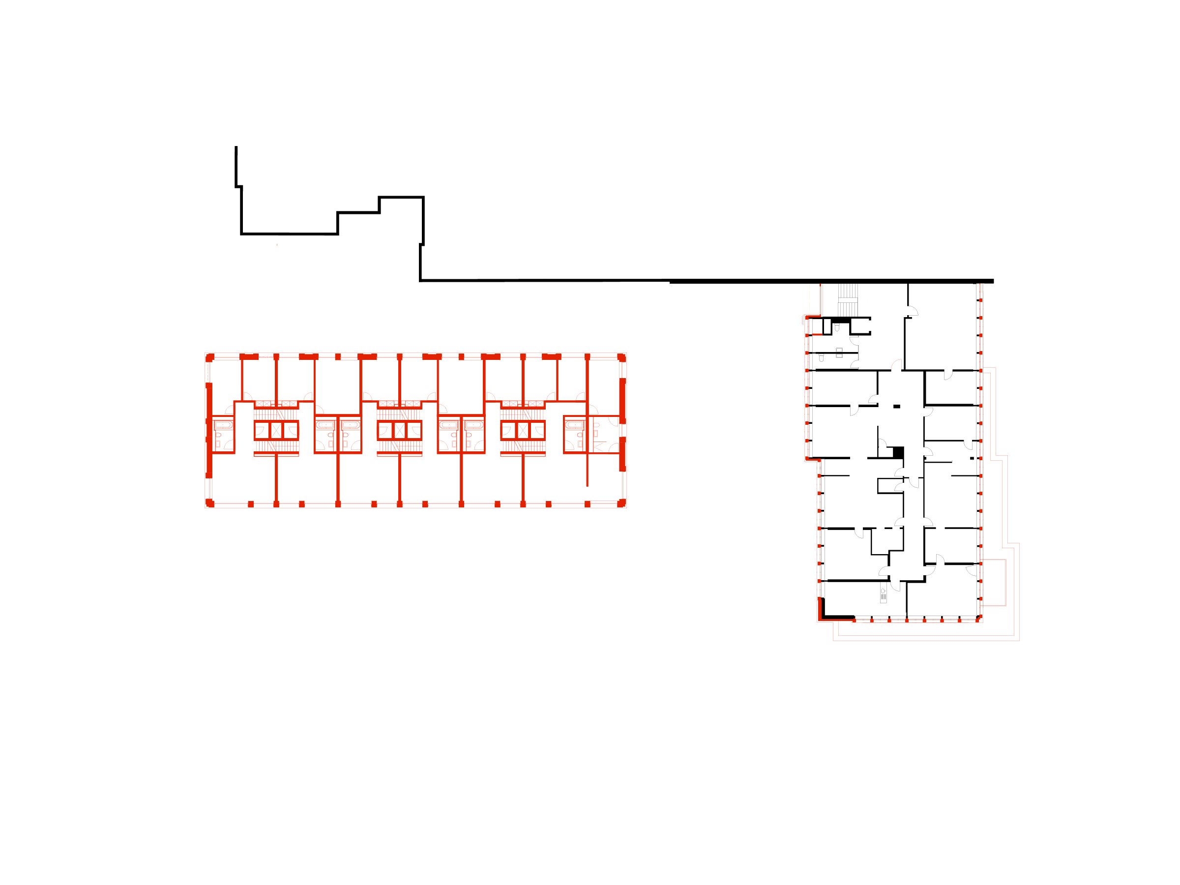 A tectonic façade design visually unifies the structures while allowing each building to retain a subtle individuality. The Bahnhofstrasse-facing commercial building preserved its original façade grid and presented a more restrained aesthetic while complementing the playful design of the new addition. Fenestration is tactically adapted to enhance the interior spatial dynamics and features wall-to-ceiling living room windows interspersed with smaller parapet-framed openings. Both structures exhibit a façade with a rear-ventilated, pre-installed system made of tactile metal panels.