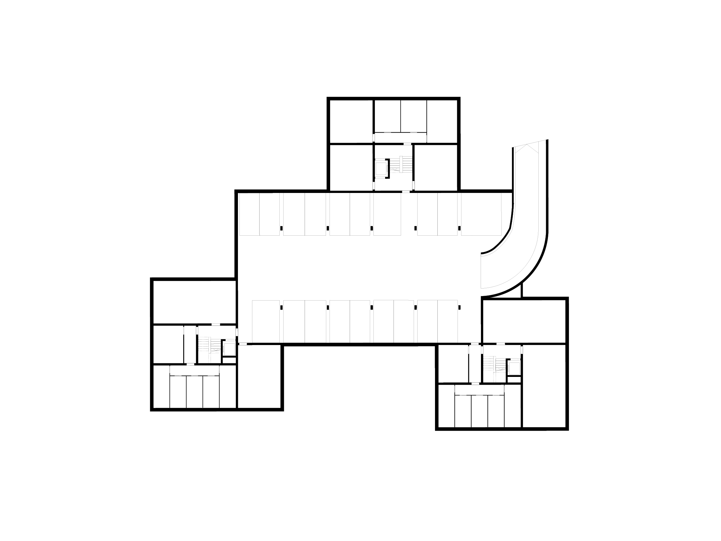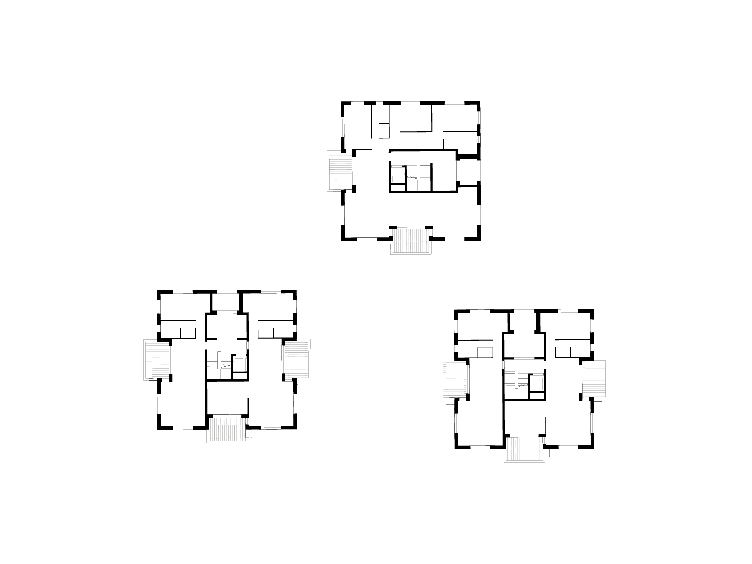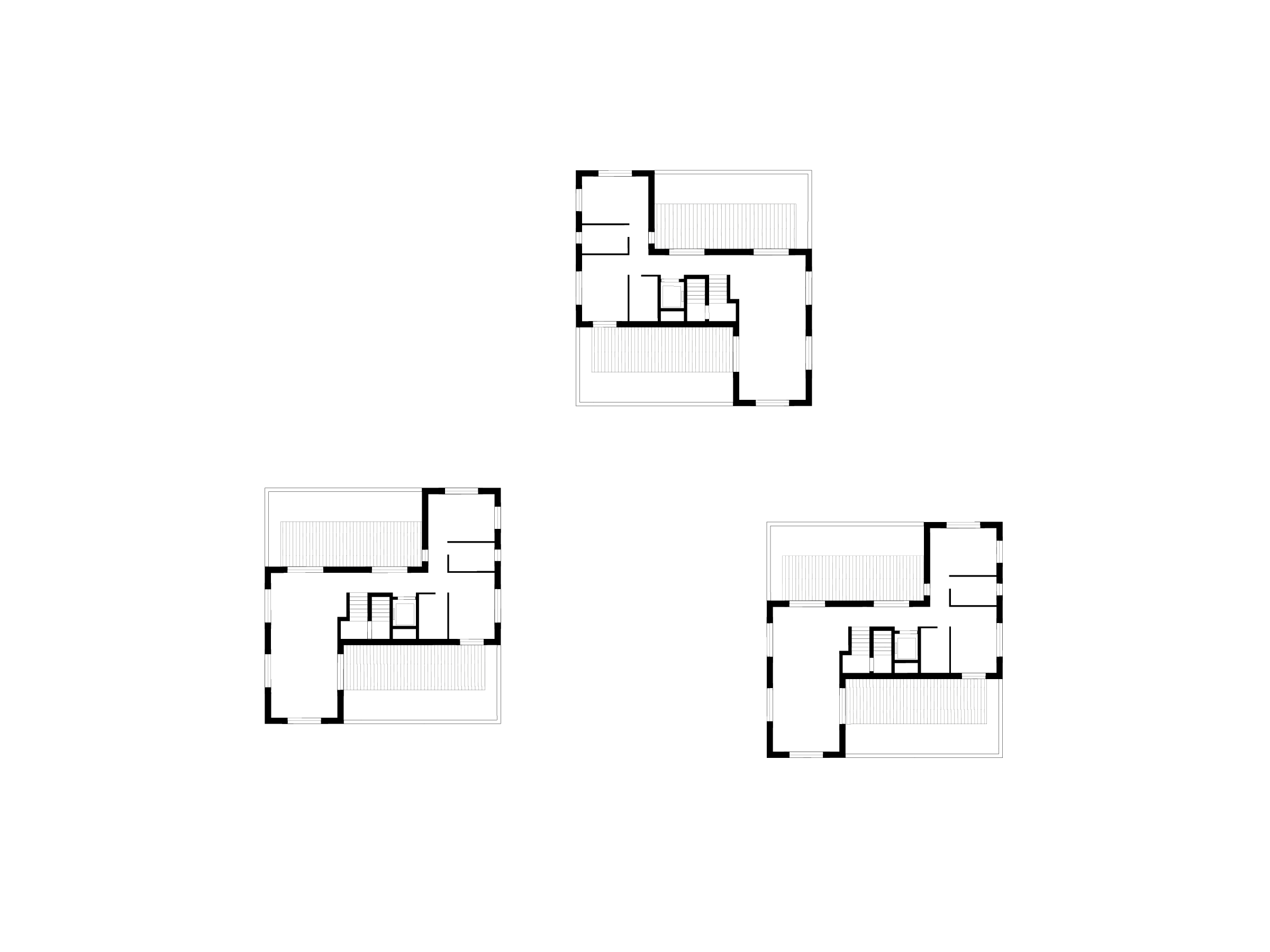 Vegetation comprises native trees, shrubs, and perennials to create a diverse green space that opens the view towards the lake. The covered exterior house entrances create generous spaces that function as vestibules, all leading into a prestigious entry hall. Every entryway is framed by the original granite slabs of the existing house. The foyers and the spacious balconies of each house are arranged in the center of their respective structures, becoming the focal point of the wooden, tectonic facade skin and directing the organization of the square floor plan. An inner staircase with a skylight serves as a nucleus, connecting all of the individual living units.