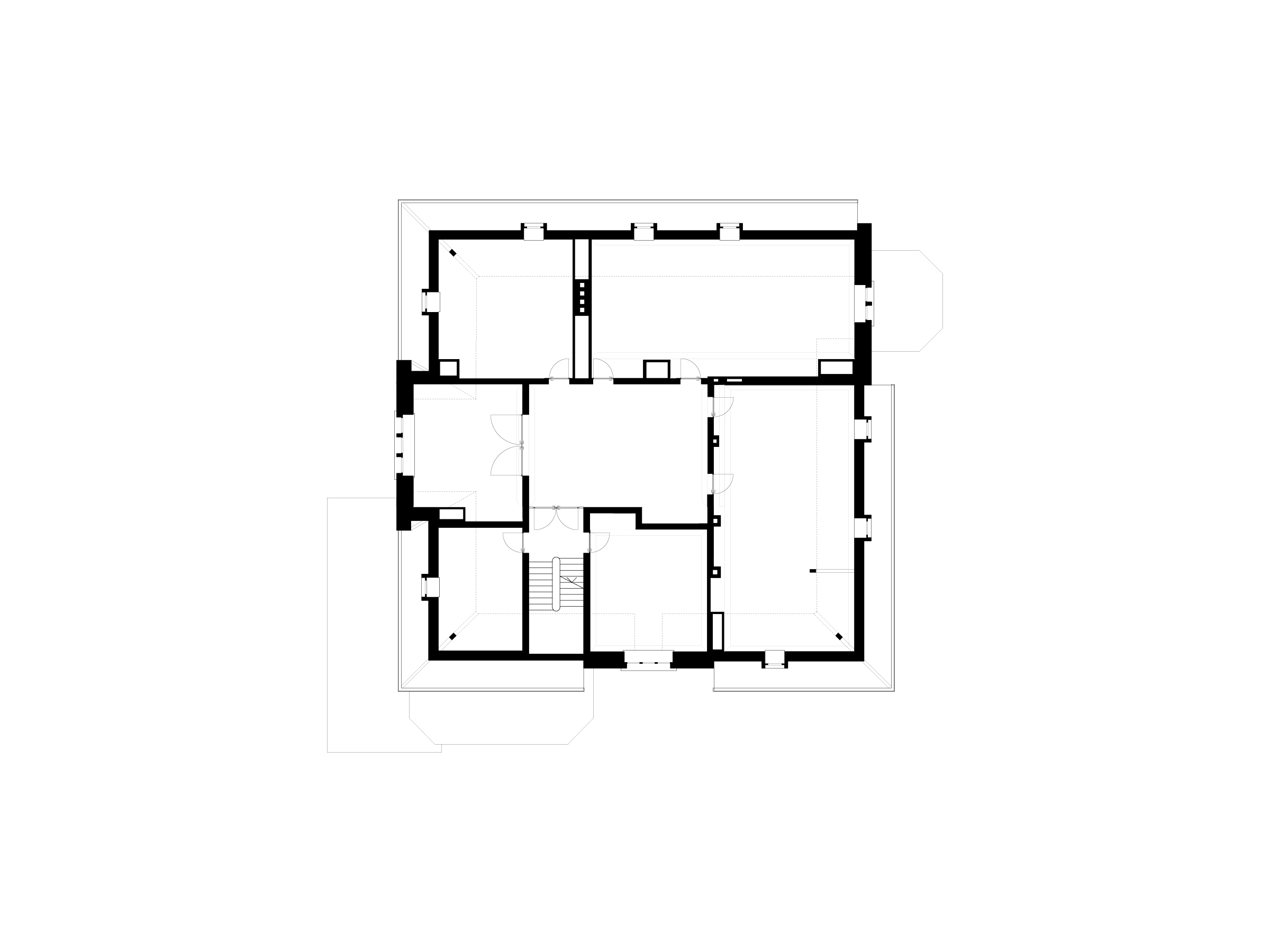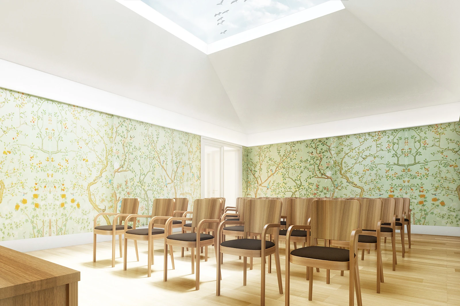 A proposed seminar room, approximately 40 m2 in size, is envisioned under the pitched roof, leveraging the existing central skylight. Working with the lack of a direct view of the surrounding park and trees on this floor, a textile wall covering is proposed to introduce a green, floral ambiance. This choice also subtly nods to the villa's original hand-painted wallpaper by Hans Sandreuter.